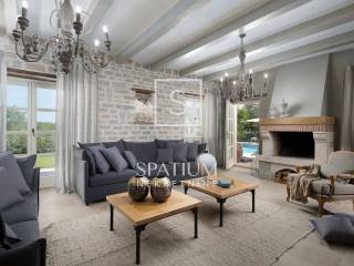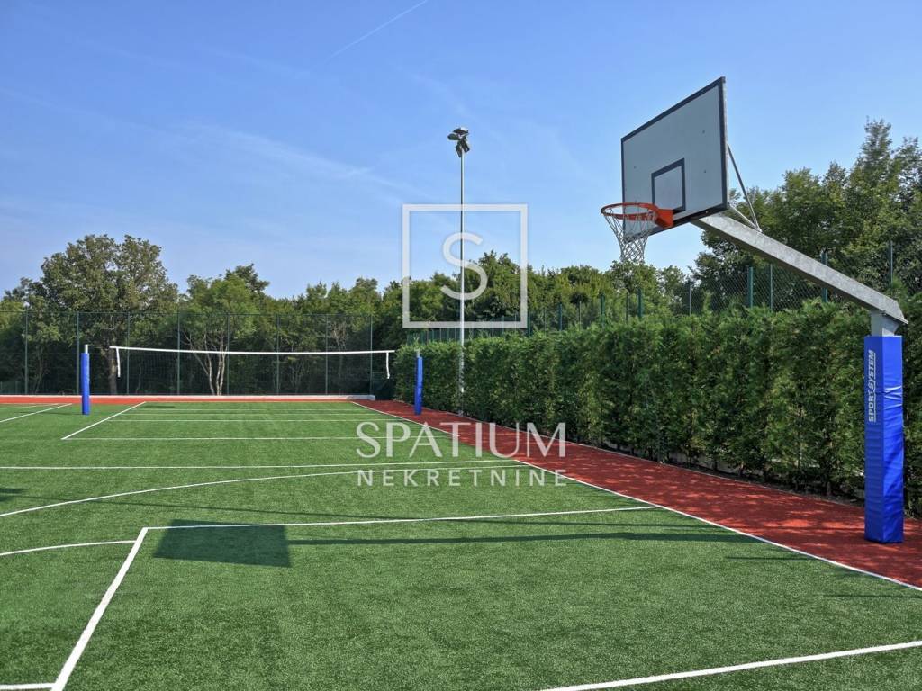 LADIĆI, KANFANAR, offers a stone villa with a swimming pool and sports fields on a spacious garden. On a plot of 880m2, living area 359m2, it consists of a ground floor and a first floor. Ground floor: large modern equipped kitchen, dining room and spacious living room with an open fireplace, bedroom with private bathroom and access to the terrace, separate toilet, from the living room there is access to a covered terrace with a fireplace for grilling and a space for socializing. First floor: three bedrooms with their own bathrooms, one of which is a master bedroom and meets lux conditions. Central heating, ground floor equipped with underfloor heating, while on the first floor designer radiators are installed, internal stairs lined with massive oak parquet, fully air-conditioned and furnished, equipped with video monitoring and alarm system. View of the sea and Rovinj in the distance. The villa is a combination of luxury and comfort, completely ready for use. There is a sports and recreation complex next to the villa, and 1/4 of the property belongs to this property. There is a grass children's playground, two bowling alleys, two tennis courts, a field for soccer, basketball, volleyball, a fitness field with outdoor equipment, all illuminated with the possibility of night use. Space for growing organic vegetables. Inside the landscaped and well-maintained garden, which is surrounded by a stone wall in order to preserve the privacy of the stay, there is a swimming pool 11.60 x 4.60m, a sunbathing area, a shower room, and a parking space for two vehicles. Rarity on the market!!