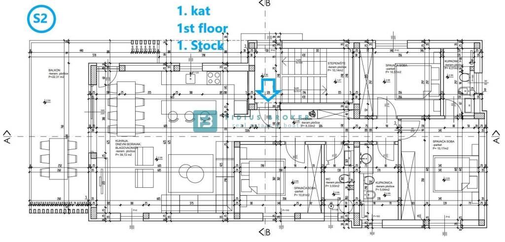 Apartment S3 is located on the 2nd floor and extends through the entire floor with a total area of ​​141.75 m2. It consists of an entrance, a hallway, three comfortable bedrooms, two bathrooms, a toilet, an open space kitchen with a dining room and a living room with access to a covered terrace. An external staircase leads to a spacious roof terrace with a total area of ​​123.03 m2, which offers a panoramic view of Vodice and the sea. The apartment has two parking spaces. The price is €708,750.