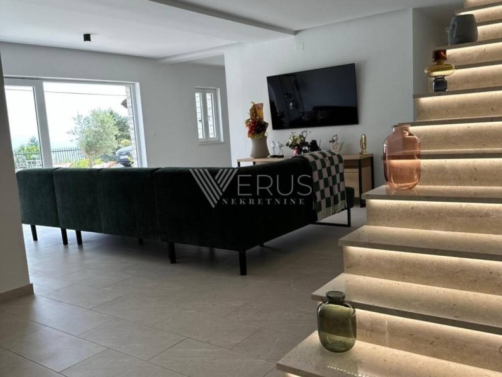 We offer an exceptional villa of 328 m², located in a quiet and green part of Poljan, just a few minutes' drive from the first beaches and 2.5 km from the sea. It is a well-built and carefully equipped property that stands out for its luxurious garden of 870 m², heated swimming pool, and a series of facilities that provide top comfort and complete peace.