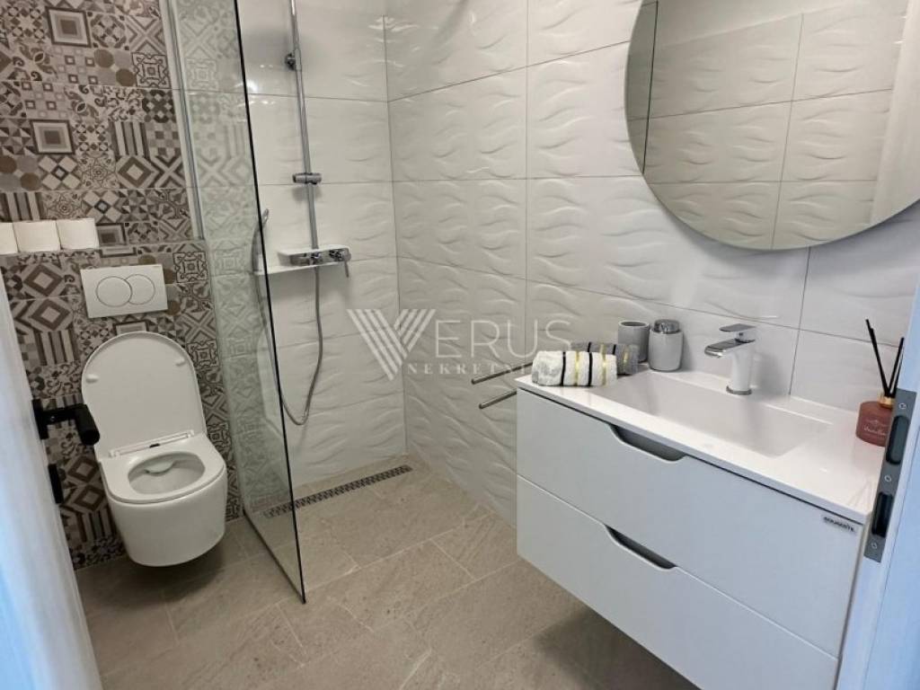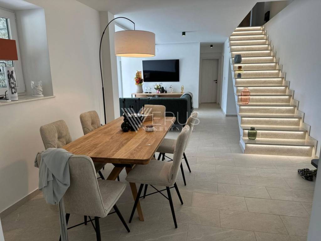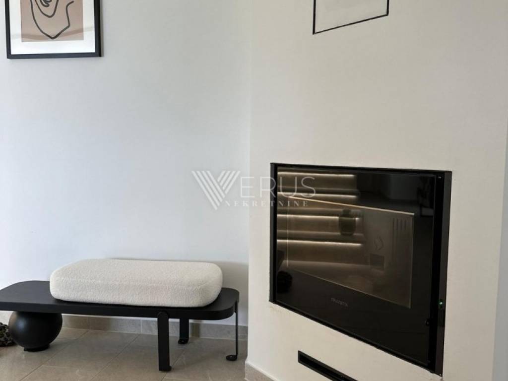The villa is distributed on two floors, and already upon entering the ground floor, you will be greeted by a spacious open-space living room filled with natural light. The living room and dining room are connected to a modern kitchen, from which you can access a large covered terrace of 42 m², ideal for summer gatherings and relaxation. On the ground floor there is also one bedroom with its own bathroom and a guest toilet, while in the garden there is a beautifully decorated area with an outdoor wood-burning fireplace.