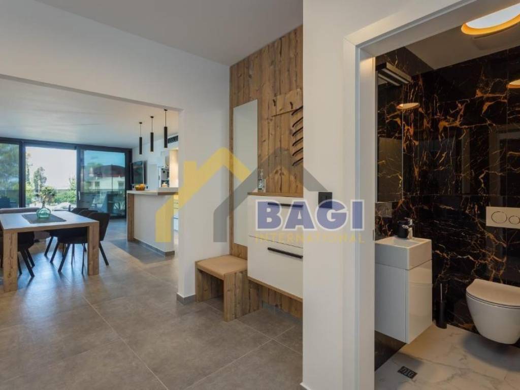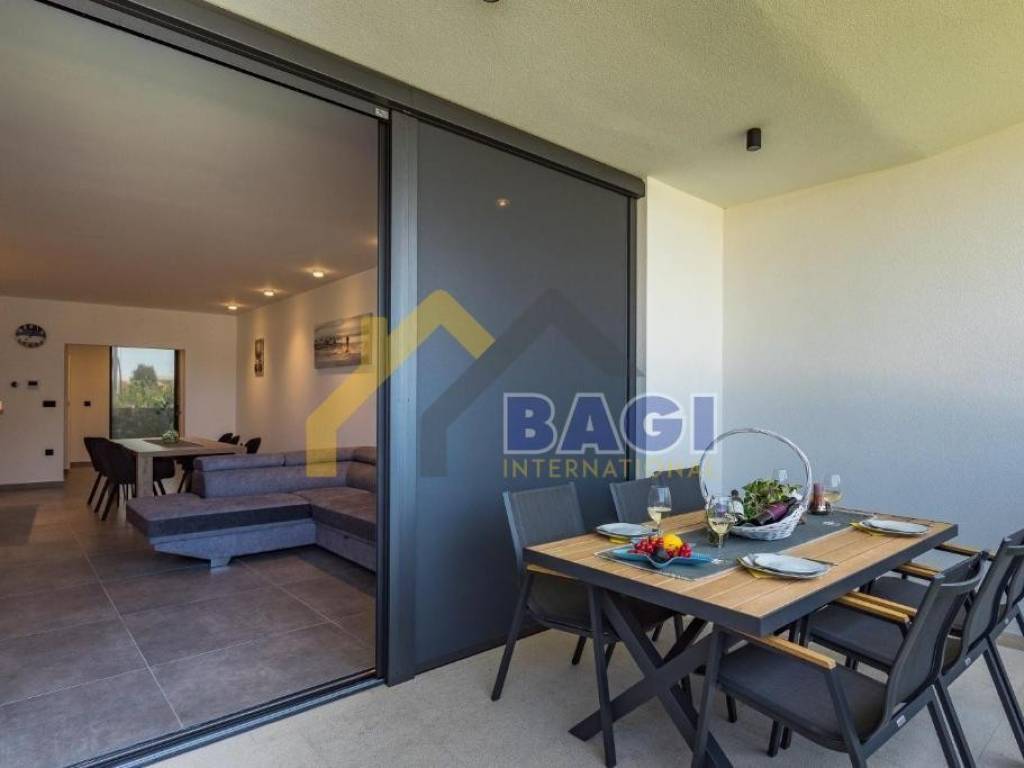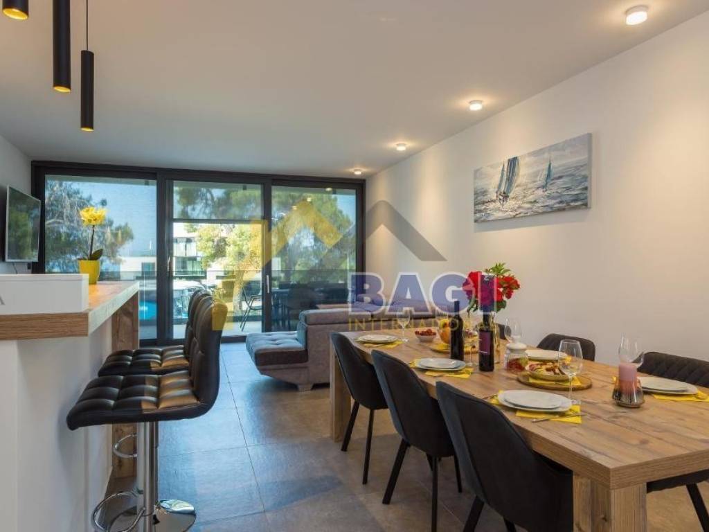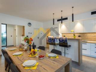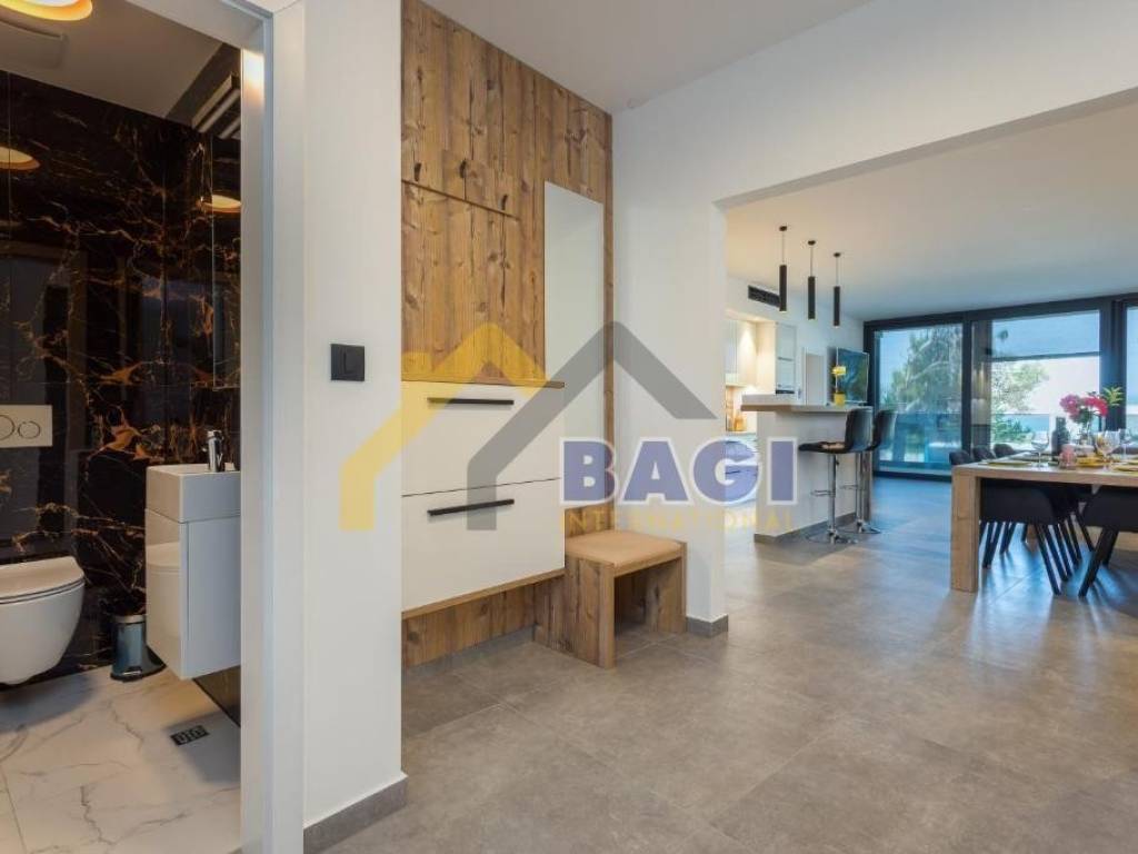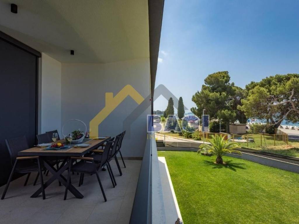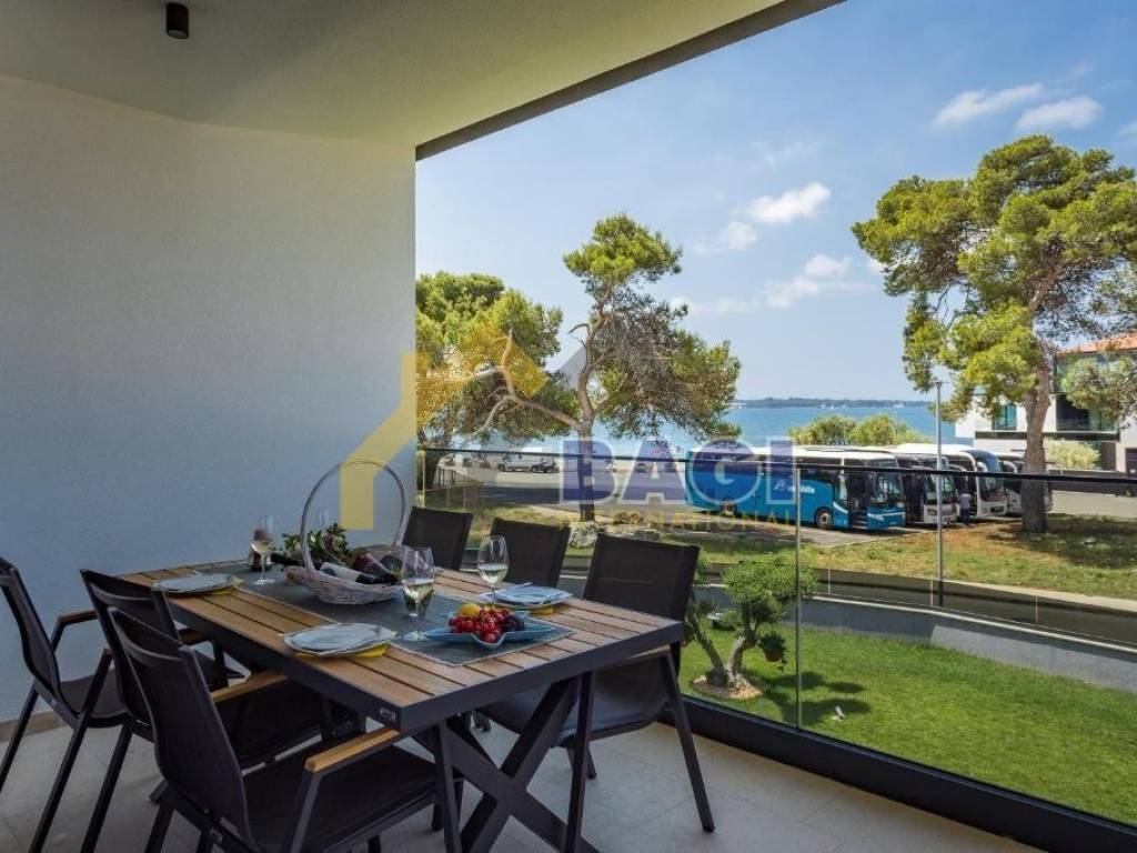 In Fazana in the first row to the sea, we sell a beautiful apartment of 120m2 with large living room with kitchen and dining room with access to a large covered terrace overlooking the sea and beach, 2 bedrooms, each with its own bathroom + separate toilet. From the bedroom exit to the large terrace. From the other room exit to the small terrace. The apartments have underfloor heating and built-in central air conditioning. Powered by a heat pump. The apartment is completely modernly furnished with high quality furniture and is ready to move in immediately. Parking by the accommodation facility, paved, fenced. From the building to the pebble beach and promenade is only 80 meters.