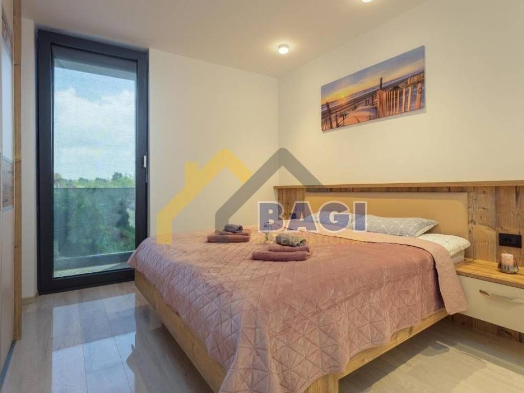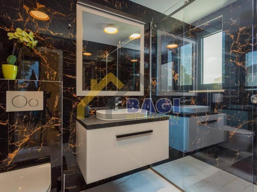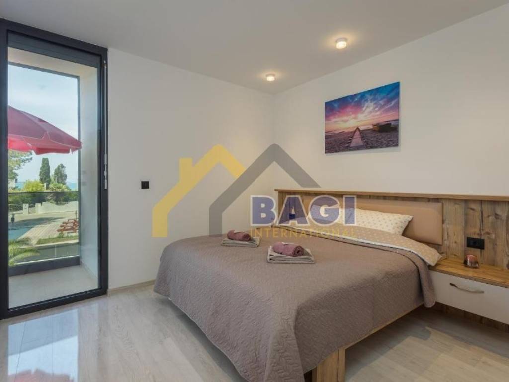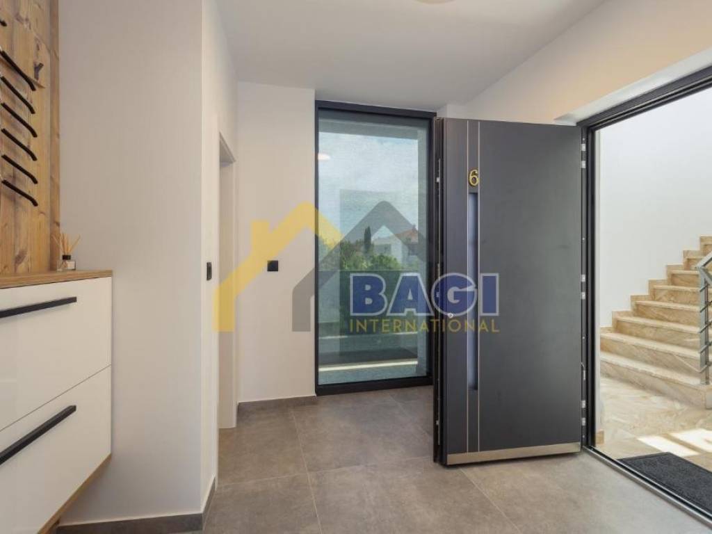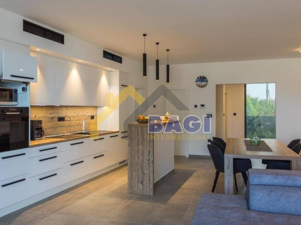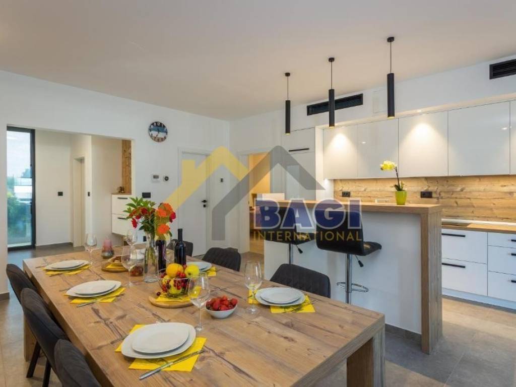 In Fazana in the first row to the sea, we sell a beautiful apartment of 120m2 with large living room with kitchen and dining room with access to a large covered terrace overlooking the sea and beach, 2 bedrooms, each with its own bathroom + separate toilet. From the bedroom exit to the large terrace. From the other room exit to the small terrace. The apartments have underfloor heating and built-in central air conditioning. Powered by a heat pump. The apartment is completely modernly furnished with high quality furniture and is ready to move in immediately. Parking by the accommodation facility, paved, fenced. From the building to the pebble beach and promenade is only 80 meters.