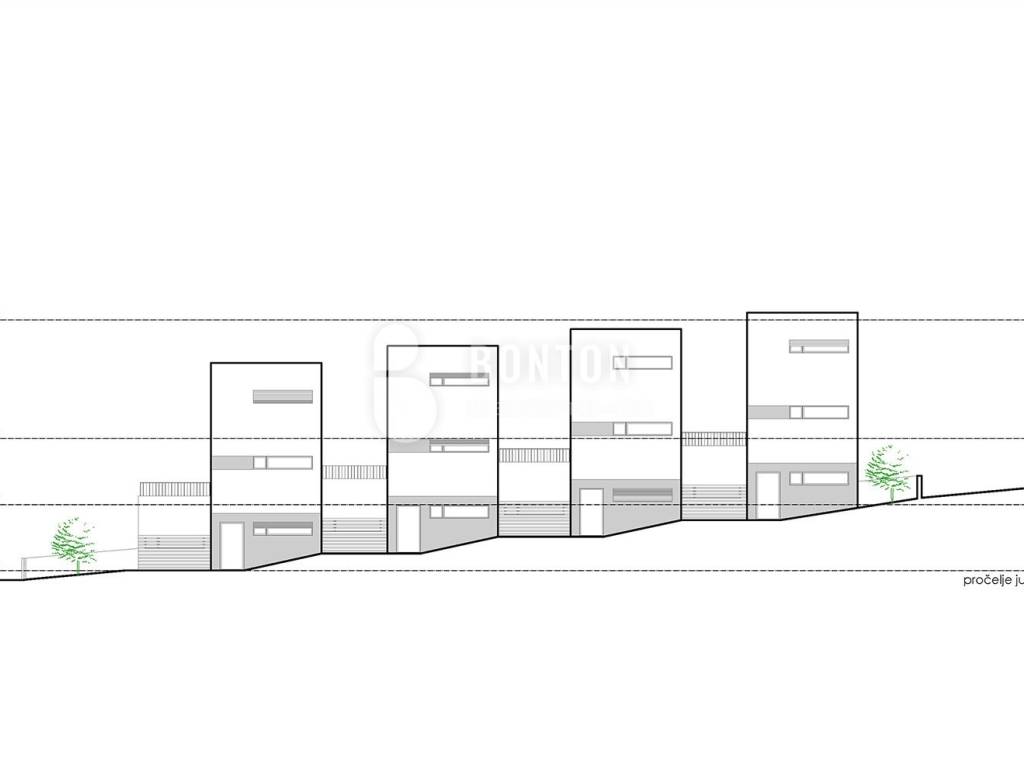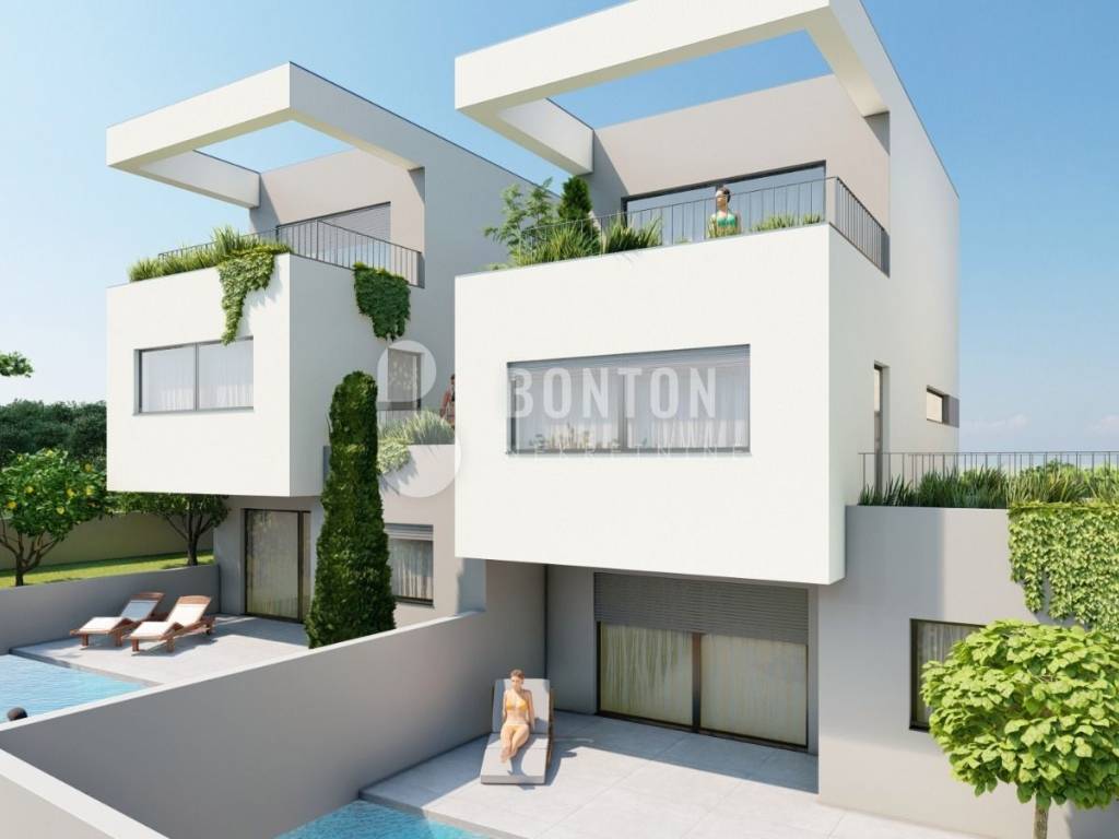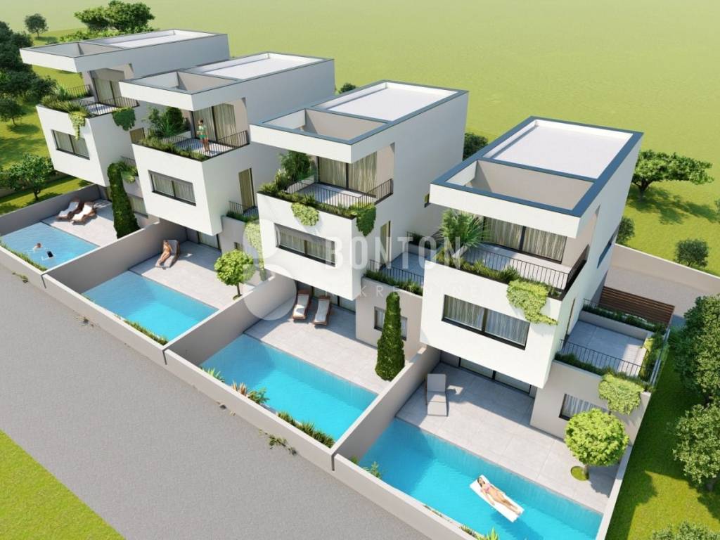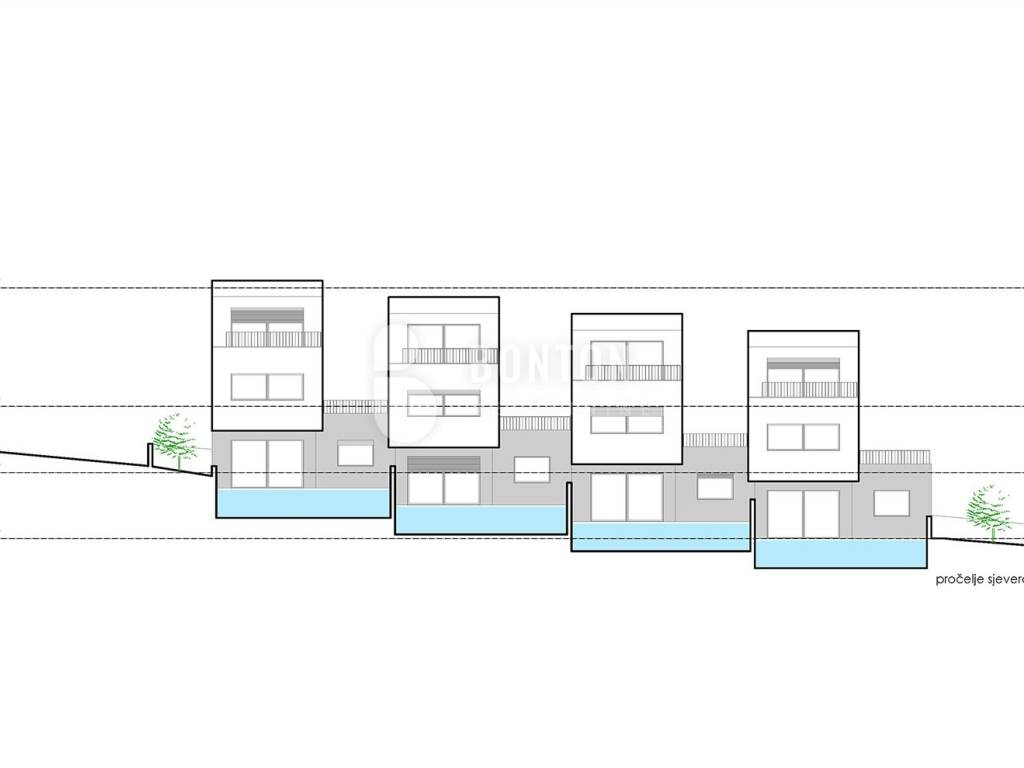 Genehmigung für vier Wohneinheiten mit Swimmingpool. Die Häuser haben eine Größe von 100 m² + Garten und einen integrierten Swimmingpool. Sofortiger Vertragsabschluss mit dem Bauträger möglich.