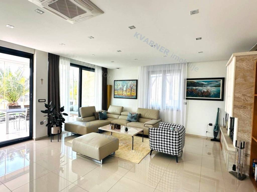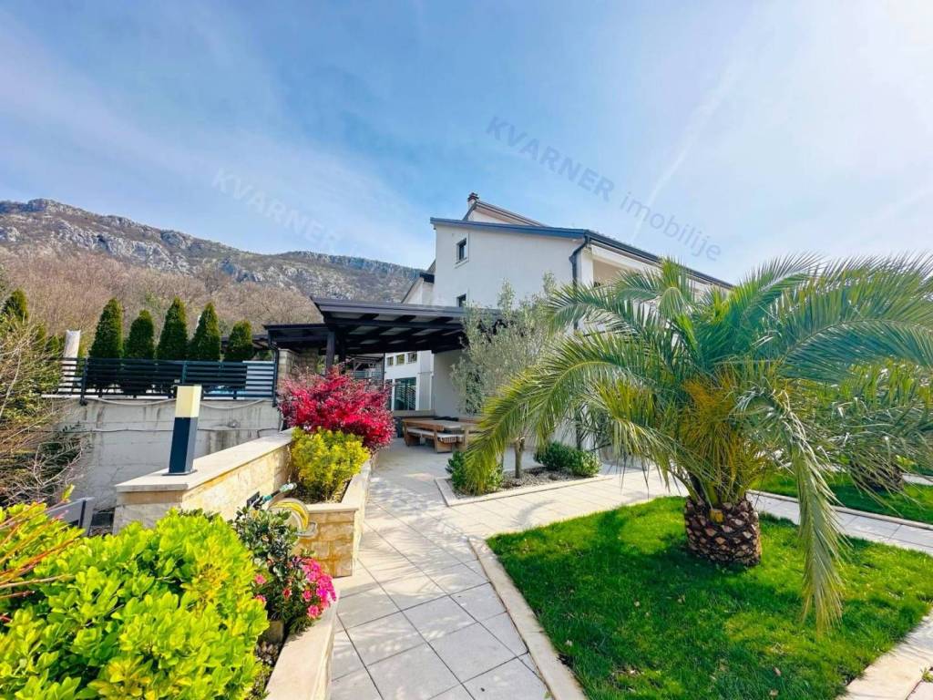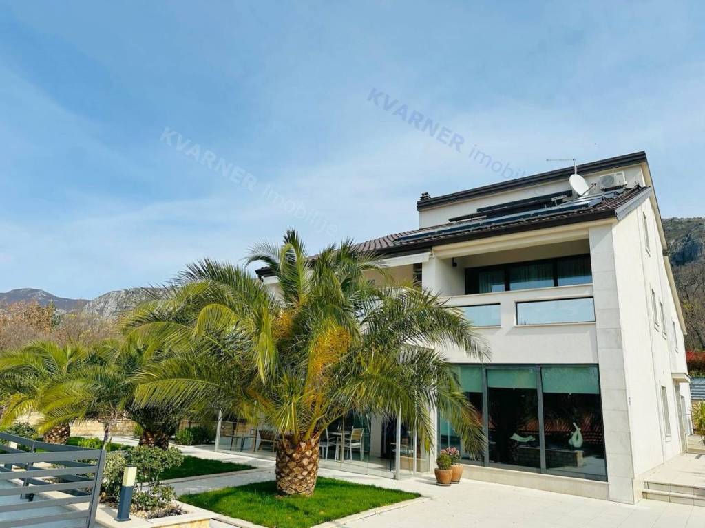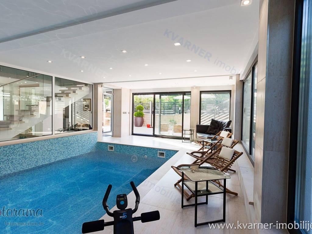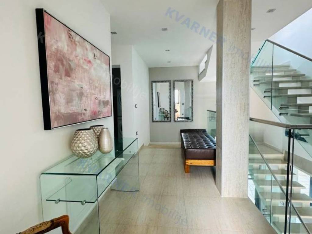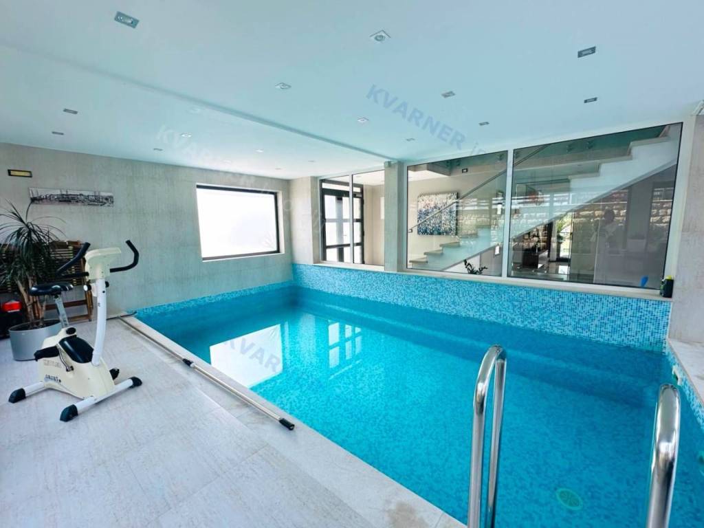 Just 3 km away from the sea and the center of Crikvenica, a detached family villa of exceptional construction quality and interior and exterior design is for sale. Within a fully fenced and landscaped property, there is an outdoor pool, a gathering area with a barbecue, and parking for up to ten cars. The ground floor is designed as a living space, with a slight elevation featuring two steps leading from the spacious dining area and kitchen. The living spaces open onto a paved courtyard, while inside the house, on the northern side, there is an indoor pool with a sauna. On the first floor, there are three bedrooms, each with its own bathroom, as well as a sauna and a bathroom. On the top floor, there is a one-bedroom apartment with a large terrace.