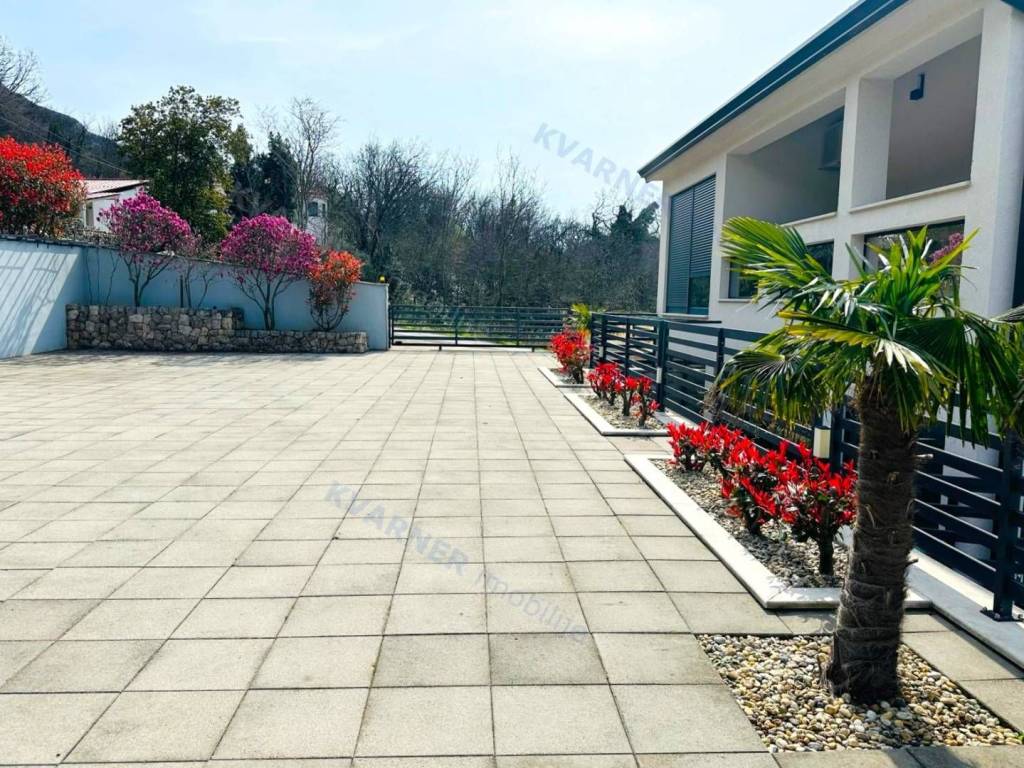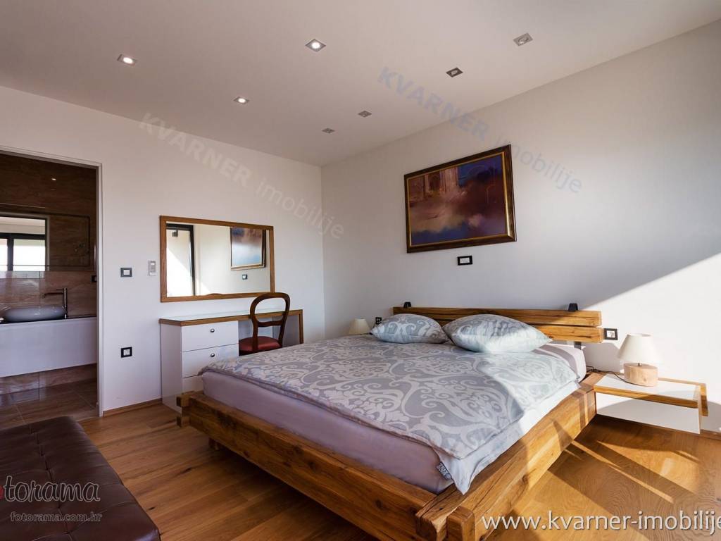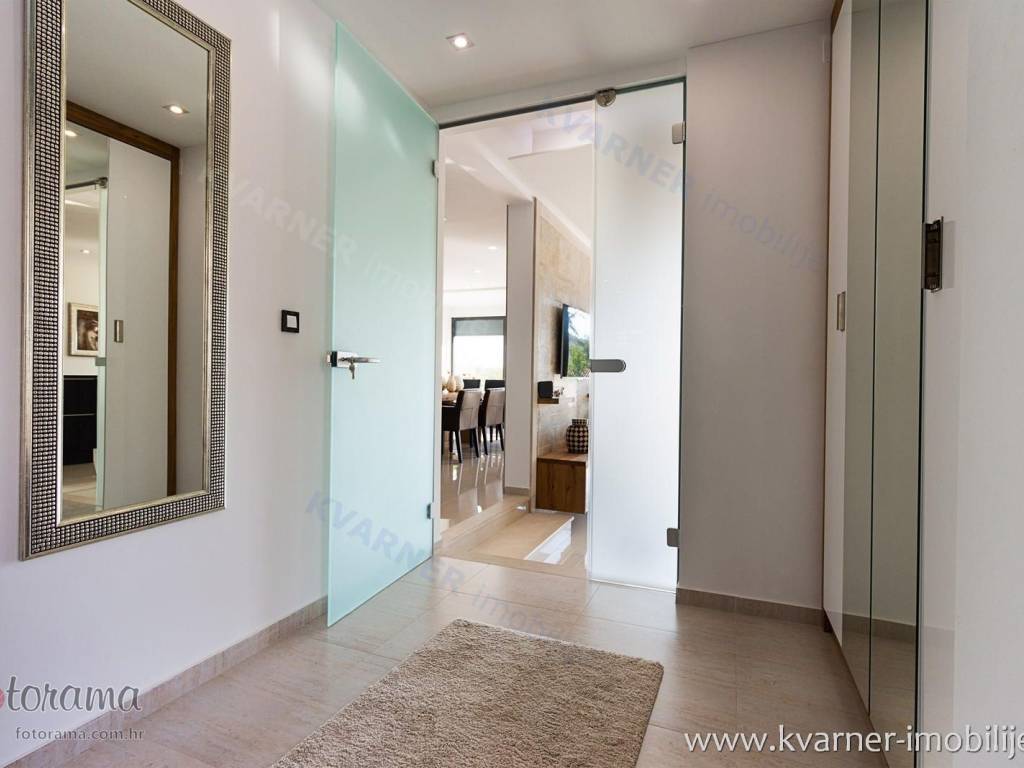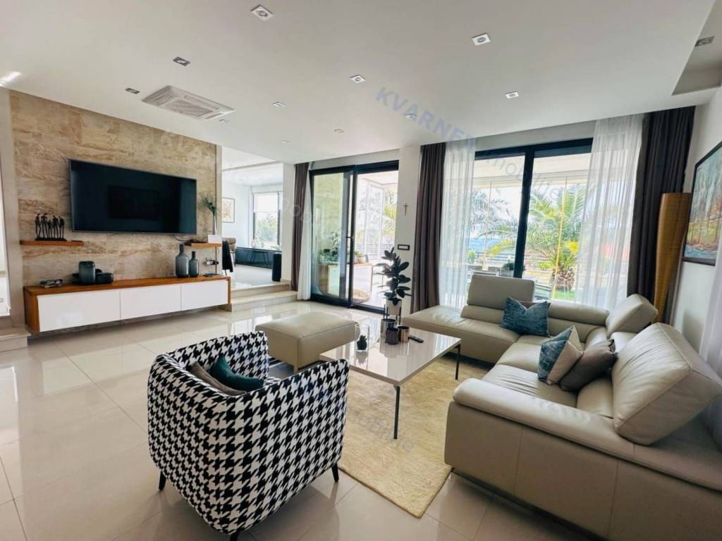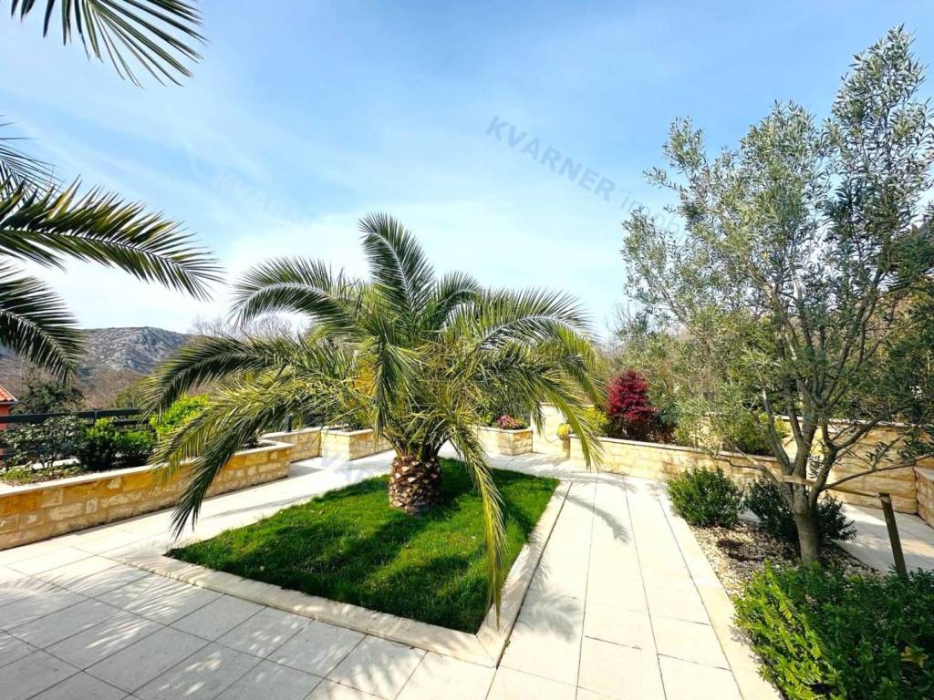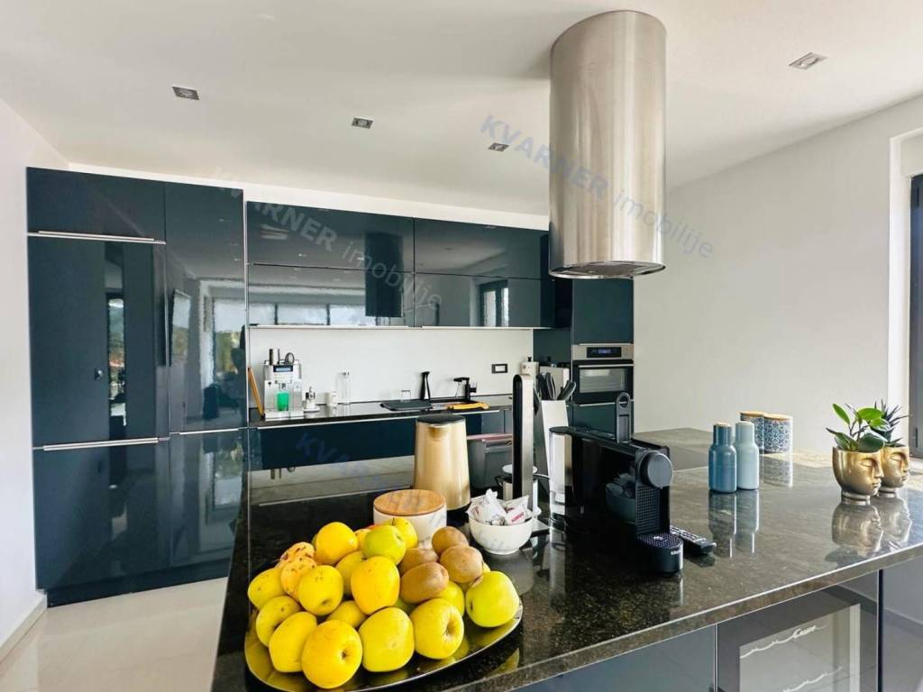 Just 3 km away from the sea and the center of Crikvenica, a detached family villa of exceptional construction quality and interior and exterior design is for sale. Within a fully fenced and landscaped property, there is an outdoor pool, a gathering area with a barbecue, and parking for up to ten cars. The ground floor is designed as a living space, with a slight elevation featuring two steps leading from the spacious dining area and kitchen. The living spaces open onto a paved courtyard, while inside the house, on the northern side, there is an indoor pool with a sauna. On the first floor, there are three bedrooms, each with its own bathroom, as well as a sauna and a bathroom. On the top floor, there is a one-bedroom apartment with a large terrace.