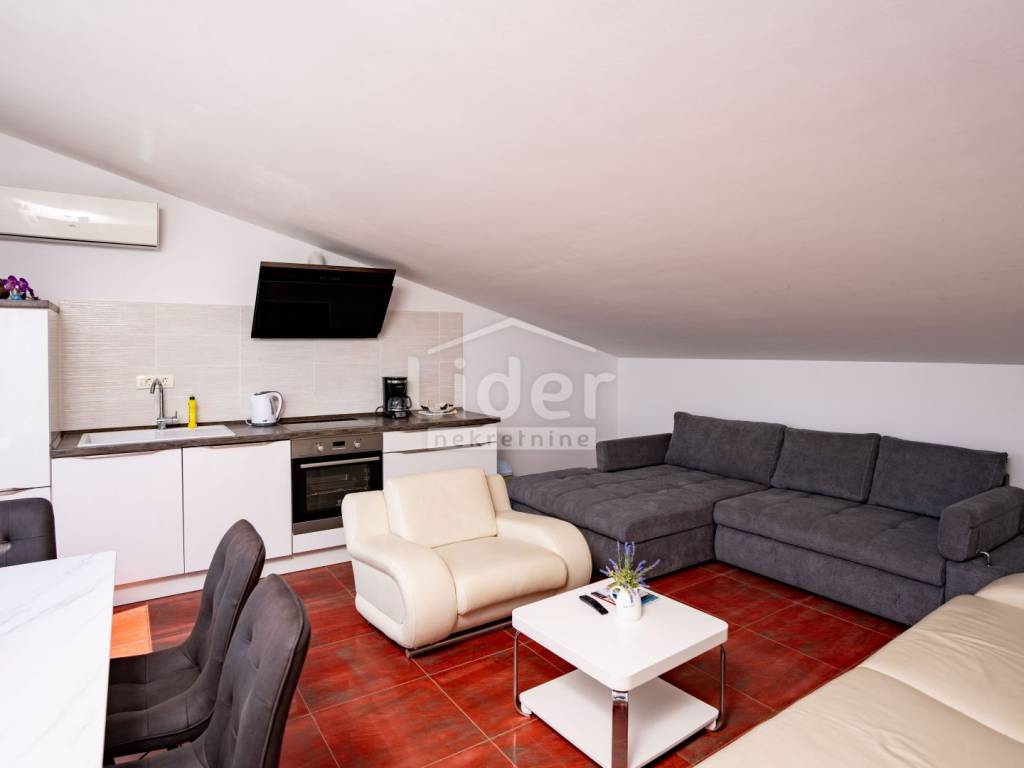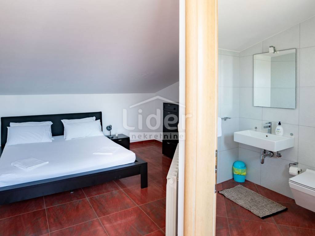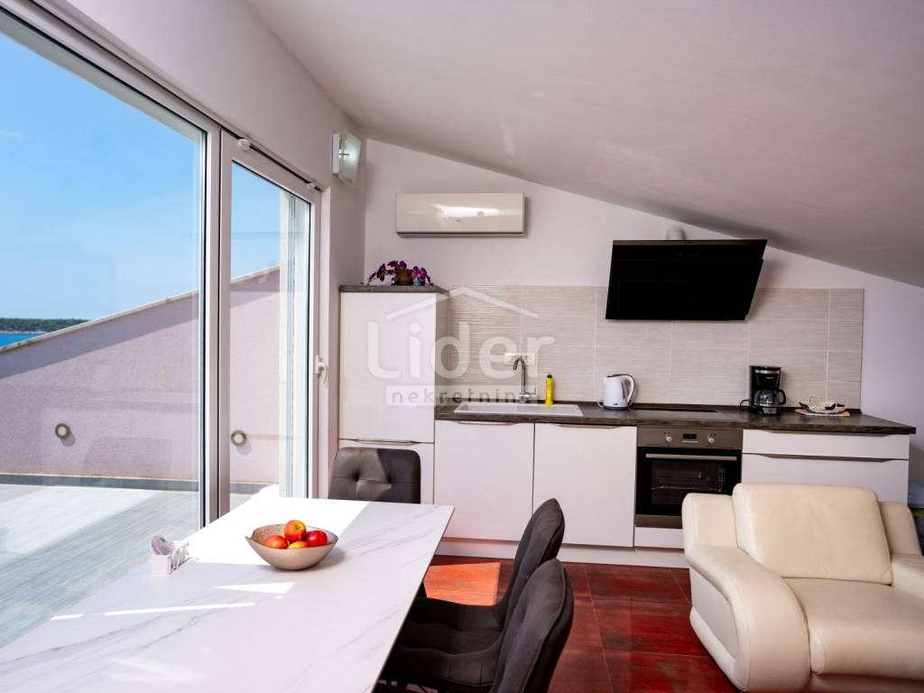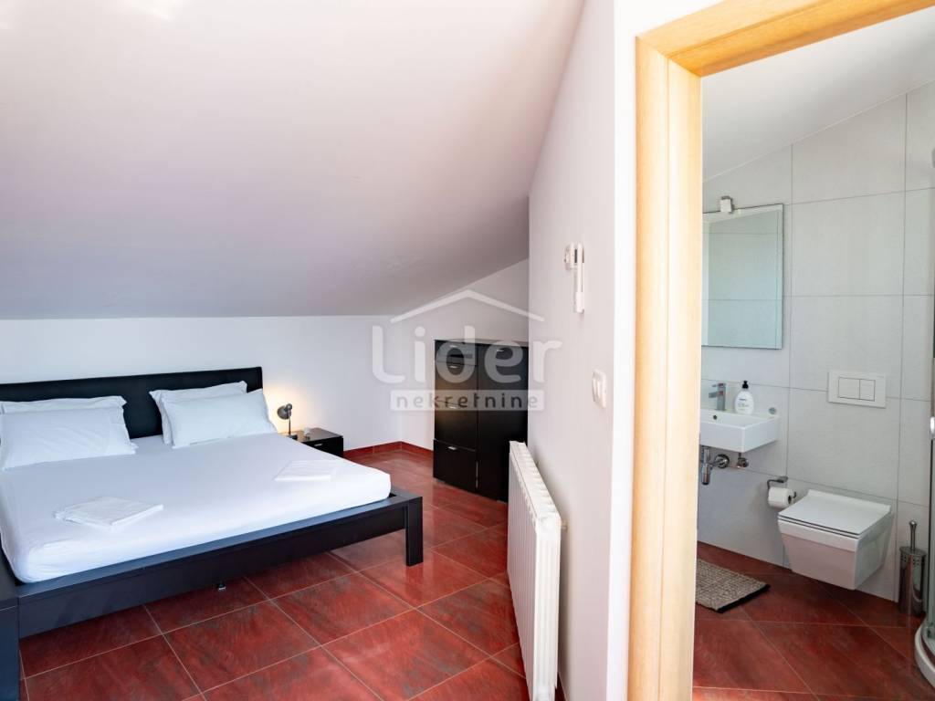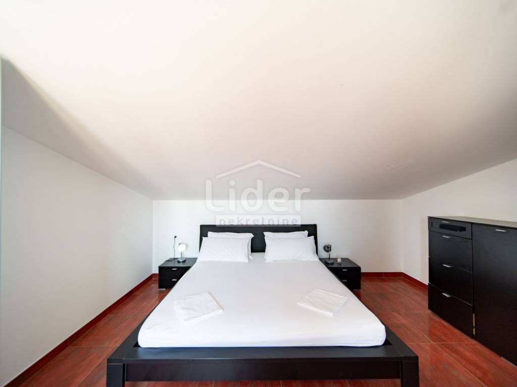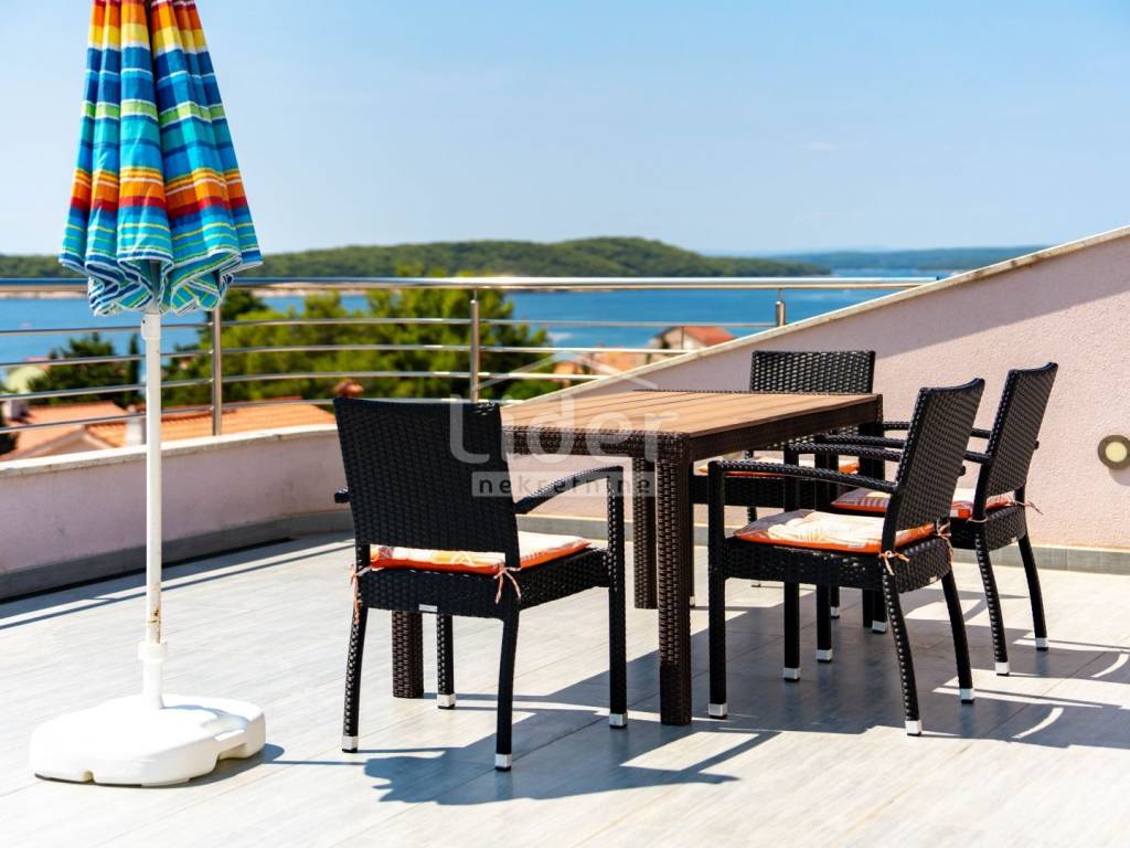 A two-story apartment for sale in Barbat on Rab. It is located on the second floor and in the attic. On the second floor there are two bedrooms, two bathrooms and a kitchen, dining room and living room. There are also two balconies with a wonderful view of the sea. In the attic there is another one-bedroom apartment with a huge terrace of about 60 m2. This terrace has a beautiful view of the sea and offers other outdoor opportunities. There The apartment is sold fully furnished with quality Italian furniture. It also has a small garden in the yard and a parking space. The apartment is located 200 meters from the beach and 5 km from the town of Rab. The building has three apartments.