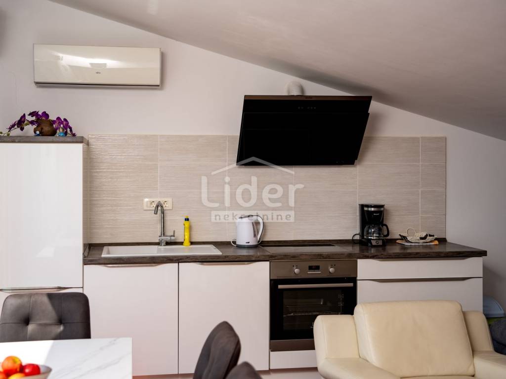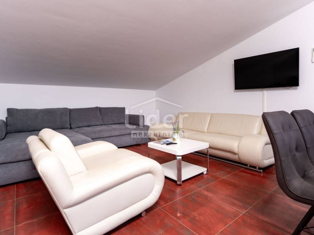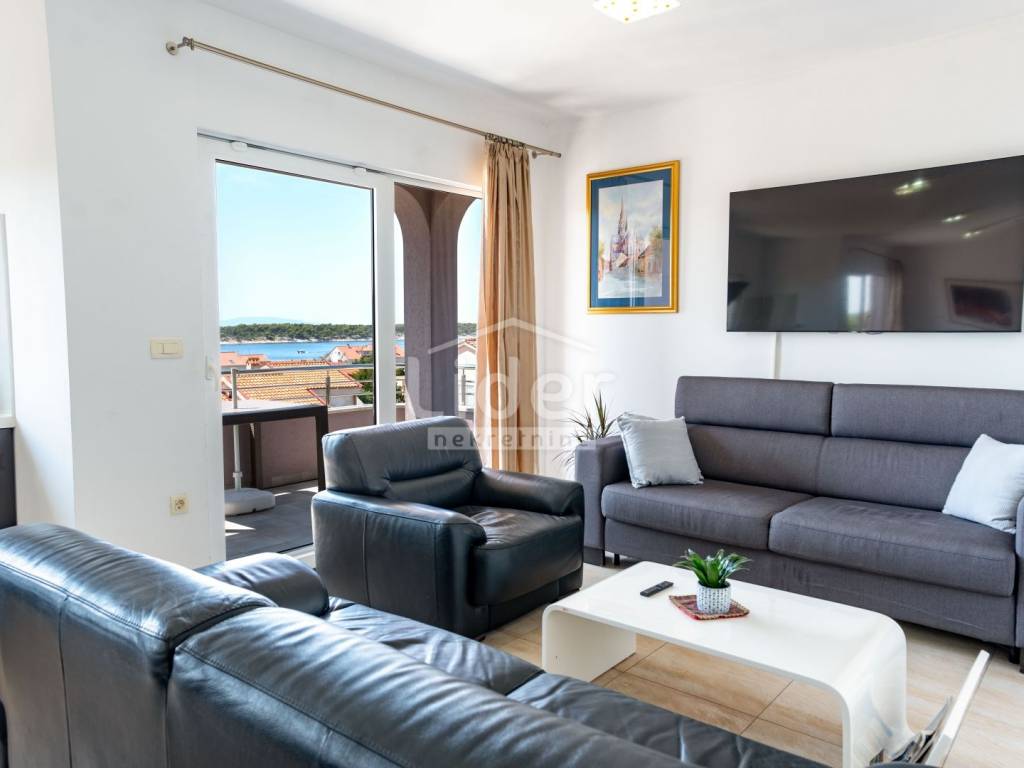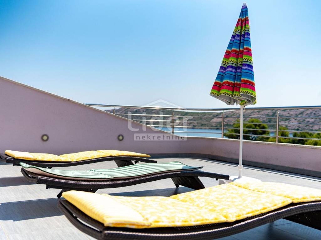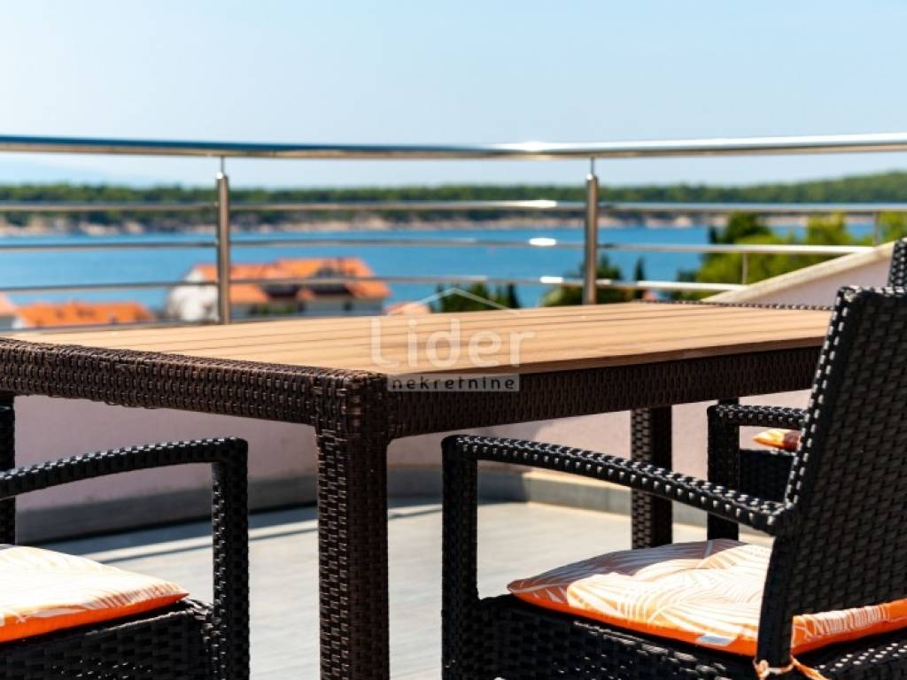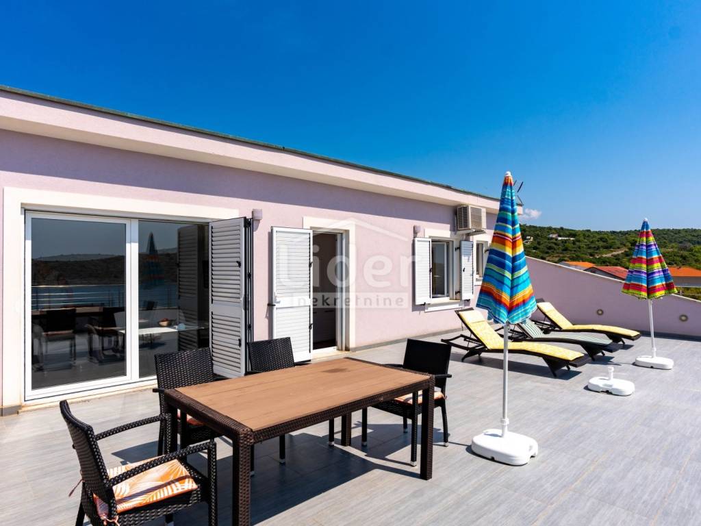 A two-story apartment for sale in Barbat on Rab. It is located on the second floor and in the attic. On the second floor there are two bedrooms, two bathrooms and a kitchen, dining room and living room. There are also two balconies with a wonderful view of the sea. In the attic there is another one-bedroom apartment with a huge terrace of about 60 m2. This terrace has a beautiful view of the sea and offers other outdoor opportunities. There The apartment is sold fully furnished with quality Italian furniture. It also has a small garden in the yard and a parking space. The apartment is located 200 meters from the beach and 5 km from the town of Rab. The building has three apartments.