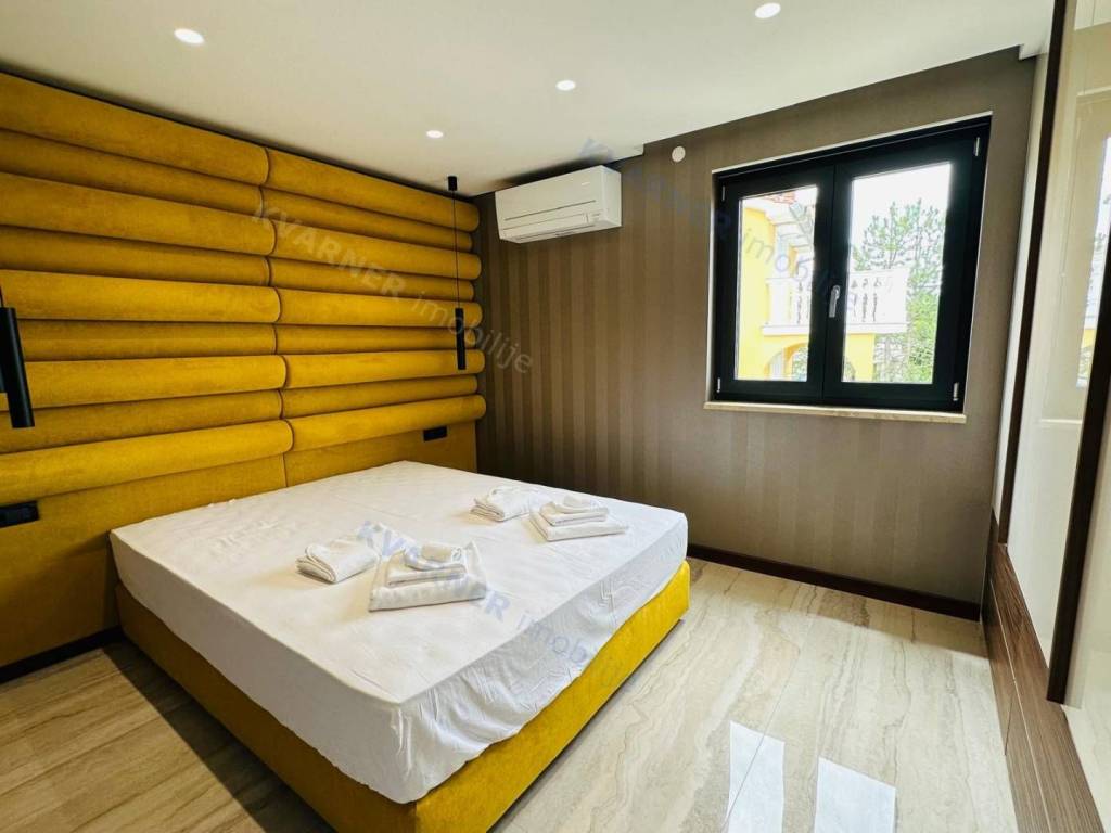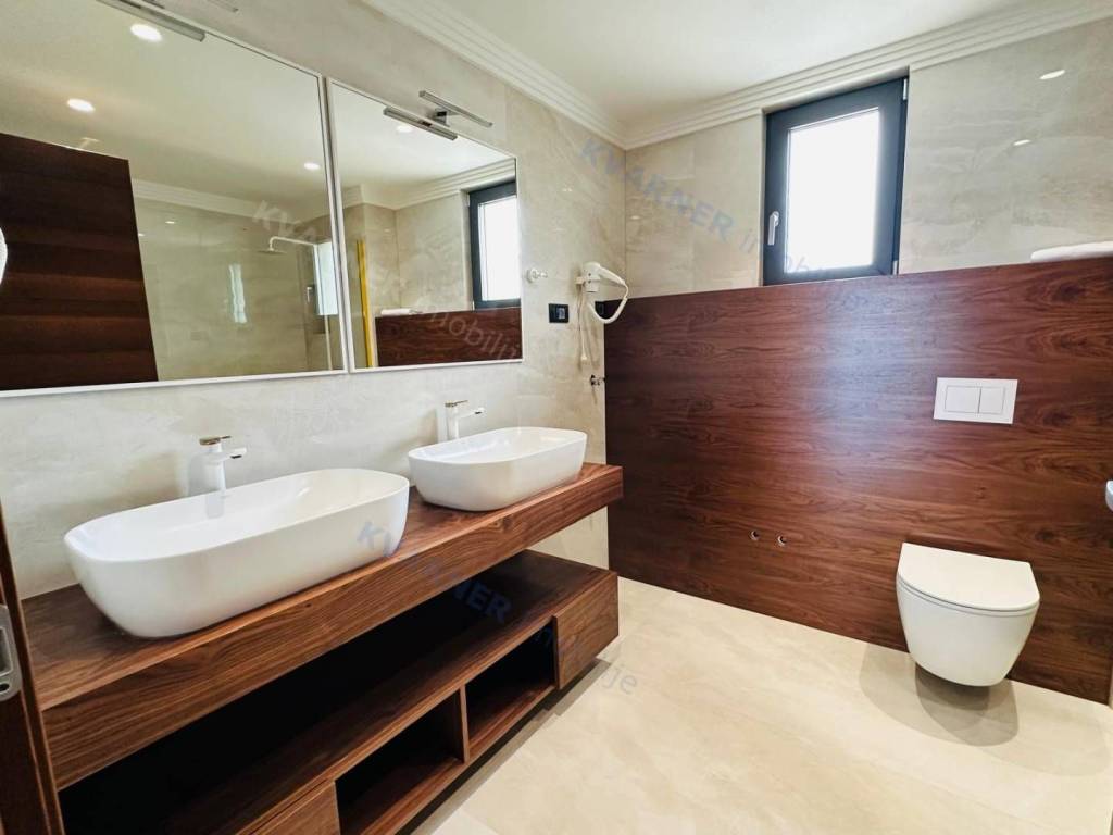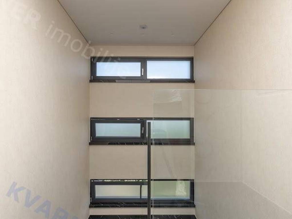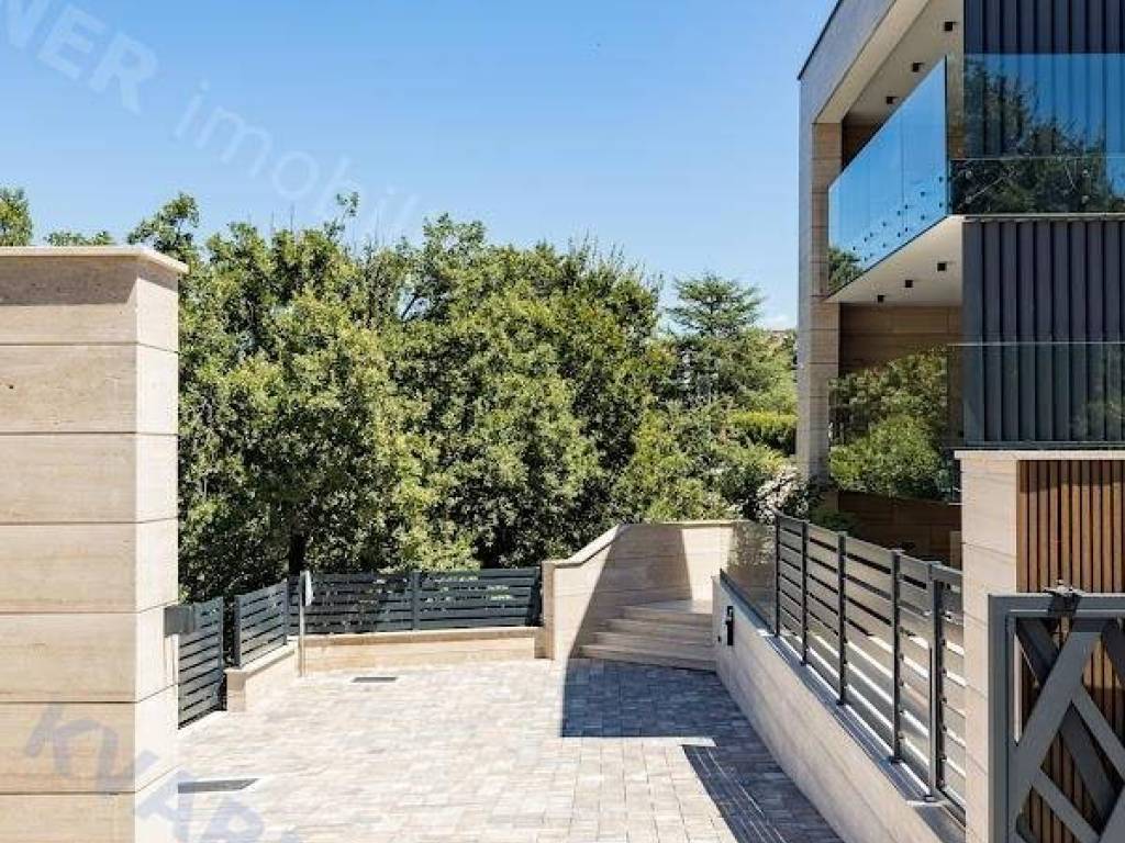 underfloor heating, Mitsubishi air conditioners in every room, external carpentry with large lifting and sliding walls, ceramic floors, top quality porcelain, suspended ceilings with built-in lighting, high-quality anti-burglary external doors – Dierre, walnut interior doors – Dierre etc. The bathrooms are decorated with a combination of ceramics and wood, and the external facade is built in ventilated Roman Travertine stone.