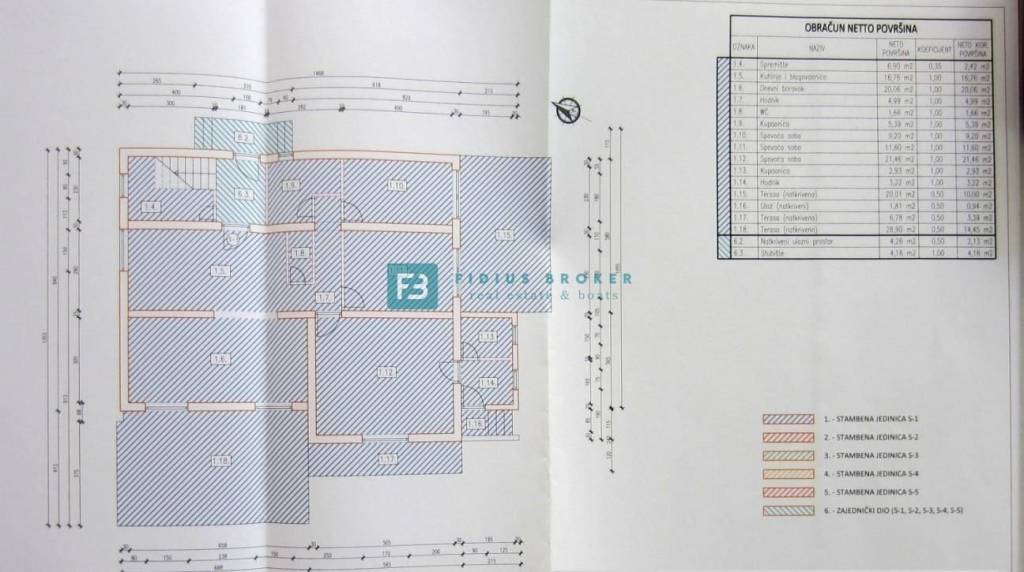 Apartment S1 extends over approximately 270 m2 of usable floor space (useful value 142.41 m2). The apartment has an interesting and functional layout and extends over the entire ground floor. It consists of a hallway, two bathrooms, toilet, storage room, kitchen, dining room, three bedrooms with large covered terraces, a living room with access to a covered terrace of approximately 29 m2 equipped with a TV connection, lighting, and a fan, and a studio. The apartment has a yard of approximately 75 m2 and two parking spaces with the possibility of accommodating a third vehicle on the plot. The apartment is fully furnished and ready to move in.