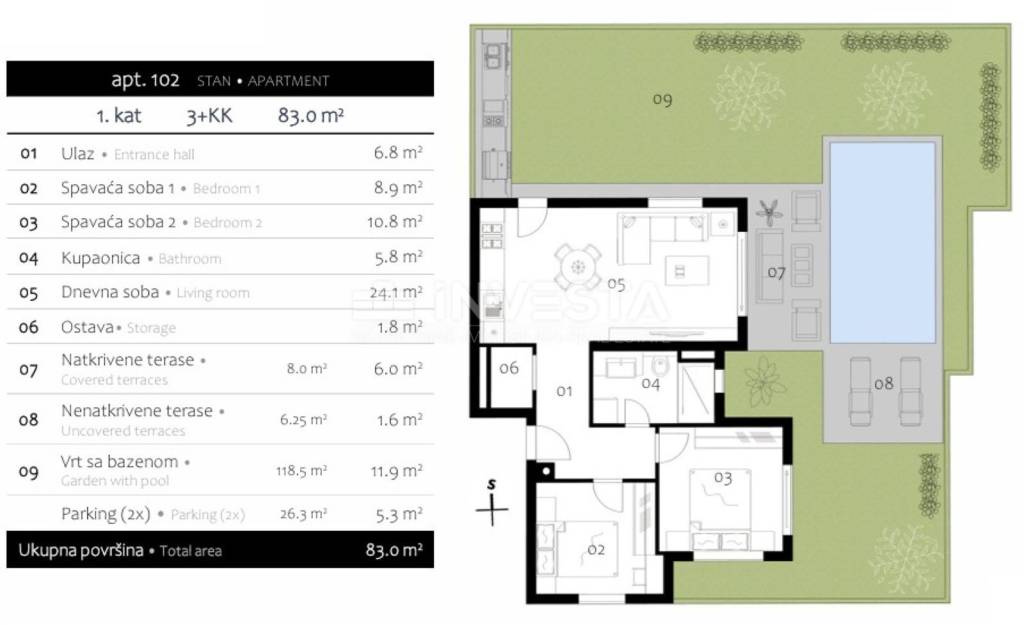 The private part includes a large bathroom, storage room and two comfortable bedrooms. The apartment also features a private garden of 58 m² with an exclusive private pool. Two marked parking spaces are included.