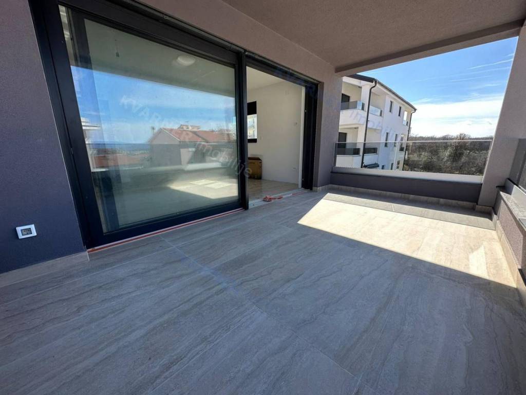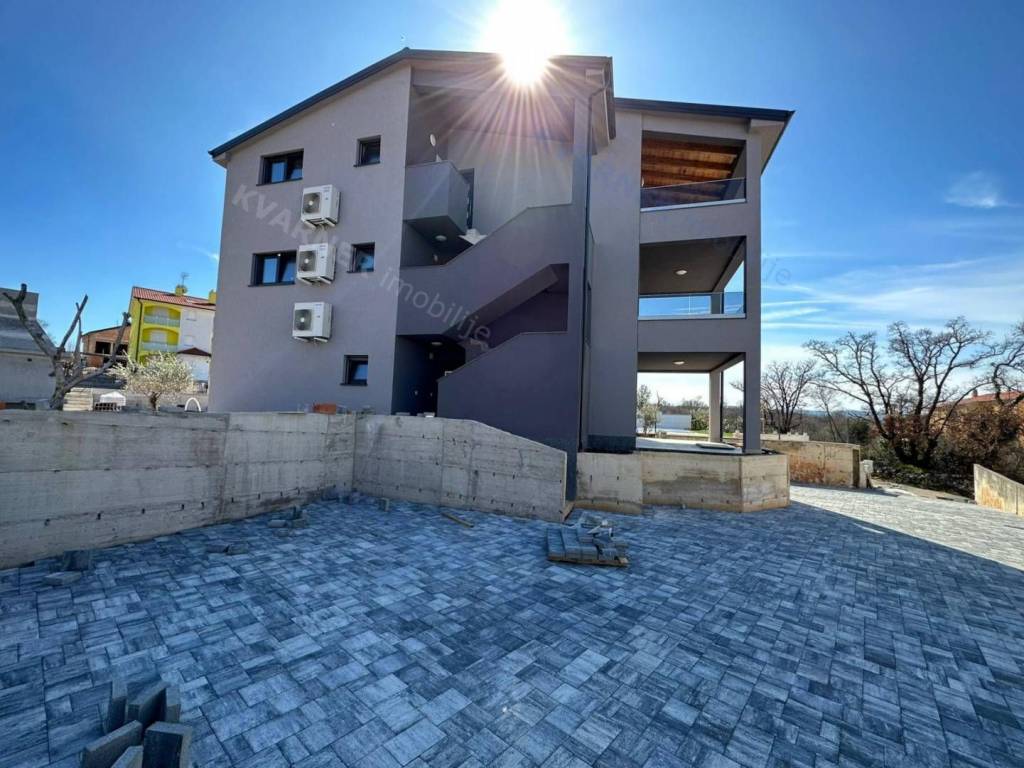The apartment is located on the first floor of the building, with its own entrance. The building has three apartments in total. The apartment is about 68 m². It includes an open-plan kitchen, dining area, and living room, which leads to a large terrace with a sea view. There are also two bedrooms, one with its own bathroom, and an additional bathroom. The apartment has one parking space in the yard, which also has a charging station for electric cars.