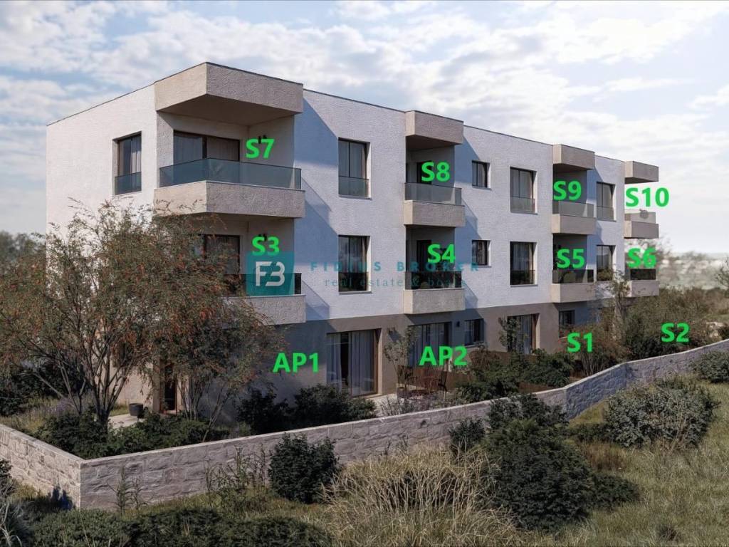 A new modern project of a residential building with 12 residential units is located in a quiet location. It will consist of three floors: ground floor + 1st floor + 2nd floor. The construction will use quality materials according to the latest construction standards: Sika and Mapei insulation system, glass railings on the terraces, electric underfloor heating in the bathrooms, modern bathroom fixtures, quality floor coverings (ceramics in the living room and kitchen, laminate in the bedrooms), PVC joinery with triple glazing, electric roller shutters, mosquito nets on all openings, air conditioning (3.5 kW) in the living room, connection power 5.75 kW per apartment. The apartments on the ground floor have a corresponding part of the garden, while the apartments on the 2nd floor have a sea view. Each apartment has one parking space. Possibility of purchasing an additional parking space at a price of €5,000. The planned start of construction is in the summer of 2026, and the planned completion of construction and move-in at the end of 2027.