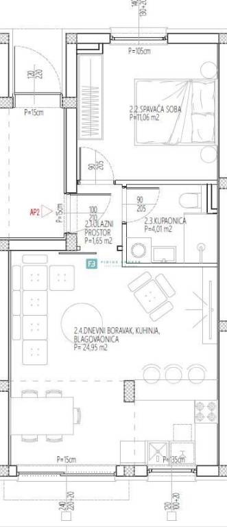 Apartment AP2 with a total usable area of ​​48.87 m2 (living area 41.67 m2 + garden 42 m2 + parking 15 m2) is located on the ground floor. The functionally arranged apartment consists of an entrance hall, bathroom, bedroom, kitchen with dining room, living room with access to a terrace and a garden of 42 m2. The apartment has one parking space.