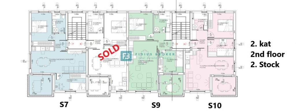 Apartment S9 with a total usable area of ​​63.72 m2 (living area 54.92 m2 + loggia 7.72 m2 + parking 15 m2) is located on the 2nd floor. The functionally designed apartment consists of an entrance hall, bathroom, two bedrooms, kitchen with dining room, living room with access to a 7.72 m2 terrace with a sea view. The apartment comes with one parking space. The price is €185,000 (the buyer is exempt from paying 3% real estate tax).