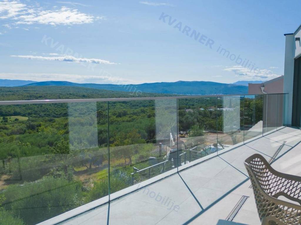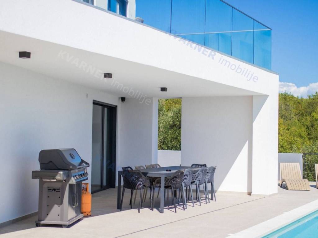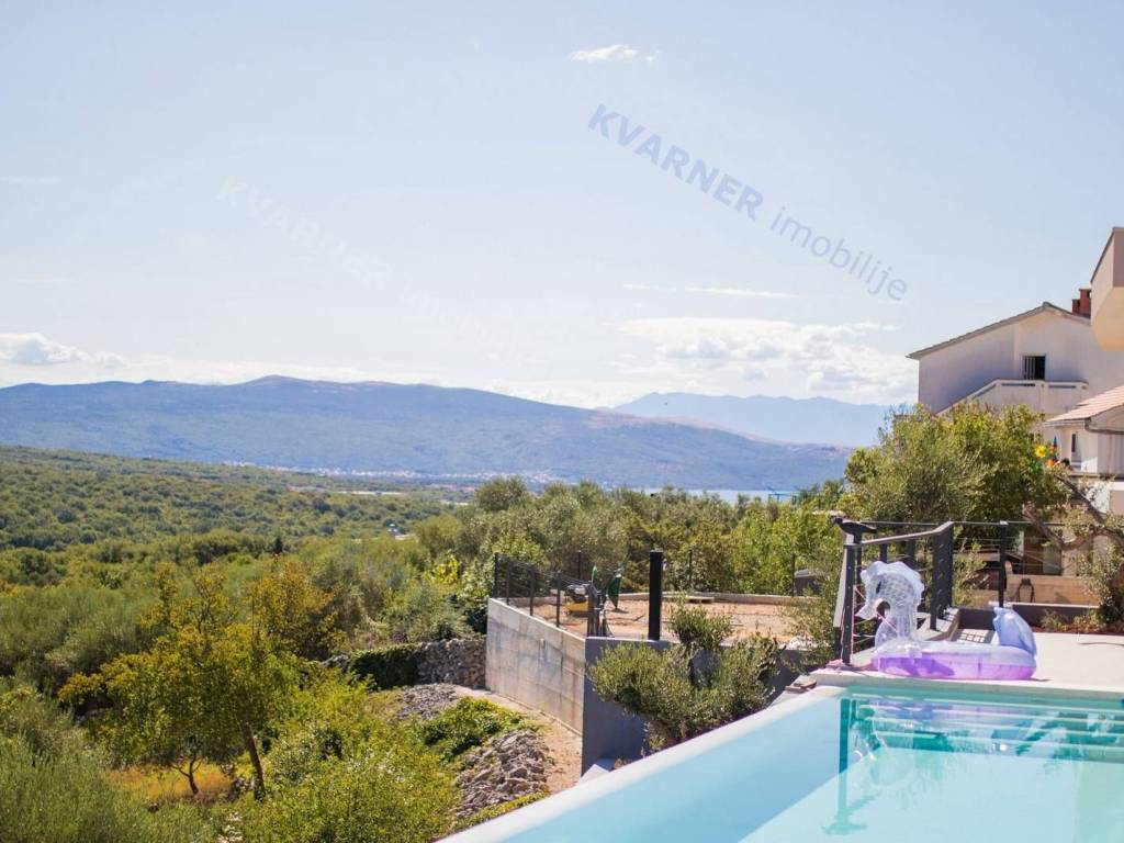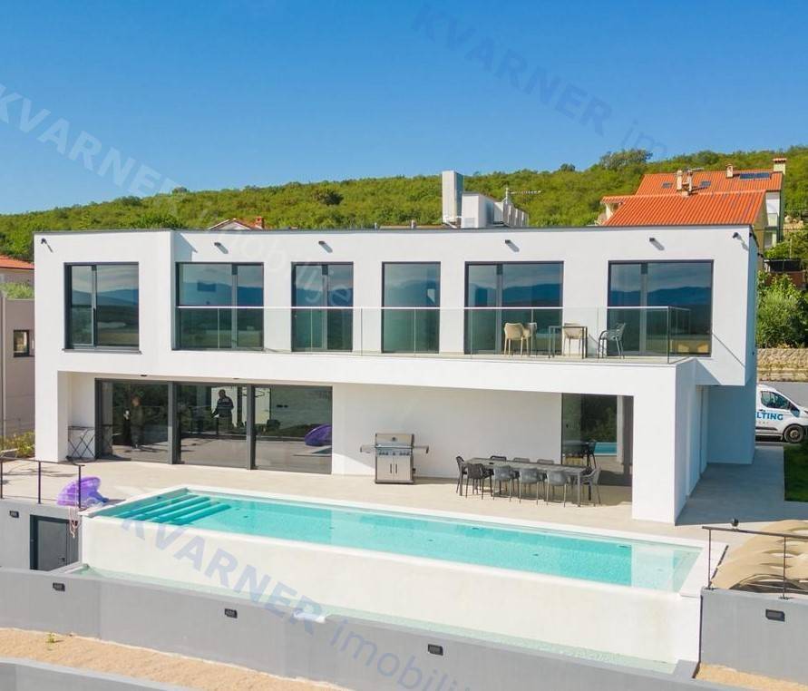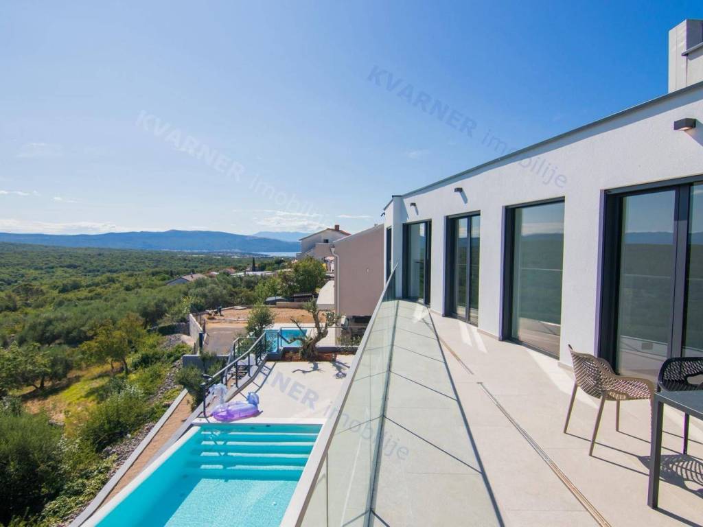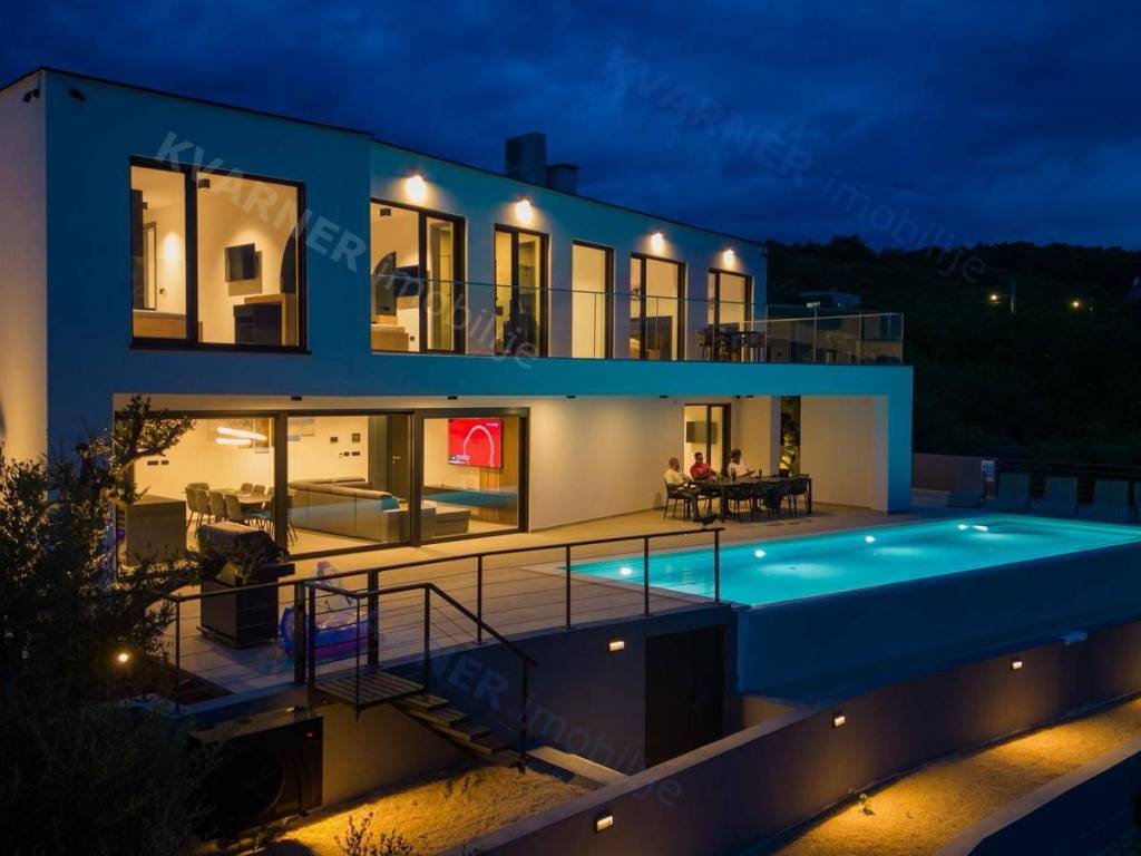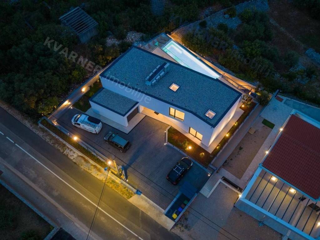 Situated in a quaint village close to the city of Krk, this contemporary detached villa is positioned on the edge of the construction zone..On the ground floor of the property, there is a garage, a laundry room with storage, wellness area, bathroom, kitchen with dining area, and a living room that opens onto a covered terrace with a barbecue and a beautifully landscaped garden with an infinity pool and a sunbathing area. Internal stairs ascend to the first floor, where you will find four bathrooms and four bedrooms, three of which grant access to a balcony with a stunning sea view and surrounding nature. The villa is currently in the process of obtaining a building permit, and construction is scheduled to begin in the autumn of 2023.