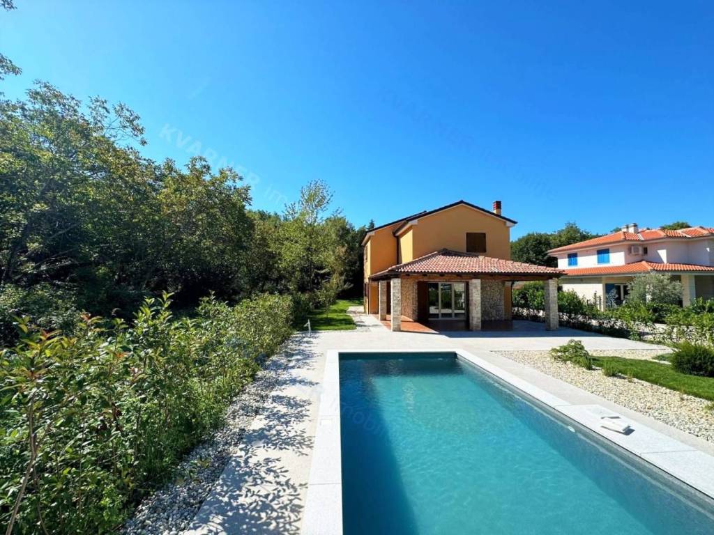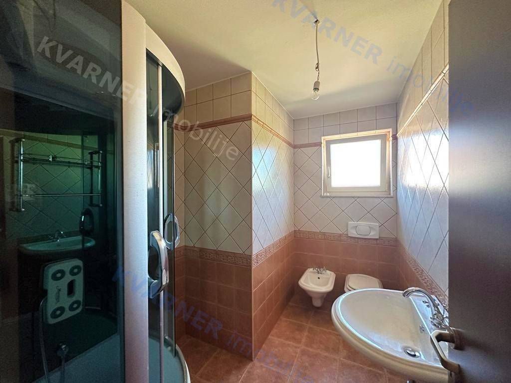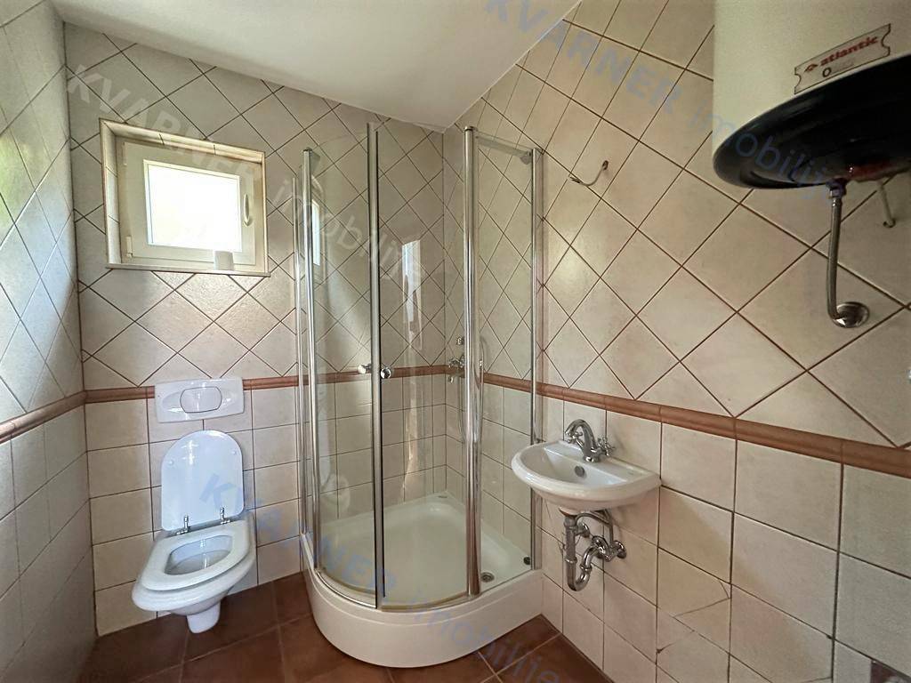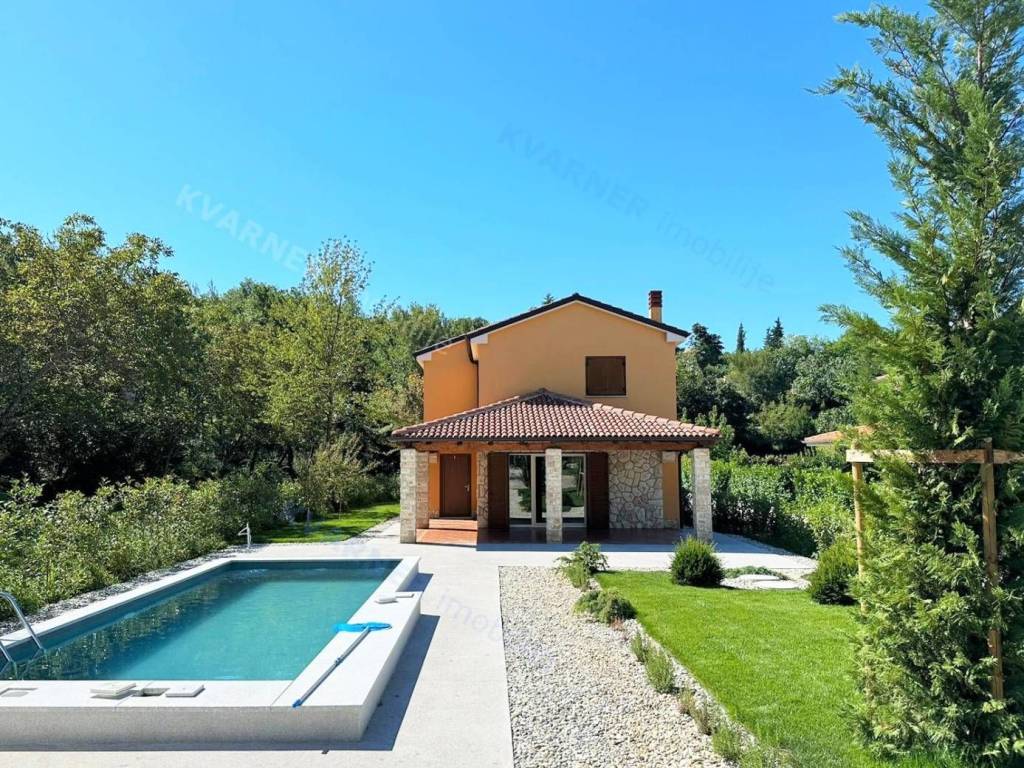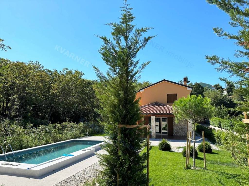 Situated on a plot of approximately 1100 m², this house is designed in a rustic style. The house is divided into a ground floor and an upper floor. On the ground floor, there is an entrance hallway, a bathroom, a bedroom, and a large open space comprising a kitchen with a dining area and a living room that lead out to a covered terrace with a garden and a pool. The upper floor contains three more bedrooms and two bathrooms, one of which is designed as a master bedroom. Additionally, the upper floor features a balcony that offers a view of the beautiful scenery. The house is equipped with air conditioning and has the possibility for installing a fireplace. The garden is equipped with an irrigation system, and there is a small cottage on the premises that serves as storage and provides parking space for multiple vehicles. The house is being sold unfurnished. This property is located in the vicinity of Dobrinj in a tranquil location that offers complete privacy and enjoyment of the charms of the interior of the island of Krk.