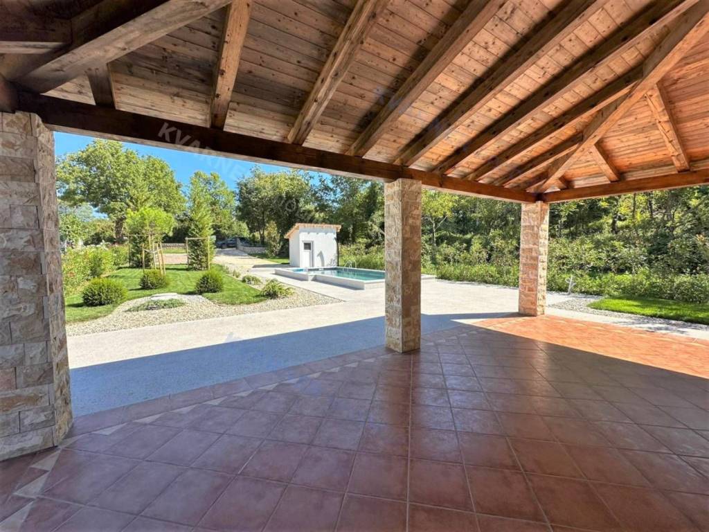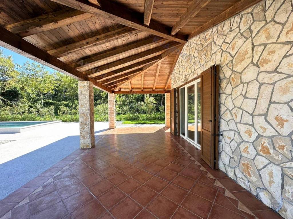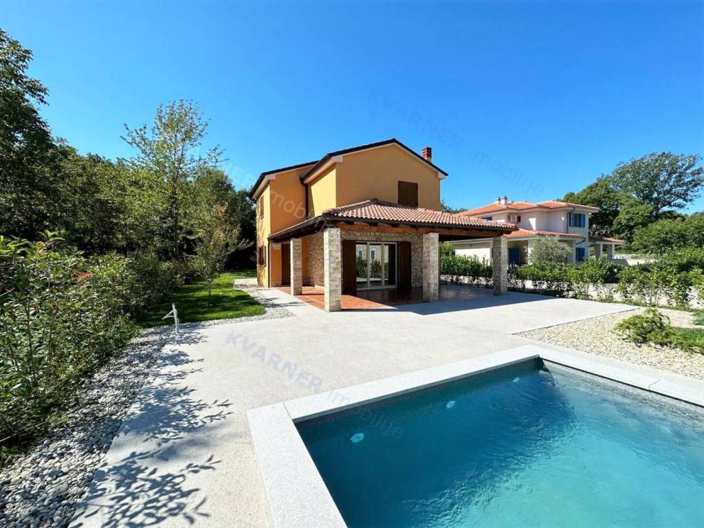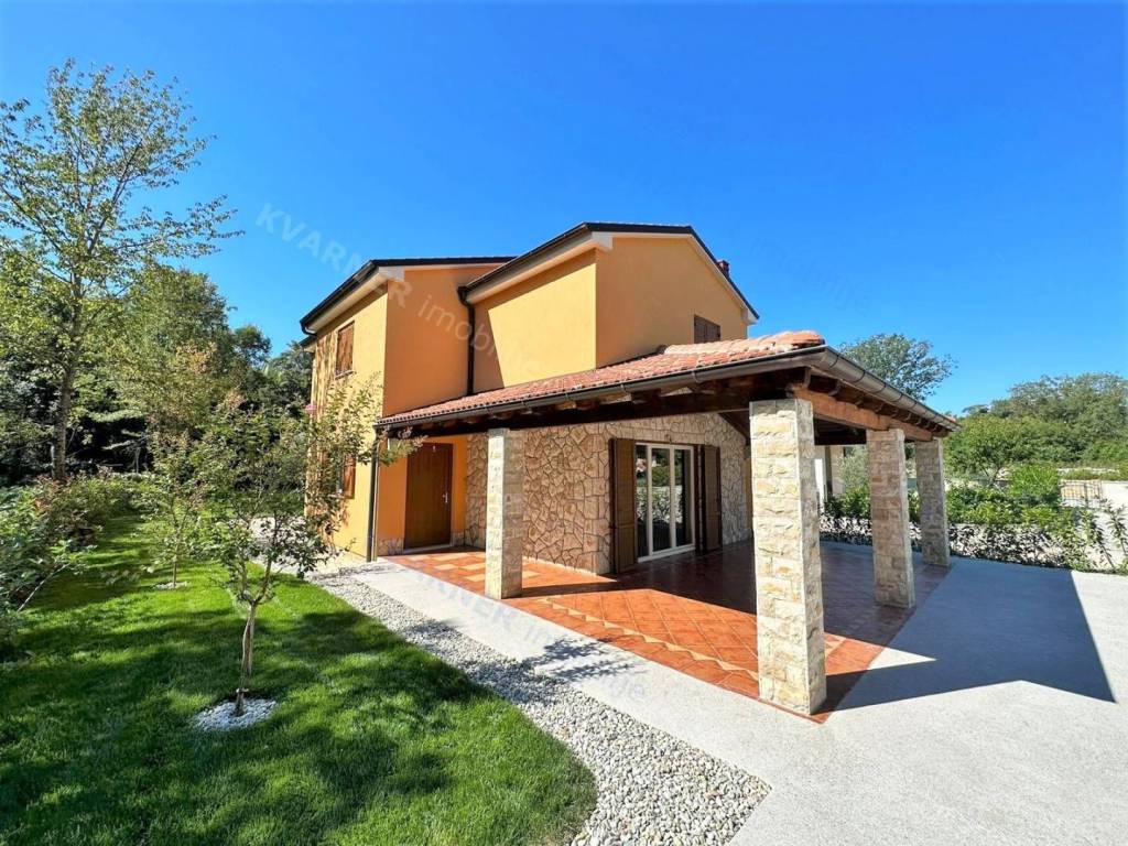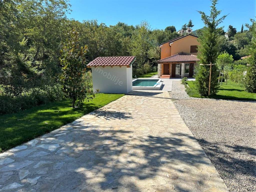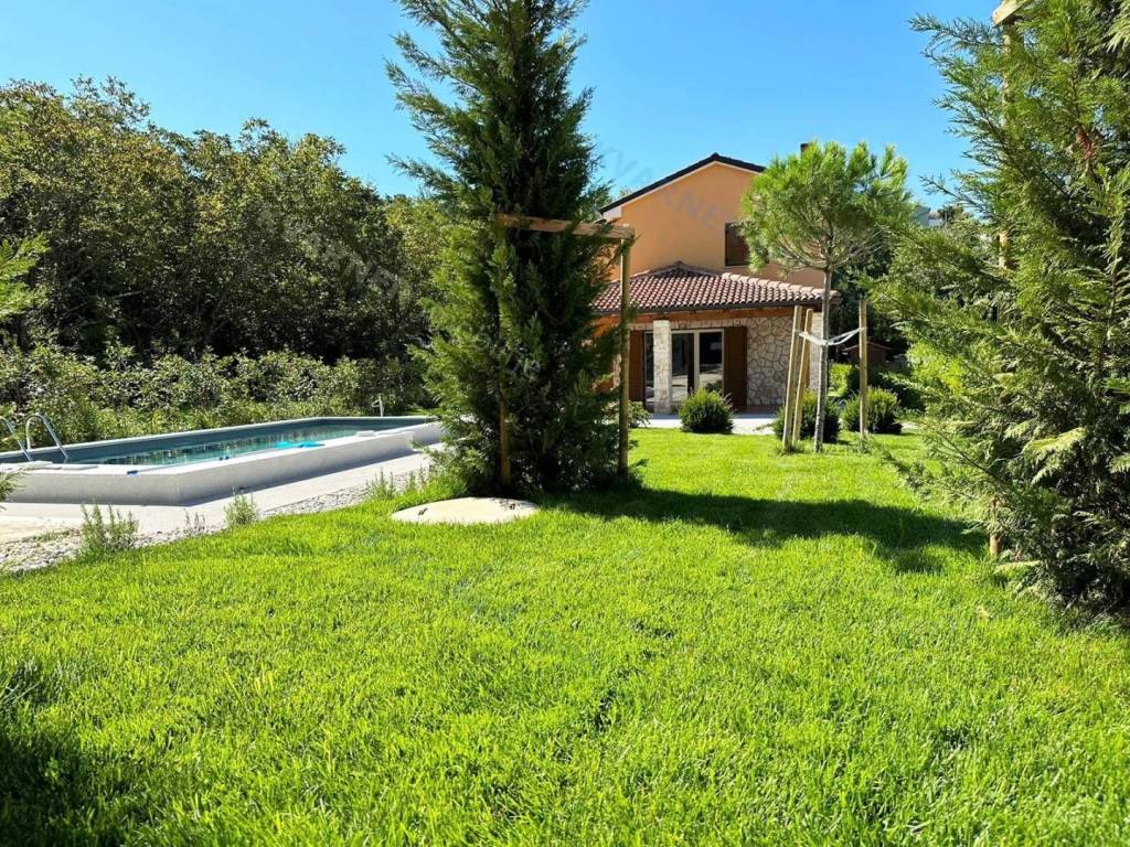 Situated on a plot of approximately 1100 m², this house is designed in a rustic style. The house is divided into a ground floor and an upper floor. On the ground floor, there is an entrance hallway, a bathroom, a bedroom, and a large open space comprising a kitchen with a dining area and a living room that lead out to a covered terrace with a garden and a pool. The upper floor contains three more bedrooms and two bathrooms, one of which is designed as a master bedroom. Additionally, the upper floor features a balcony that offers a view of the beautiful scenery. The house is equipped with air conditioning and has the possibility for installing a fireplace. The garden is equipped with an irrigation system, and there is a small cottage on the premises that serves as storage and provides parking space for multiple vehicles. The house is being sold unfurnished. This property is located in the vicinity of Dobrinj in a tranquil location that offers complete privacy and enjoyment of the charms of the interior of the island of Krk.