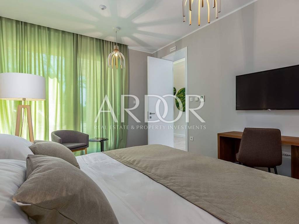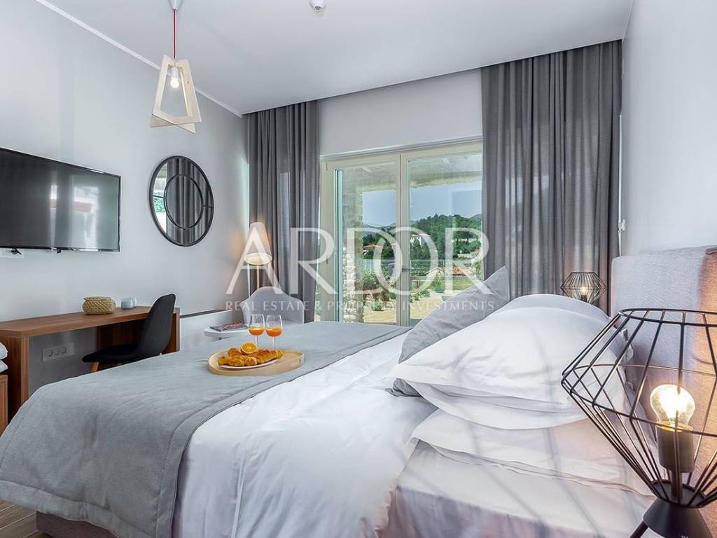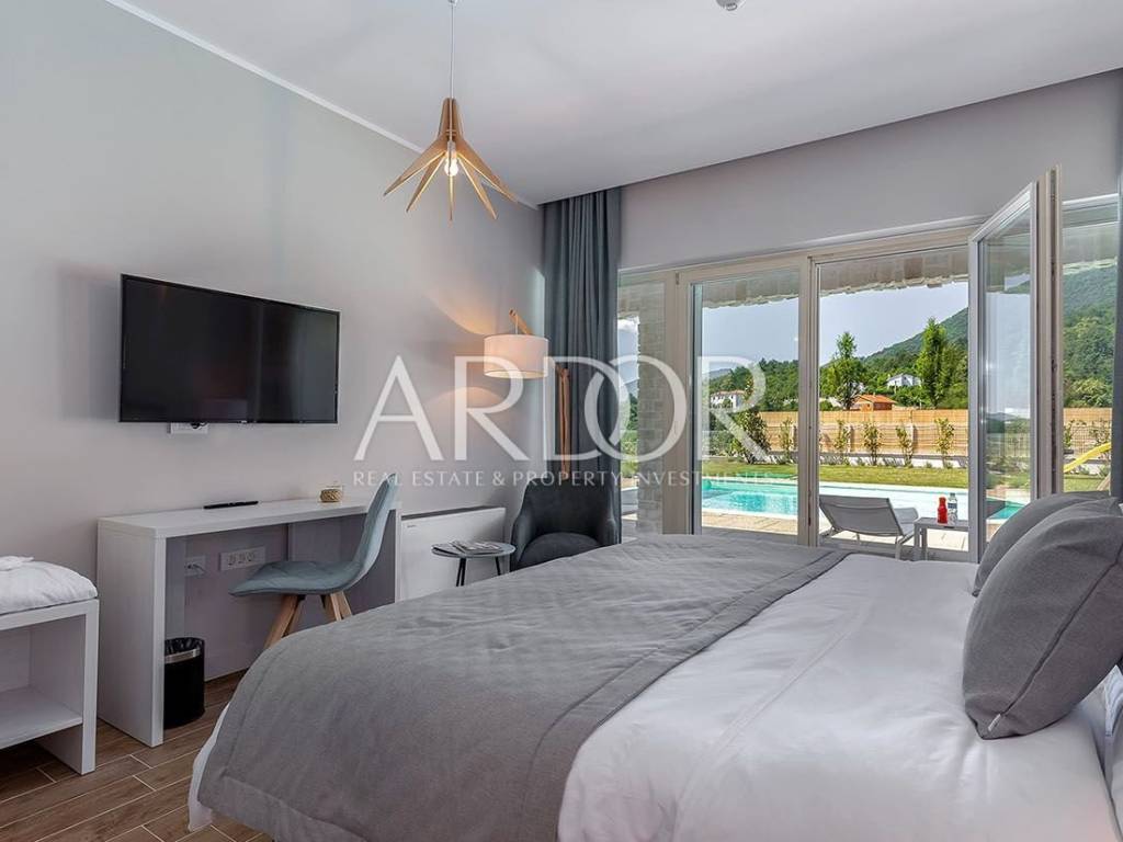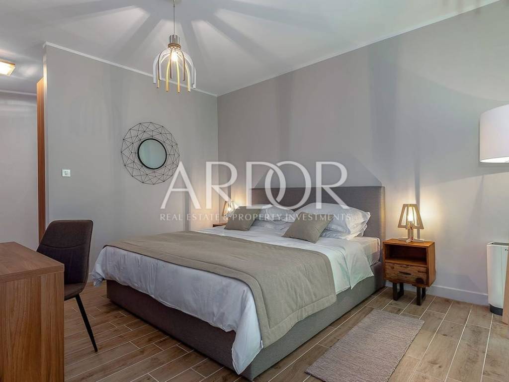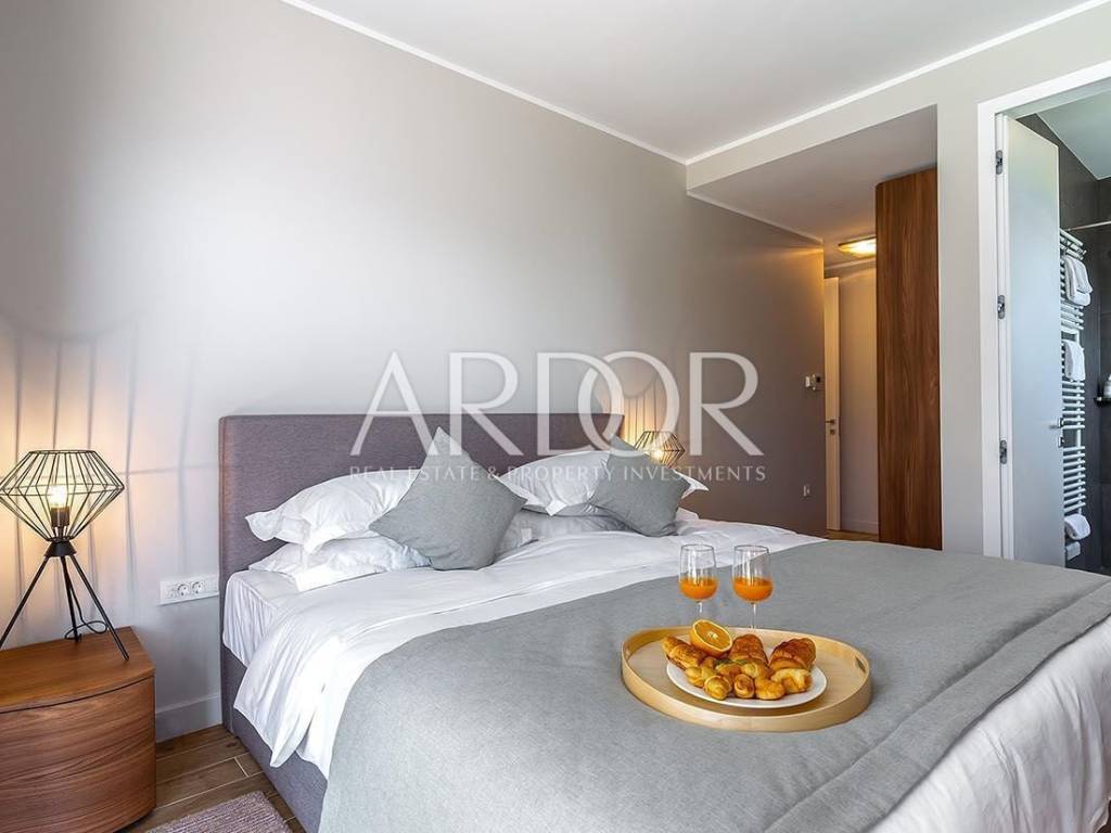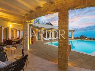 On two luxuriously equipped floors of approximately 400 m2, there are 5 bedrooms with private wardrobes, 5 bathrooms, spacious living room with kitchen and dining area, gym and sauna. The ground floor occupies an open space living room and dining room suitable for socializing, where in the central part there is a large table for ten people and a wood burning fireplace. Large glass openings connect the entire ground floor with terraces and sunbathing areas, and a heated pool measuring 12x6 m.