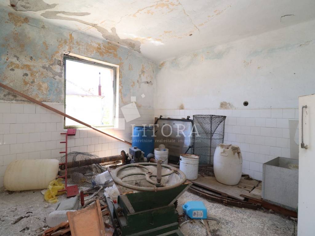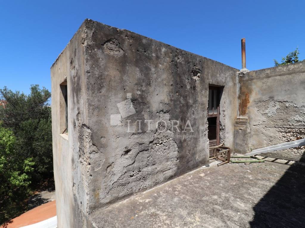 Brodarica – Detached house with great potential, just 180 m from the sea. Located in the attractive coastal village of Brodarica, only 180 meters from the sea and beach, this detached house spans two floors with a total usable area of 138.13 m². It sits on a flat plot of 379 m² and includes a private driveway with spacious parking. The house consists of a ground floor and first floor connected by an external staircase. The ground floor features a large traditional tavern (konoba), kitchen, pantry, storage room, and bathroom. Each room has a separate entrance from the yard, offering flexibility for renovation or conversion. The first floor includes three rooms, a kitchen, a hallway, and an uncovered terrace of 14.71 m² — ideal for outdoor living. Originally built in 1950, the property is connected to water and electricity, with access to full infrastructure. The intermediate floor structure is partially wooden, and the house is currently in a derelict condition and uninhabitable. However, it offers great potential for renovation and represents an excellent opportunity for investors or buyers looking to create a custom home near the sea.