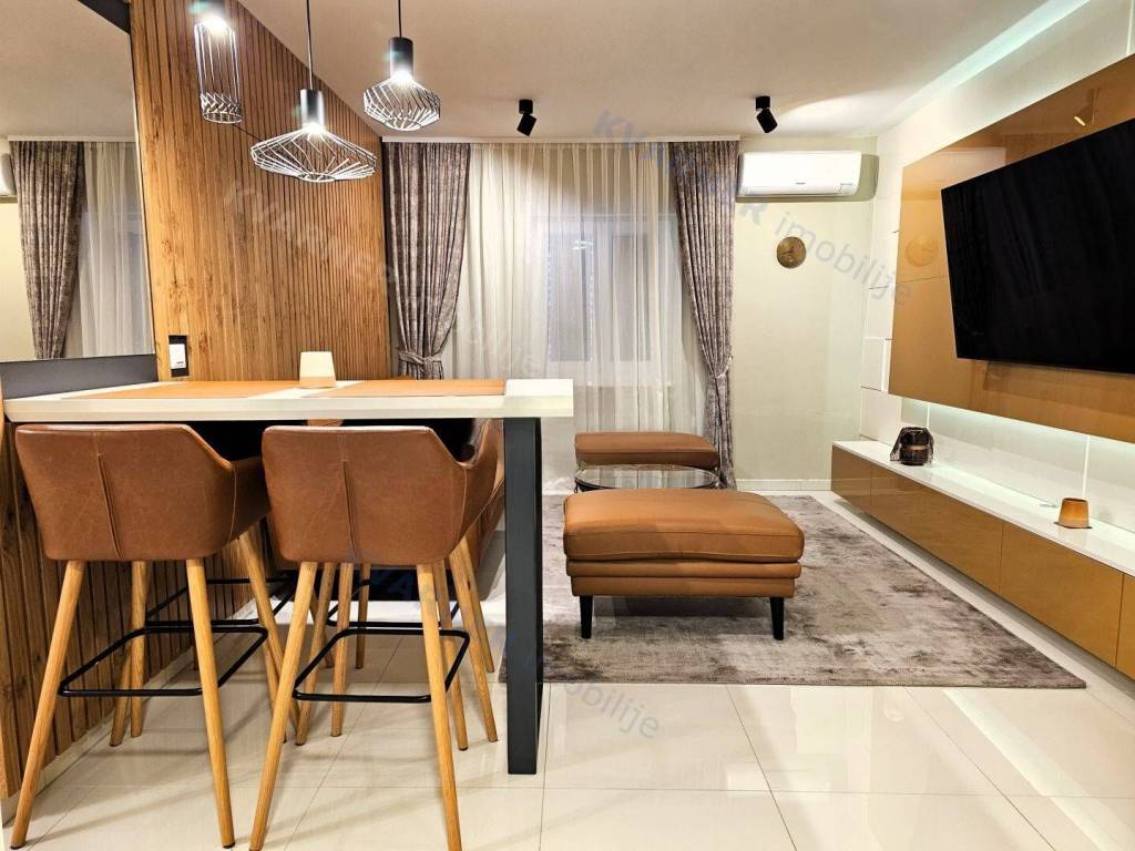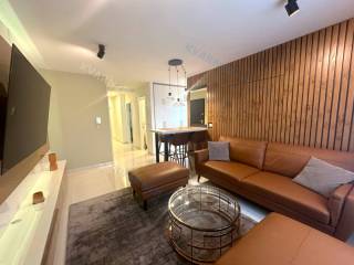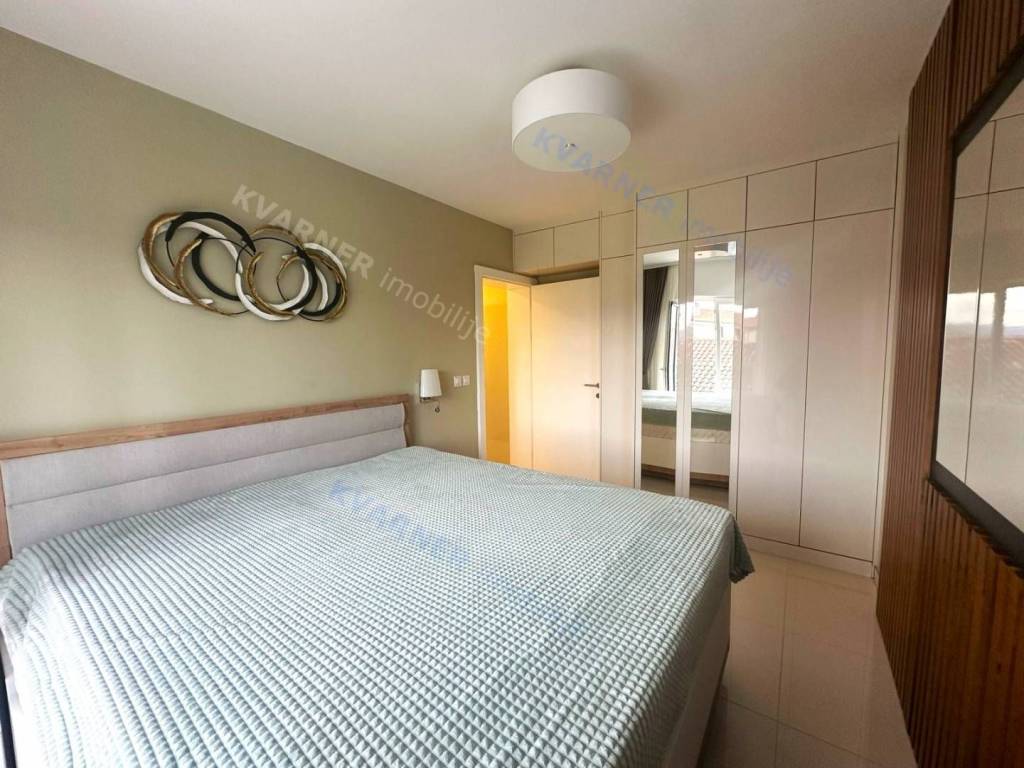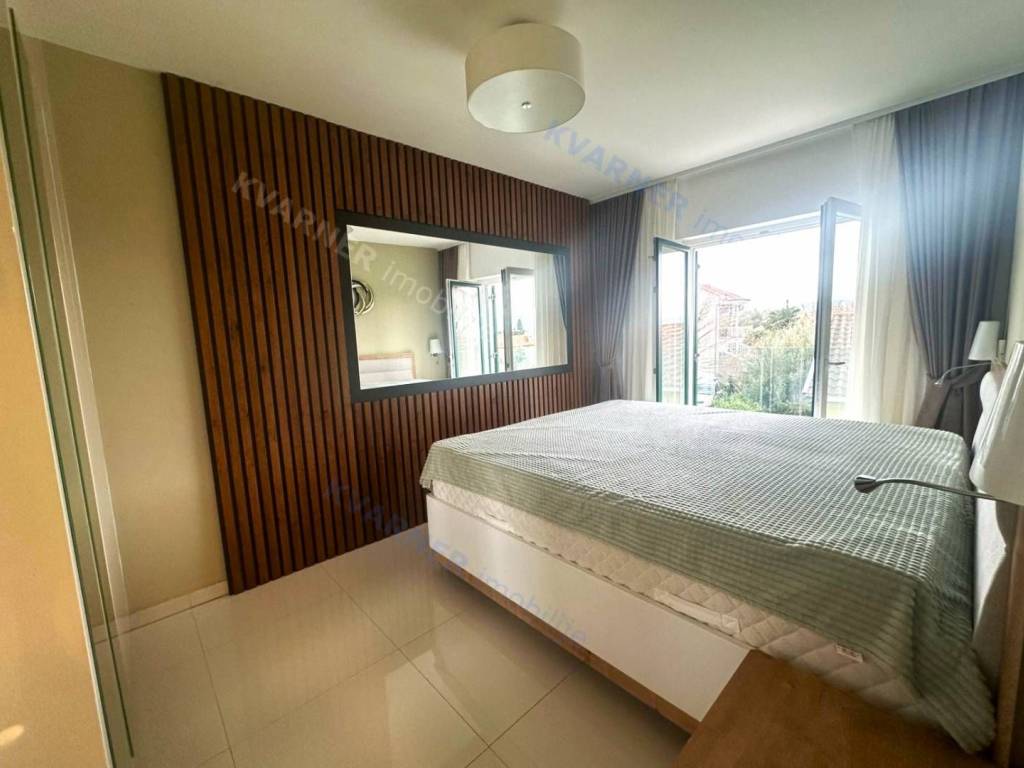 The apartment, with a total area of 79m² consists of a hallway, two bedrooms, a bathroom, a toilet, and a living room with a kitchen and dining area that opens onto a covered terrace with a sea view. Quality construction, equipment, and sanitary facilities. The apartment is nicely decorated and is sold as such, with features such as air conditioning in the rooms and underfloor heating. The apartment comes with a parking space on the premises of the building.