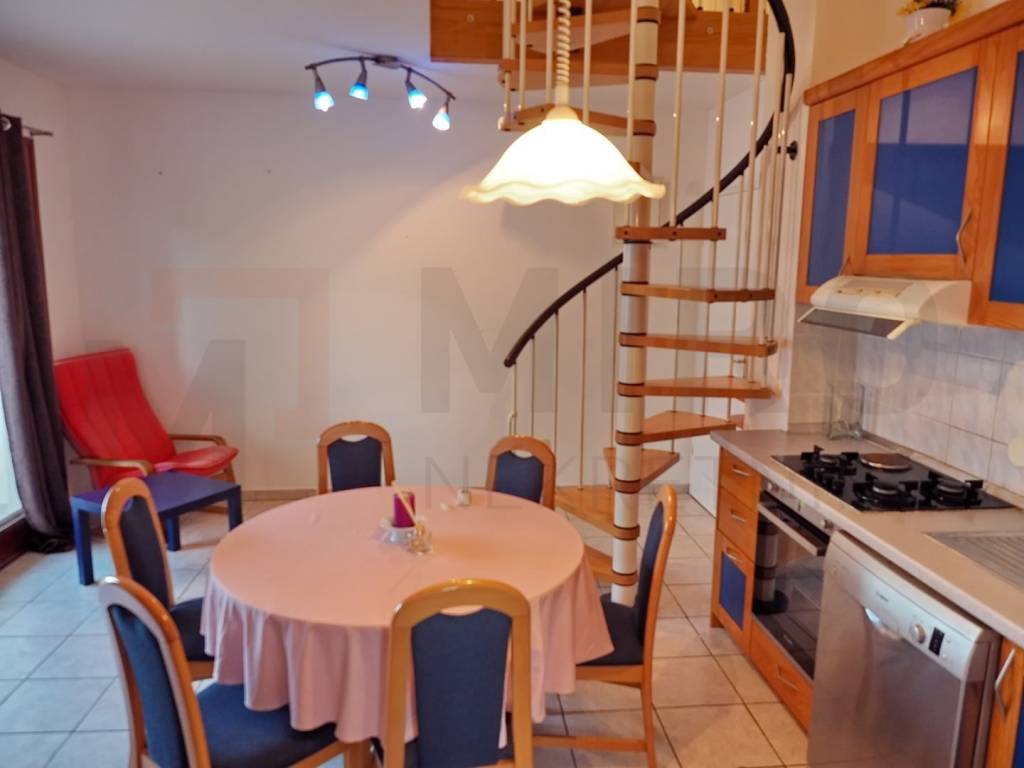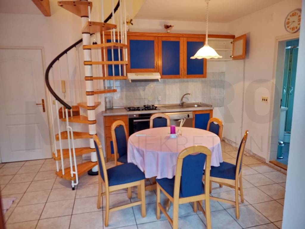 Island of Krk, Malinska, two-story apartment for sale in an excellent location near Malinska, only 400 meters from the sea. The apartment extends over two floors, through the second floor and the attic. It also has a nice view of the sea. On the lower floor there is a living room with a kitchen and a dining room, a bedroom, a bathroom and a covered terrace with a view of the sea. Internal stairs lead to the second floor, where there is another bedroom and a bathroom. The apartment is fully air-conditioned. A new facade was installed and it has a storage room in the attic. Furniture and equipment agreed between buyer and seller. Parking spaces on the building's grounds belong to it. The apartment is owned by a natural person and the property transfer tax is calculated at the rate of 3%. The owner of the apartment guarantees proper documents. Visit us and find the square footage of your home!