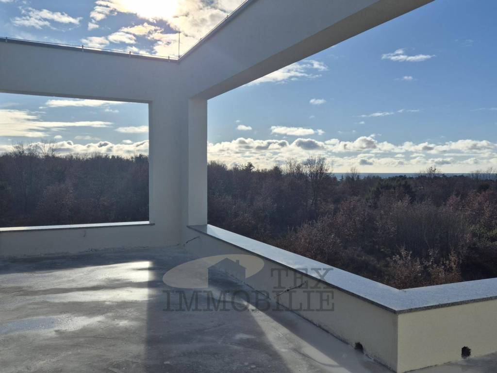 Situated on the second floor of a smaller building, the penthouse covers a net area of 204.90 m² (gross 174.05 m²). It consists of an entrance area, a spacious living room connected to the kitchen and dining area, two terraces with a sea view, three comfortable bedrooms (one of which can be converted into a room with a sauna and gym), two bathrooms, and a guest toilet.