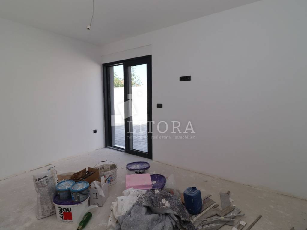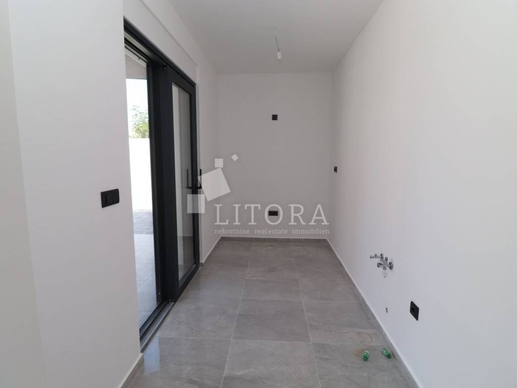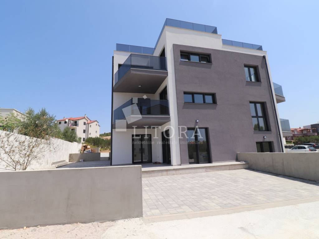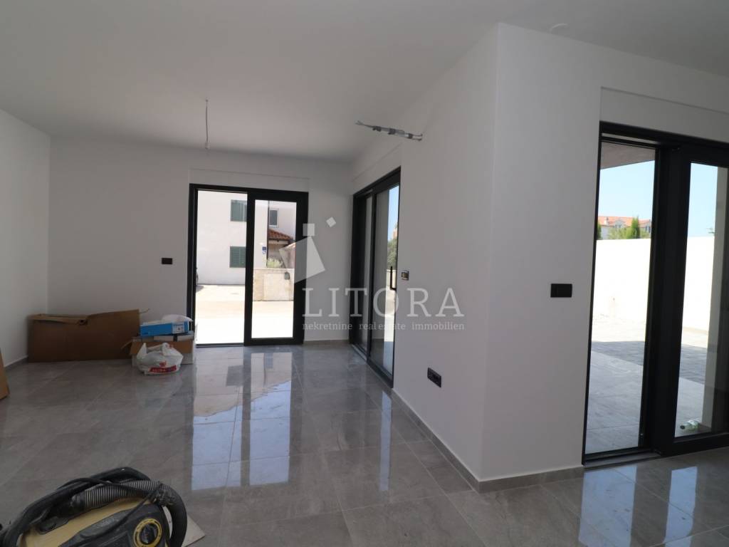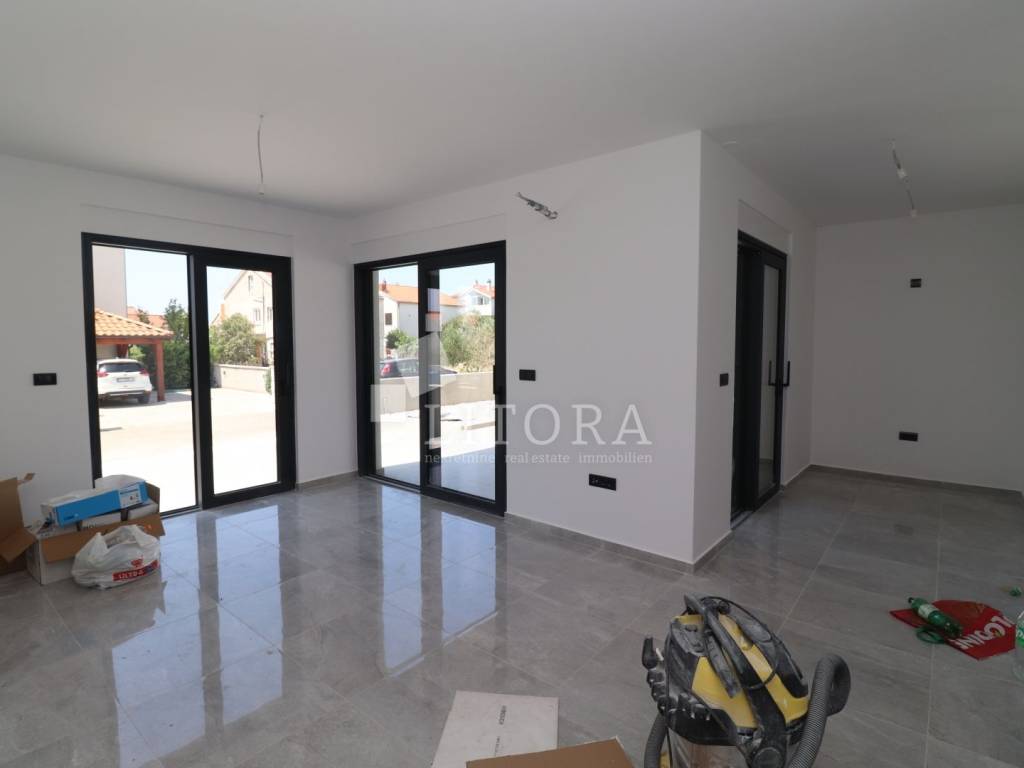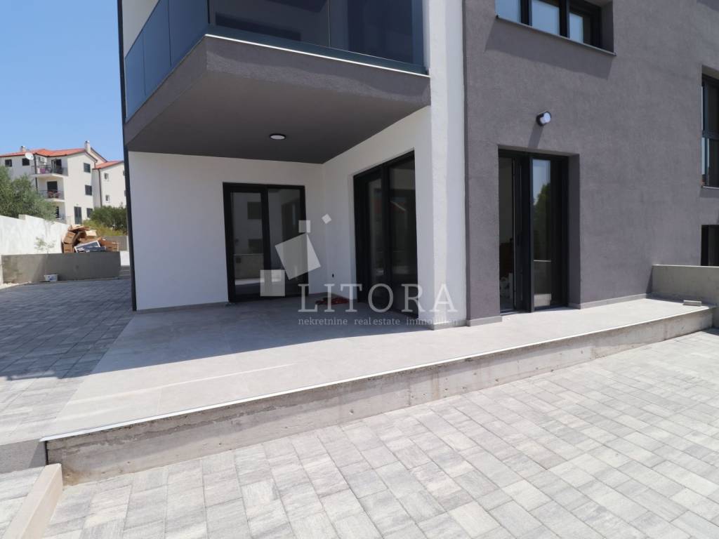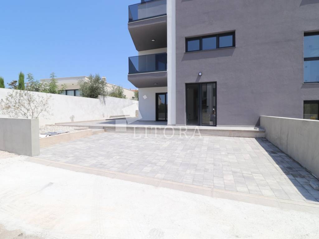 Newly built apartment with a total usable area of 86.02 m² and a private yard. Apartment A2 is located on the ground floor and has a living area of 69.02 m². It consists of two bedrooms, a bathroom, a kitchen with dining area, and an open-plan living room with access to a spacious terrace and a 120 m² yard. The apartment also includes two parking spaces. High-quality features include ceramic tiles, sanitary ware, carpentry, underfloor heating in the bathroom, air conditioning units, and mosquito screens. The distance to the town center is 750 meters, and only 200 meters to the sea and the beach.