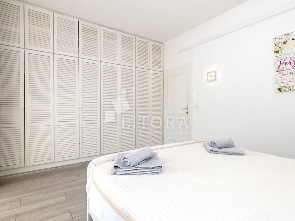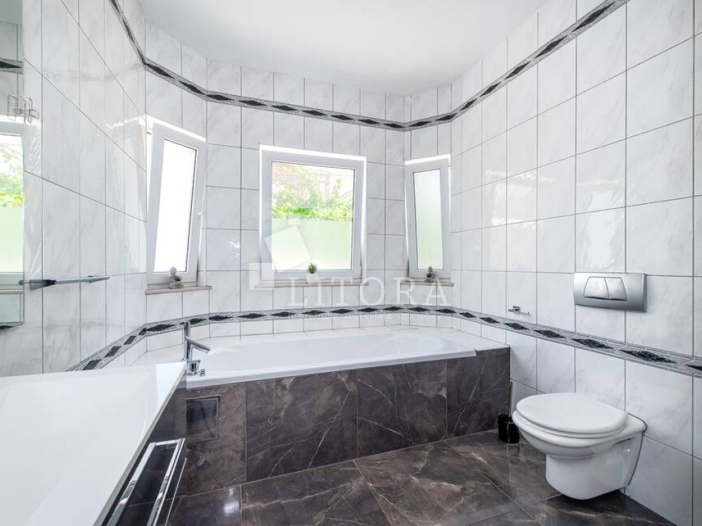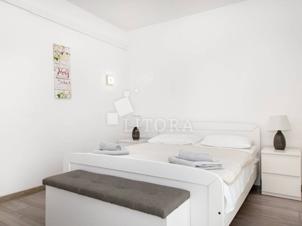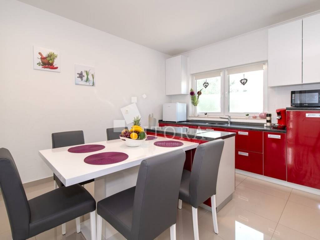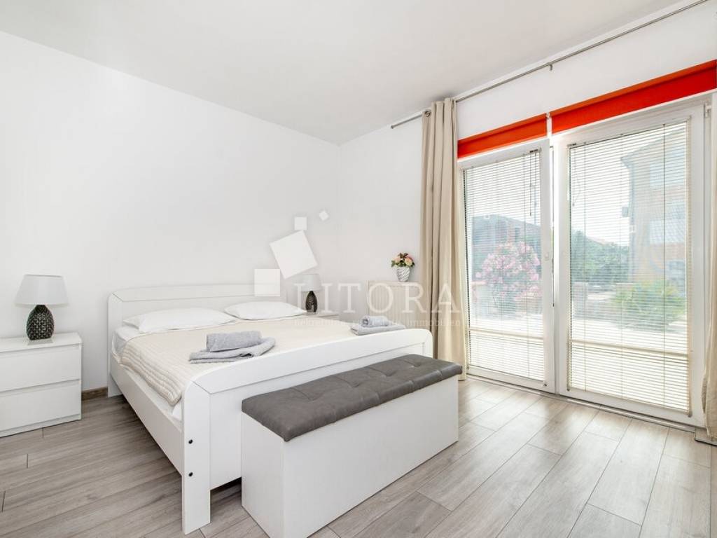 The property features a functional and spacious layout, consisting of: three comfortable bedrooms, two modern bathrooms, a storage room, a spacious living room, a kitchen with dining area, two large terraces – one on the south and one on the north side of the house. The fenced and landscaped yard provides privacy and enough space for building a pool, while the paved part of the yard offers parking for several vehicles. The house is being sold fully furnished, with all furniture included in the price. It is equipped with air conditioning units for heating and cooling as well as electric central heating, making it suitable for year-round living. Distances to the Sea / beach: 700 m and to the Town center is 1,200 m. This property is ideal for both family living and tourist rental thanks to its location and features.