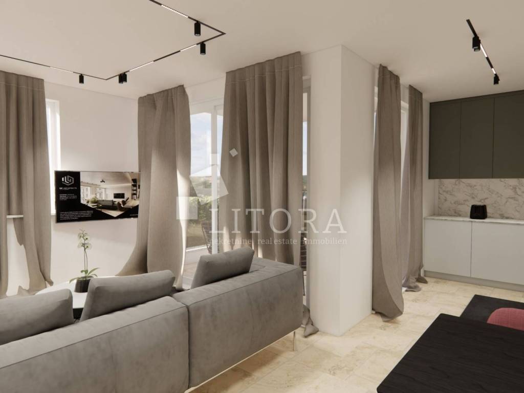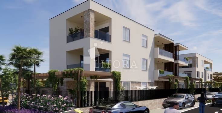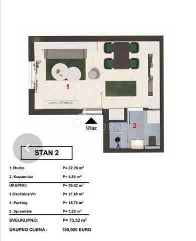 Brodarica Prestige Residences, an exclusive residential project in close proximity to the sea. Residence 1 – Apartment S2, with a total usable area of 38,11 m², is located on the ground floor of a smaller residential building. The apartment itself has an area of 26.82 m² and consists of a bathroom, a kitchen with dining area which also serves as the sleeping area, with direct access to the courtyard of 27.80 m². The apartment comes with a parking space of 15.70 m² and a storage room of 3.20 m². It will be equipped with high-quality premium stone wool insulation, aluminum joinery with insect screens and triple glazing, premium ceramics and sanitaryware, premium three-layer parquet, underfloor heating in the bathroom and living room, and air conditioning units. The courtyard will be landscaped with greenery, a pergola on the terrace, a barbecue, and underground waste containers. Completion and move-in are scheduled for the end of 2026. The distance to the sea/beach is only 80 meters, making this property ideal for a peaceful family life or for tourist rental.