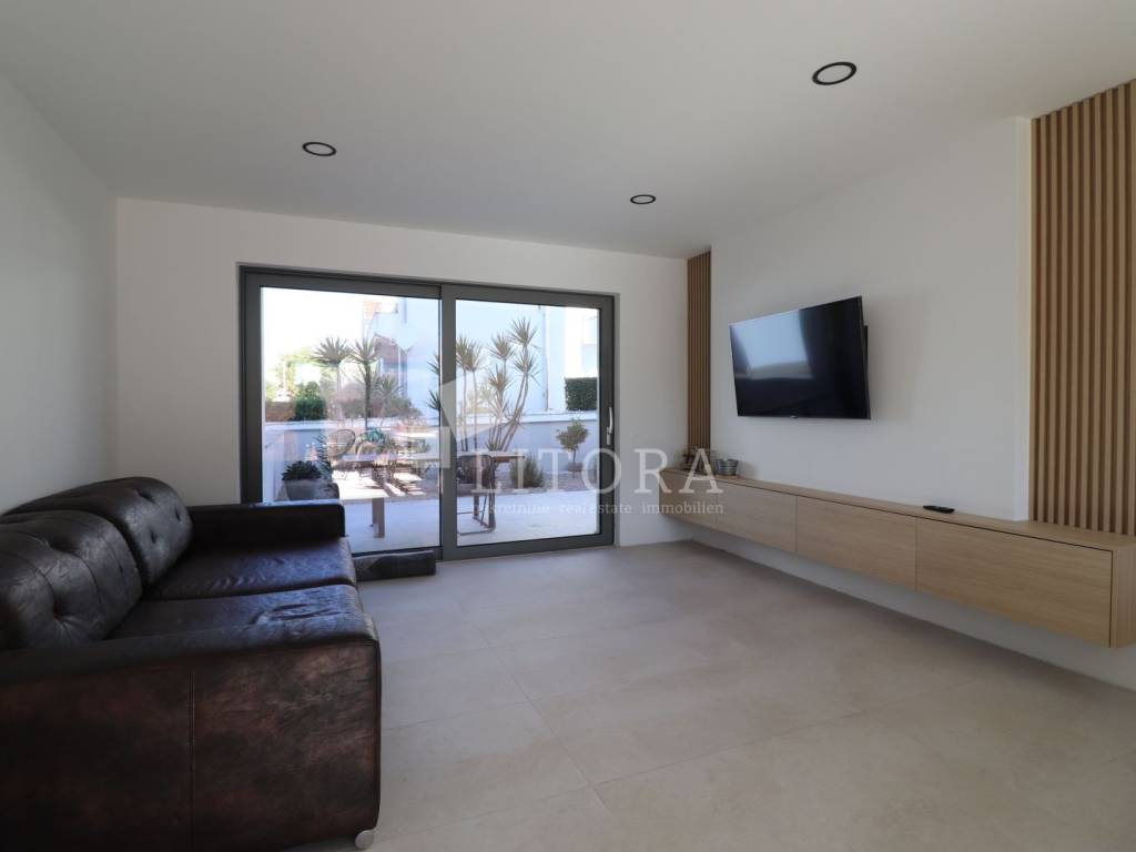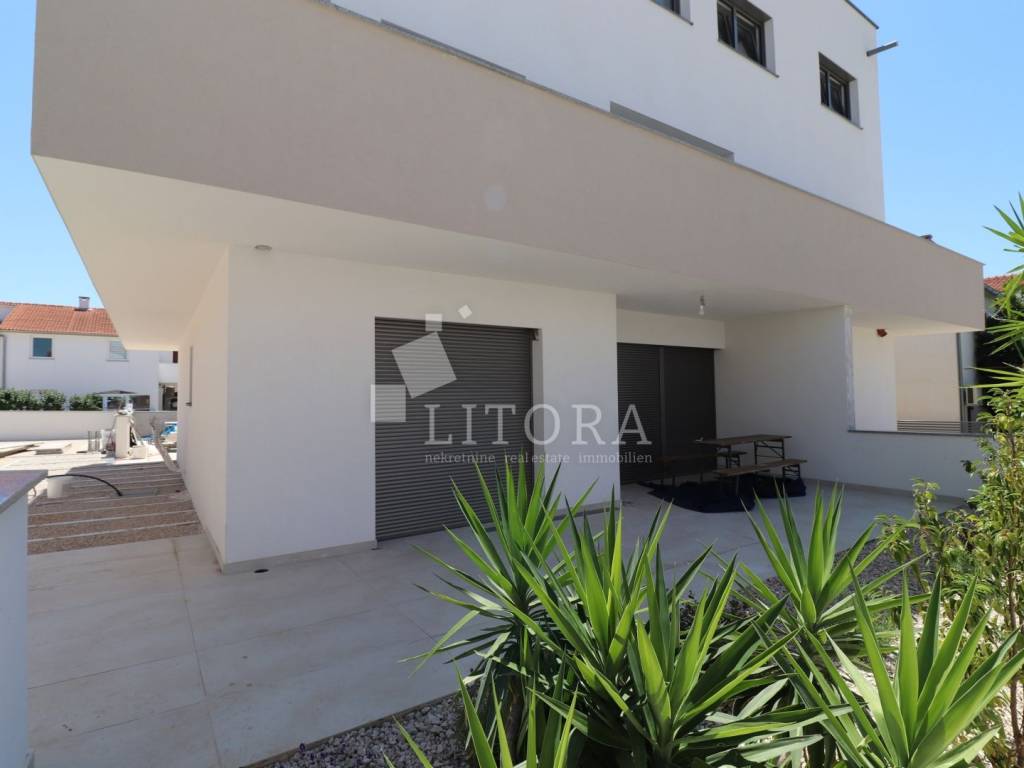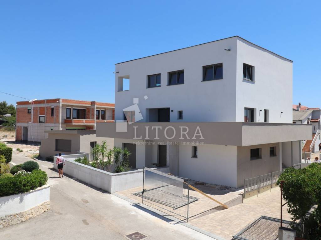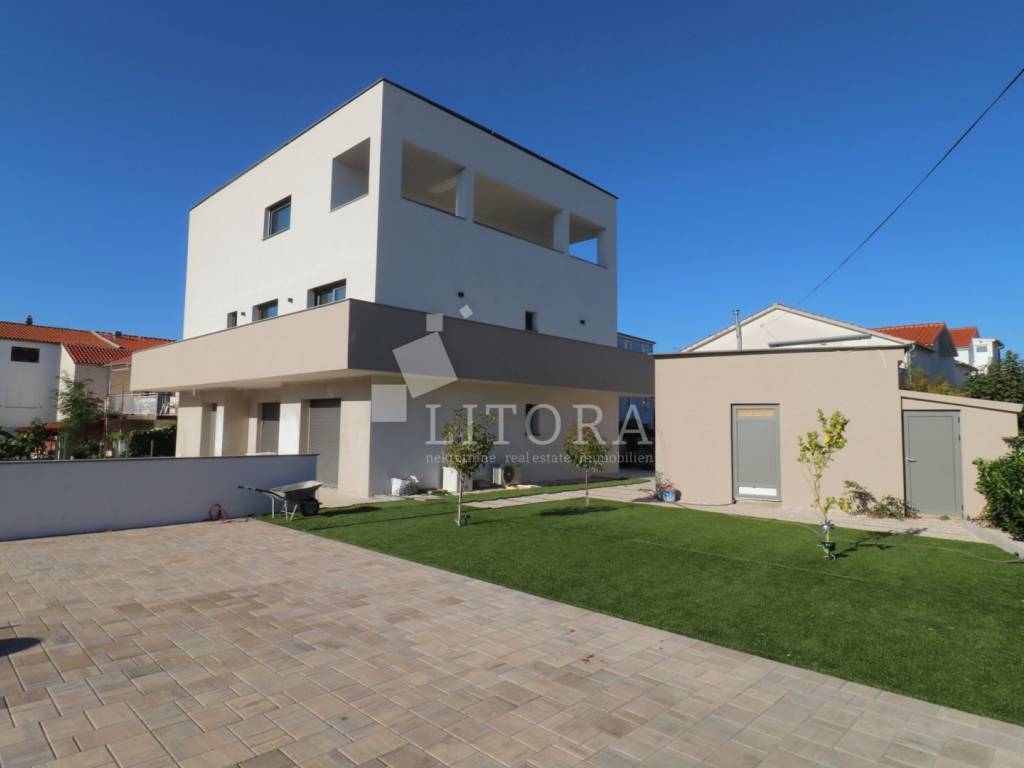 Newly built multi-family residential building with a total of three housing units and an auxiliary building of 40 m². The property consists of three floors: ground floor, first floor, and second floor, with a total of 406 m² of usable space. The building is a new construction made from top-quality materials, situated on a plot of 811 m². In the courtyard, there is a 50 m² swimming pool with counter-current swimming and heating capability, an outdoor shower, and spacious parking for up to 11 vehicles. The garden is landscaped and enriched with Mediterranean plants and trees. Each floor represents a separate, comfortable unit with its own entrance. The ground floor features a comfortable three-bedroom apartment consisting of an entrance hall, three bedrooms, two bathrooms, kitchen, dining room, and living room. The first floor houses a comfortable three-bedroom apartment with two bathrooms and a terrace, while the second floor offers a spacious two-bedroom apartment with a large terrace. From the second-floor apartment, there is access to the roof, which can be converted into a rooftop terrace. The ground-floor apartment is fully furnished with high-quality, custom-made furniture. The entire property is equipped with underfloor heating, the floors are made of premium ceramic tiles, and the aluminum joinery with triple glazing includes shutters, insect screens, and electric shutter lifts.