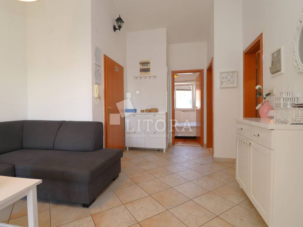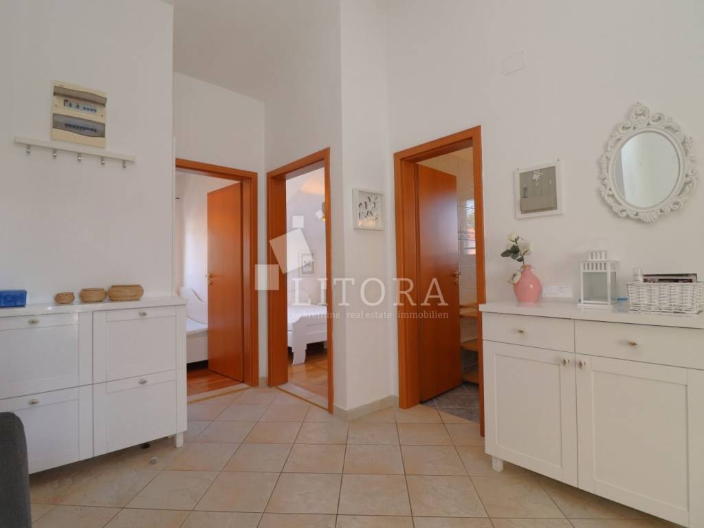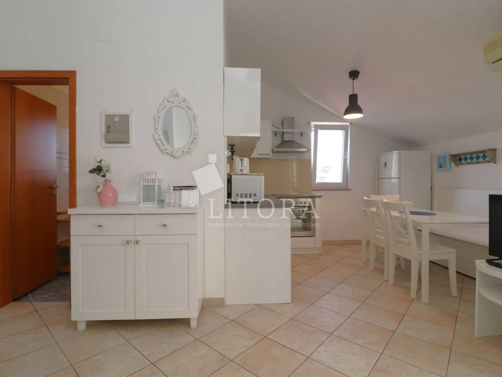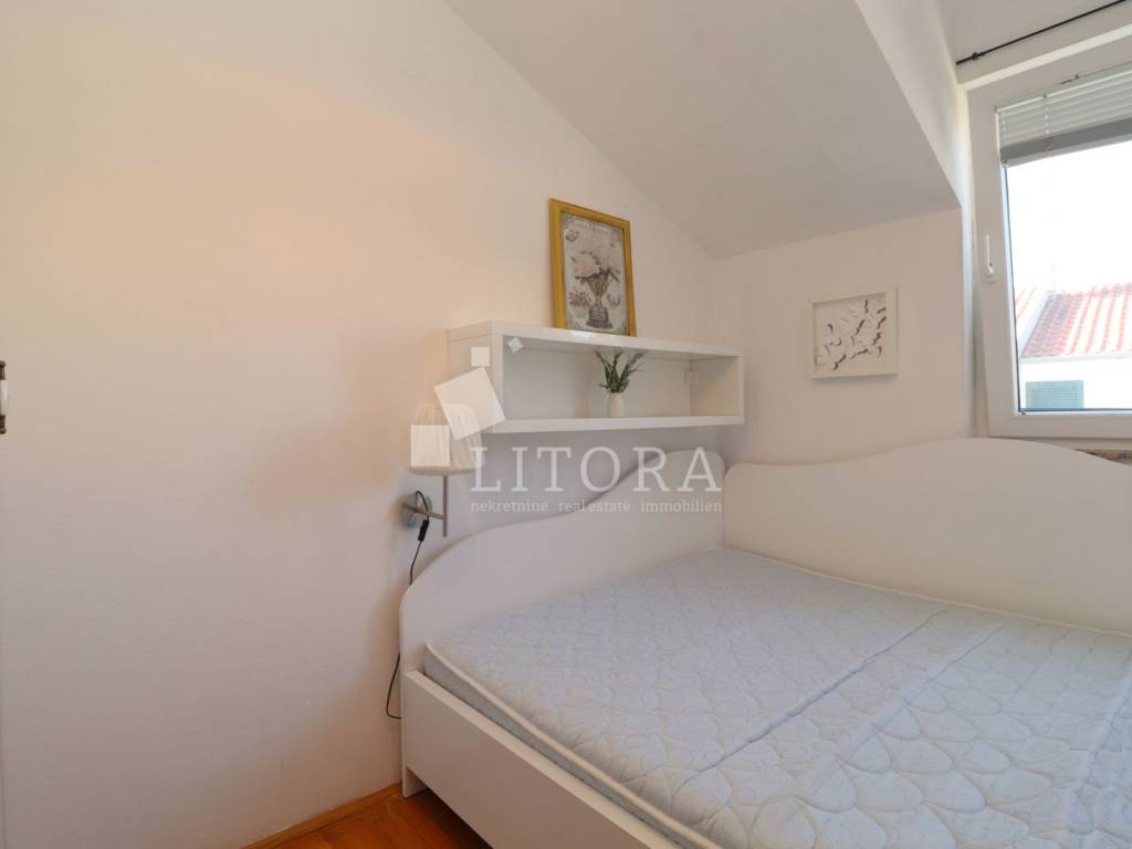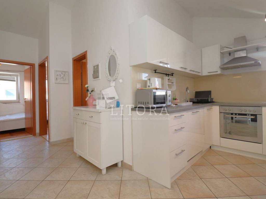 Srima, – only 150 meters from a beautiful sandy beach! A fully furnished two-bedroom apartment with a total area of 53.51 m² is for sale, located in the high attic of a small residential building. The apartment is east-oriented, ensuring plenty of morning sunlight and a pleasant atmosphere throughout the day. It consists of a kitchen connected to the dining area and living room, which opens onto a spacious terrace. The apartment also includes two bedrooms and a bathroom. It is fully equipped and furnished, and is being sold with all furniture and appliances included, allowing immediate move-in without any additional investment. The apartment is equipped with air conditioning (heating/cooling), and two private parking spaces are included in the price. The building is well-maintained, and the location is extremely attractive – in a quiet part of Srima, ideal for family vacations or tourist rentals. The beach is only 120 meters away, while the town center is about 400 meters from the property. Thanks to its proximity to the sea, high level of maintenance, and full furnishings, this apartment represents an excellent opportunity for comfortable living or investment in tourism.