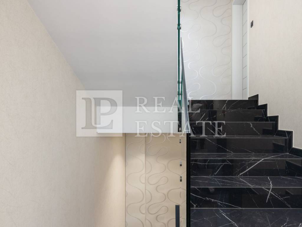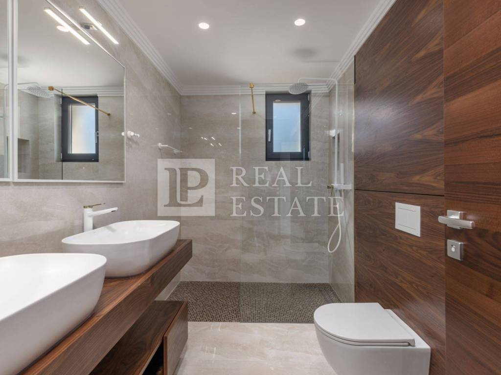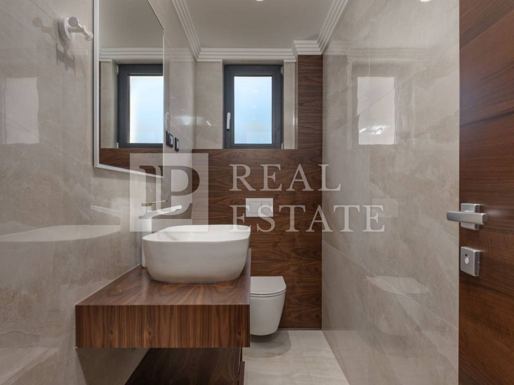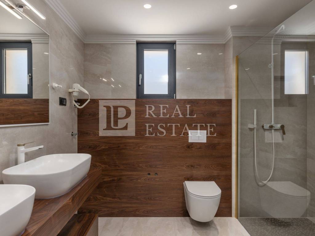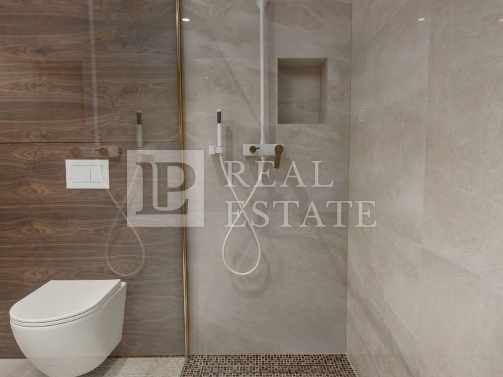 EQUIPMENT AND CONSTRUCTION OF FACILITIES - The building is built of reinforced concrete - The apartments have built-in high-class equipment - Floor heating, cooling with Mitsubishi air conditioners - Exterior carpentry with large sliding walls (liftable and sliding) - The floors are covered with high-quality porcelain ceramics - Dropped ceilings with built-in lighting - Burglar-proof entrance door - Italian manufacturer (Diere) - Room doors made of walnut wood - Italian manufacturer (Diere) - Entrance door to the building from the well-known manufacturer Inoterm - Bathrooms decorated with a combination of wood and ceramics - External facade made of ventilating Roman Travertine stone