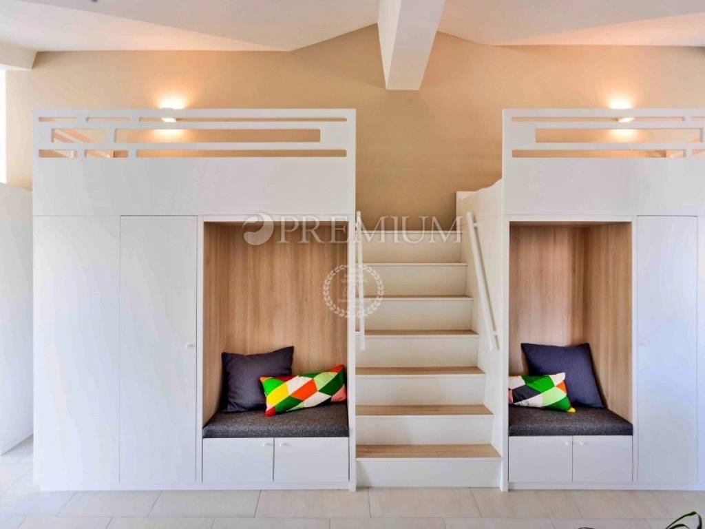 The apartment with a net area of 118m2 consists of an entrance hall, 4 bedrooms, 2 bathrooms, a storage room, a kitchen and dining room with access to the terrace, and a spacious living room that also has access to another terrace. The terraces offer a wonderful sea view