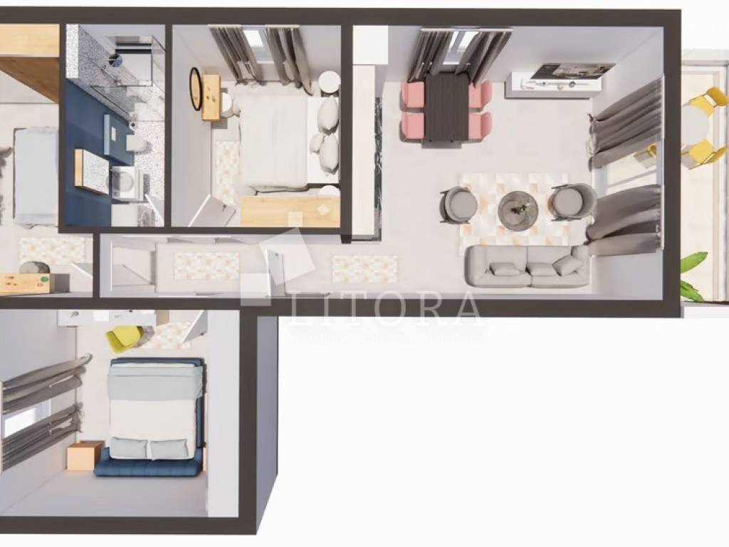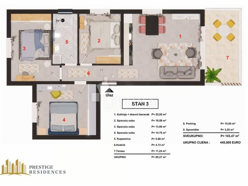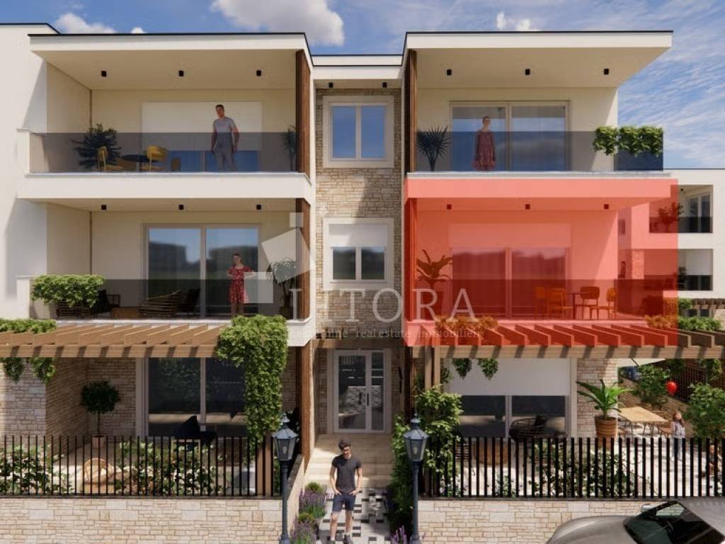rodarica Prestige Residences, an exclusive residential project in close proximity to the sea. Residence 2 – a modern apartment S3 with a total usable area of 89,41 m², located on the first floor of a small residential building. The apartment has an interior area of 74.03 m² and consists of two bedrooms, a bathroom, a kitchen with dining area and access to a terrace of 11.24 m². The property includes a parking space of 16.10 m² and a storage room of 3.20 m². It will be equipped with high-quality premium stone wool insulation, aluminum joinery with insect screens and triple glazing, premium ceramics and sanitaryware, premium three-layer parquet, underfloor heating in the bathroom and living room, and air conditioning units. The courtyard will be landscaped with greenery, a pergola on the terrace, a barbecue, and underground waste containers. Completion and move-in are scheduled for the end of 2026. The distance to the sea/beach is only 80 meters, making this property ideal for a peaceful family life or for tourist rental.