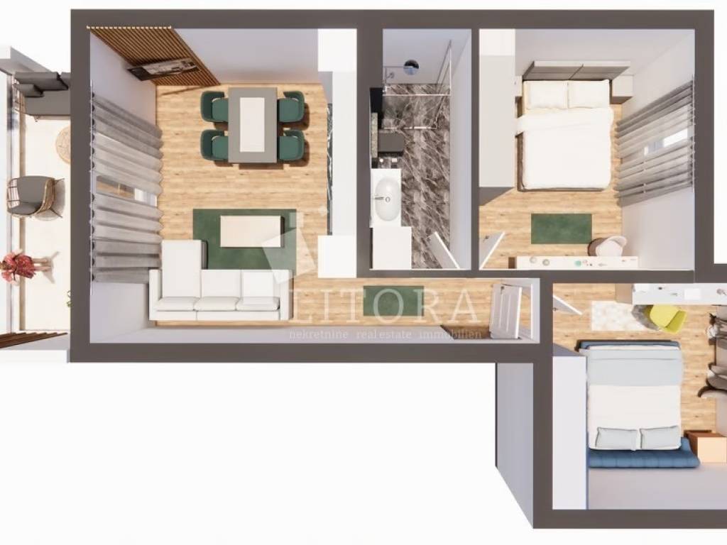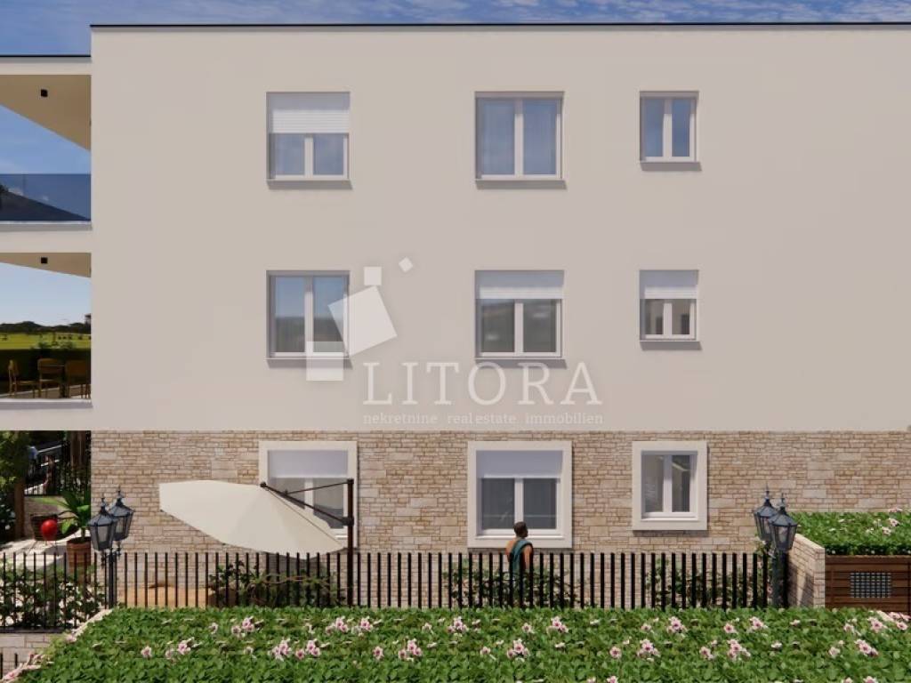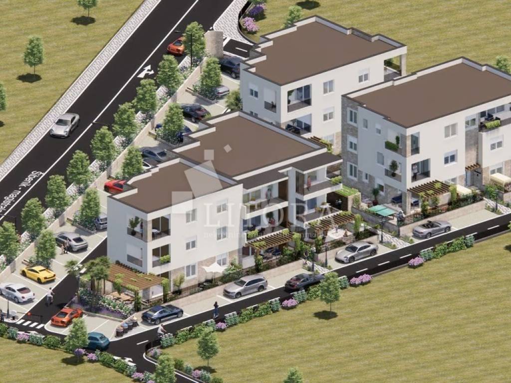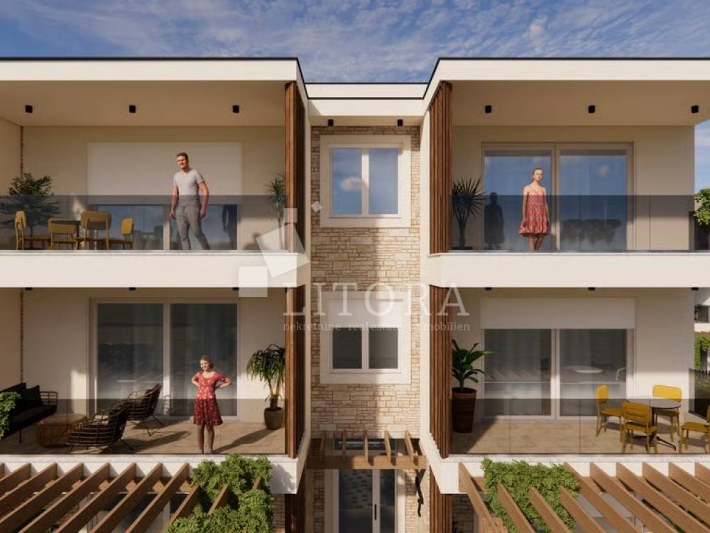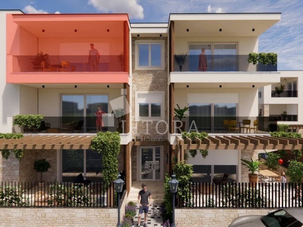 rodarica Prestige Residences, an exclusive residential project in close proximity to the sea. Residence 2 – a modern apartment S6 with a total usable area of 72,85 m², located on the second floor of a small residential building. The apartment has an interior area of 56,79 m² and consists of two bedrooms, a bathroom, a kitchen with dining area and access to a terrace of 12,08 m². The property includes a parking space of 15,20m² and a storage room of 3.20 m². It will be equipped with high-quality premium stone wool insulation, aluminum joinery with insect screens and triple glazing, premium ceramics and sanitaryware, premium three-layer parquet, underfloor heating in the bathroom and living room, and air conditioning units. The courtyard will be landscaped with greenery, a pergola on the terrace, a barbecue, and underground waste containers. Completion and move-in are scheduled for the end of 2026. The distance to the sea/beach is only 80 meters, making this property ideal for a peaceful family life or for tourist rental.