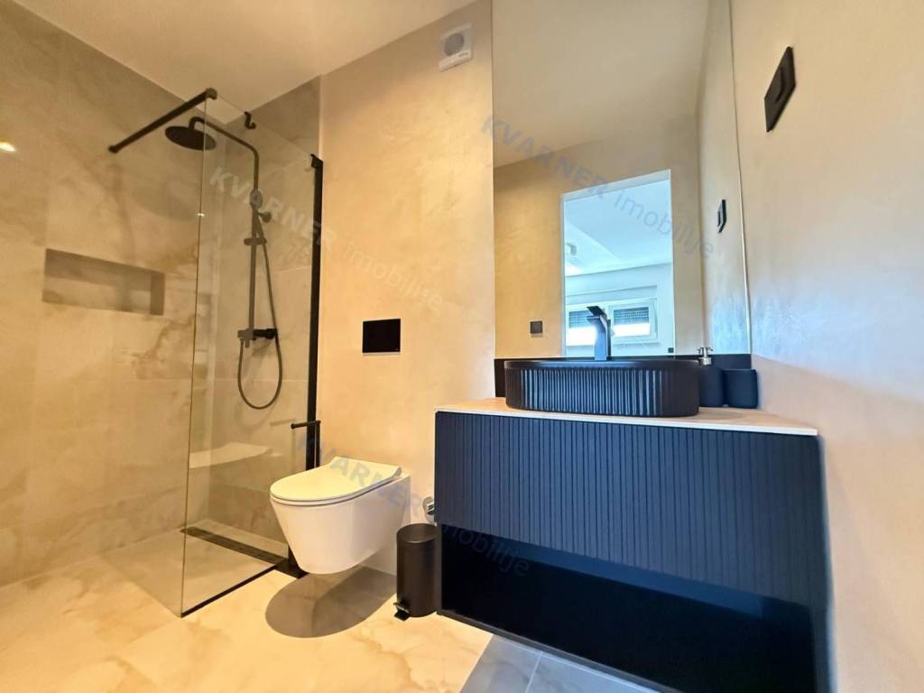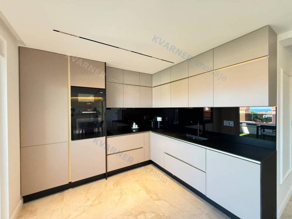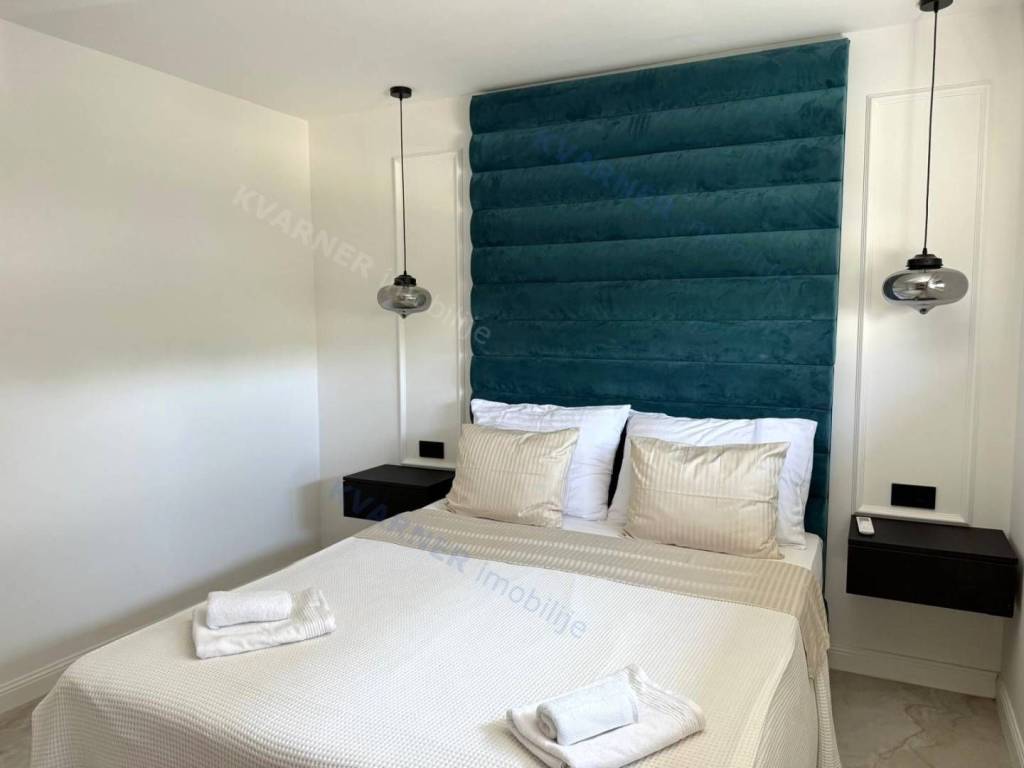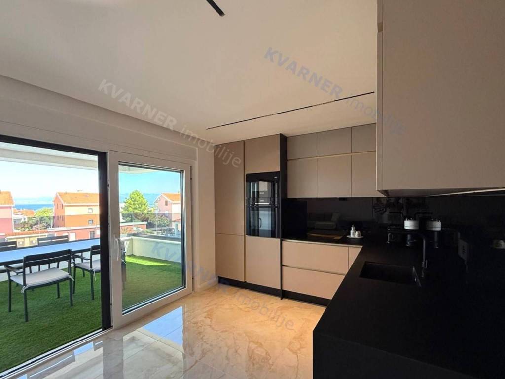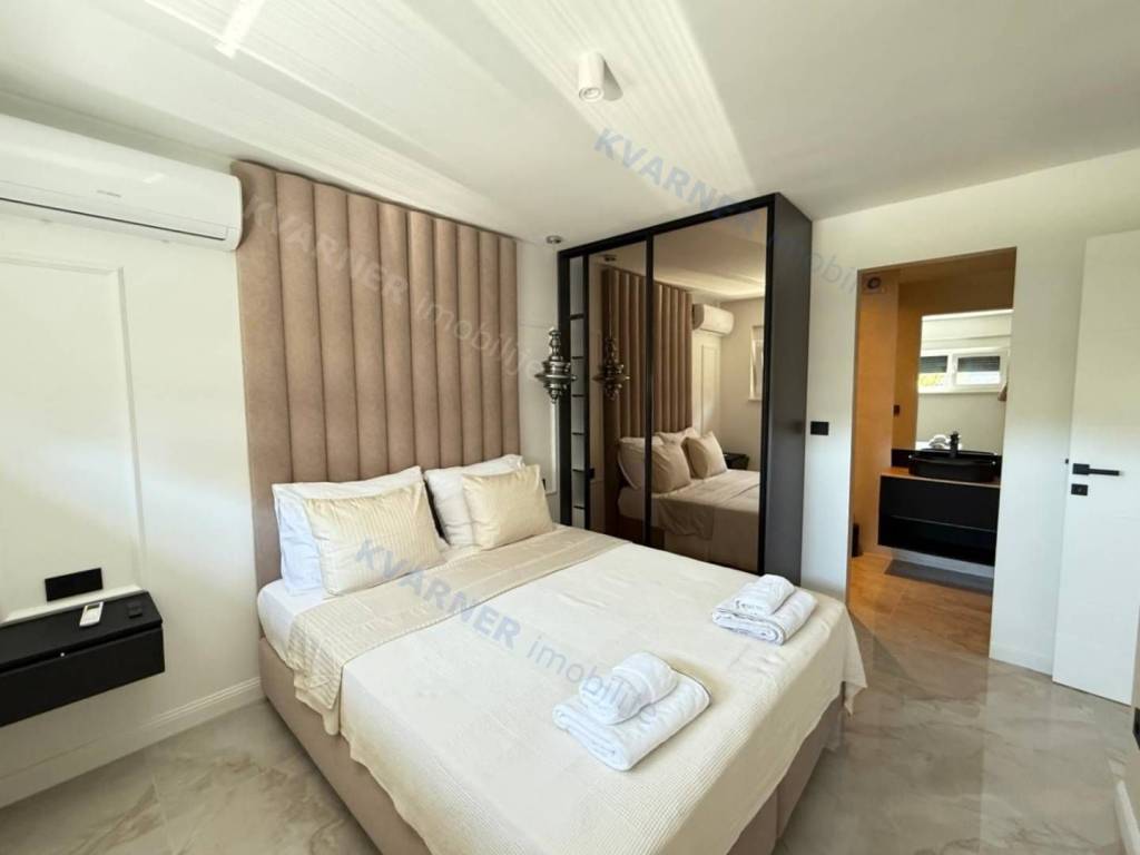 A luxury apartment is for sale in Malinska, located in a quiet area just 800 meters from the sea. This beautiful first-floor apartment consists of an entrance hall, a spacious kitchen with a dining area, and a living room that opens onto a covered terrace with a lovely sea view. The apartment has two comfortable bedrooms and two bathrooms, making it suitable for family living or vacation. The property is sold fully furnished and equipped with high-quality custom-made furniture, offering an elegant and functional space. The apartment features underfloor heating, air conditioning in every room, and quality ceramic floors, ensuring comfortable living all year round. The property also includes a parking space within the building’s courtyard. The apartment is in the VAT system, which means the buyer does not pay real estate transfer tax.