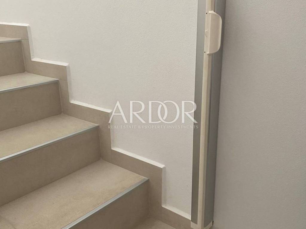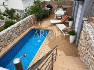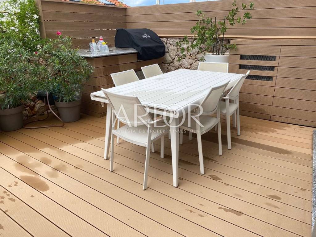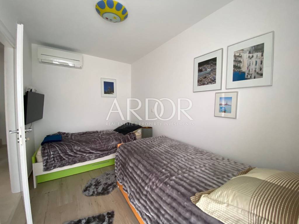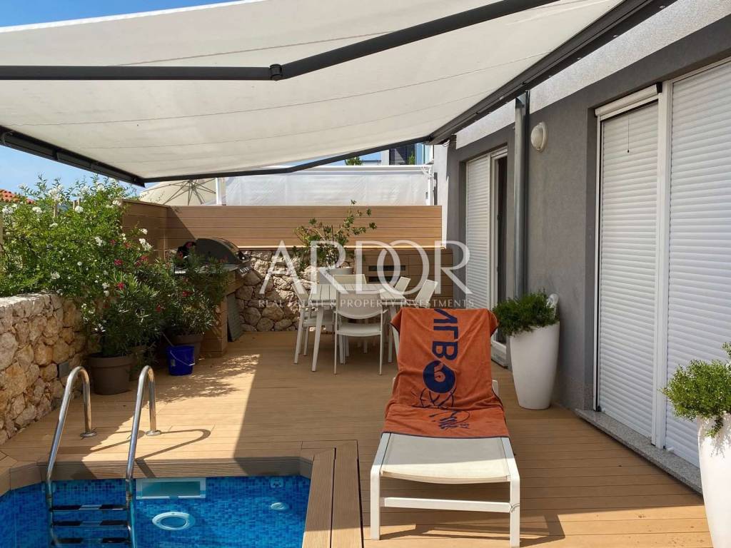 This modern and carefully equipped apartment is spread over two floors - the basement and ground floor. The living space of 71 m² includes an entrance hallway, toilet, spacious living room, kitchen with dining area, and a covered terrace on the upper floor. Internal stairs lead to the basement, where there is a children's room, master bedroom with private bathroom, additional bathroom, hallway, and a small storage room. The basement features access to a yard with a heated pool, summer kitchen, and relaxation area. The terrace is equipped with an electrically operated awning, ensuring a pleasant stay at any time. The terrace offers a stunning sea view.