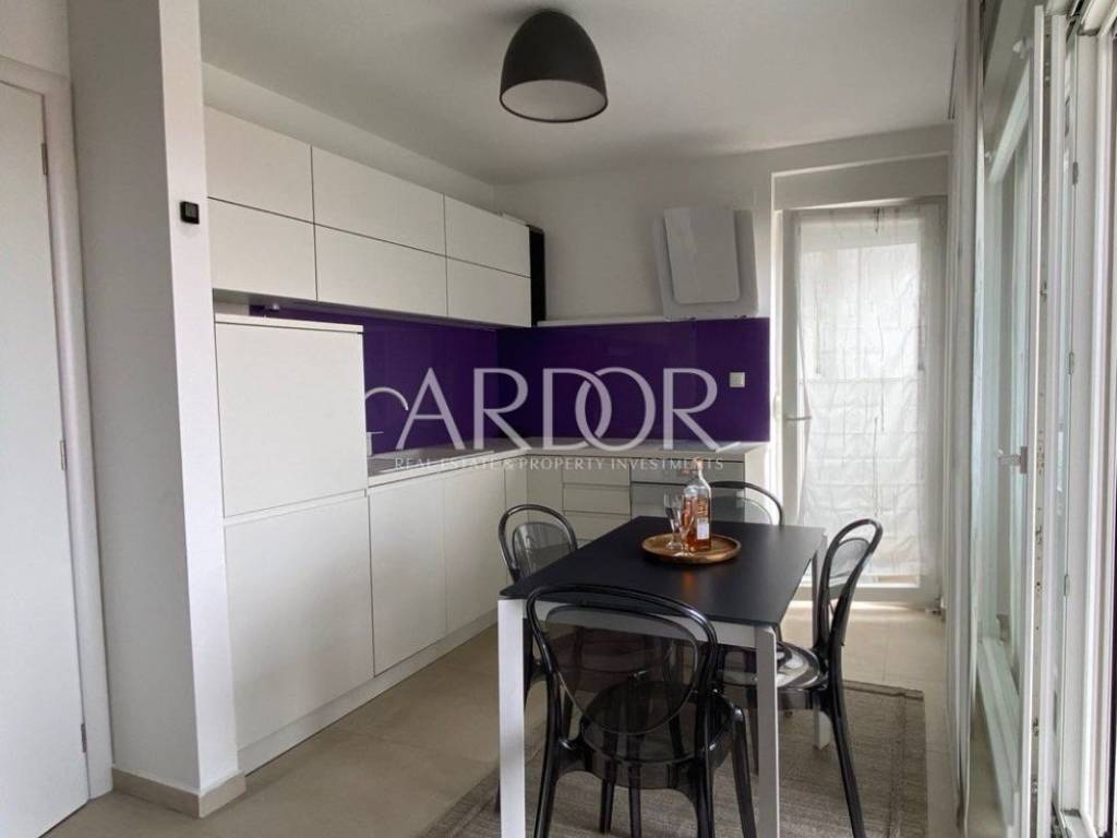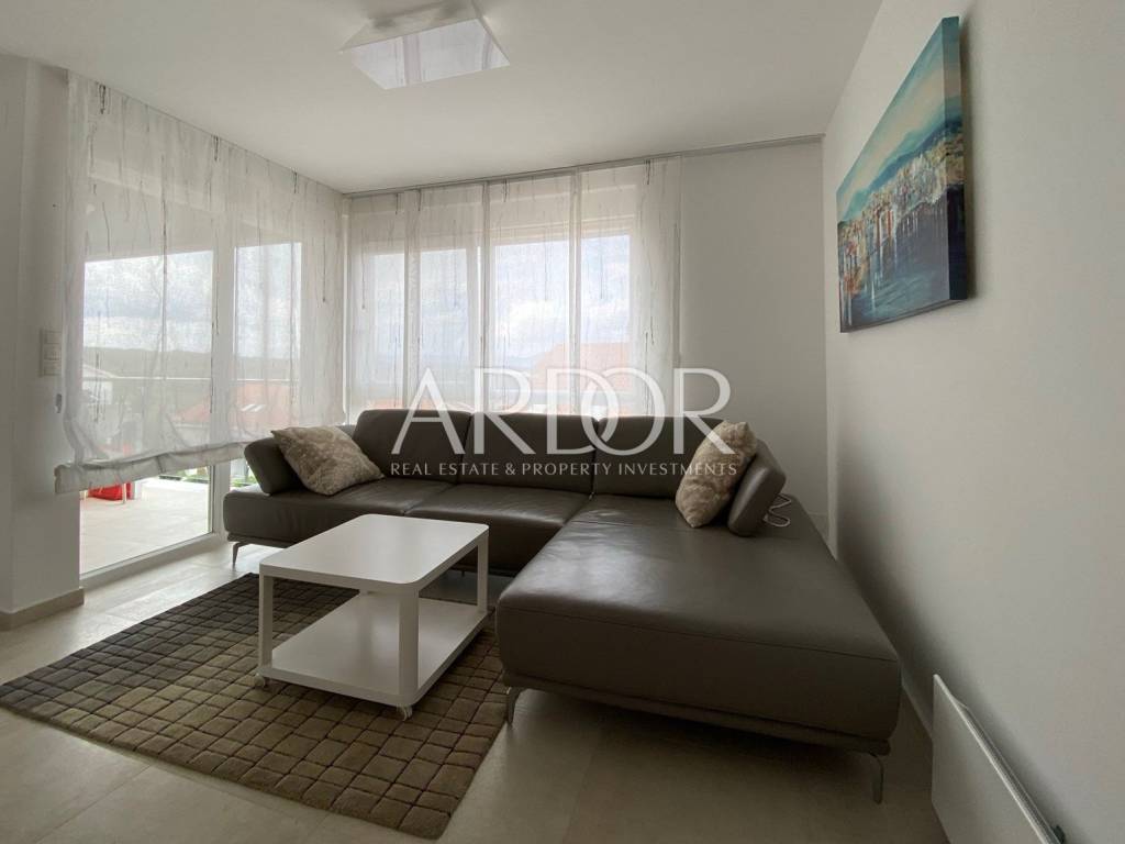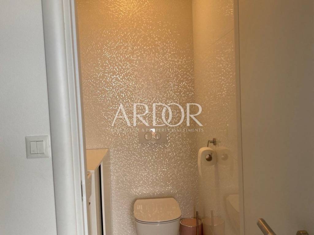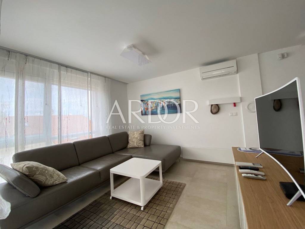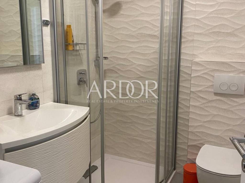 This modern and carefully equipped apartment is spread over two floors - the basement and ground floor. The living space of 71 m² includes an entrance hallway, toilet, spacious living room, kitchen with dining area, and a covered terrace on the upper floor. Internal stairs lead to the basement, where there is a children's room, master bedroom with private bathroom, additional bathroom, hallway, and a small storage room. The basement features access to a yard with a heated pool, summer kitchen, and relaxation area. The terrace is equipped with an electrically operated awning, ensuring a pleasant stay at any time. The terrace offers a stunning sea view.