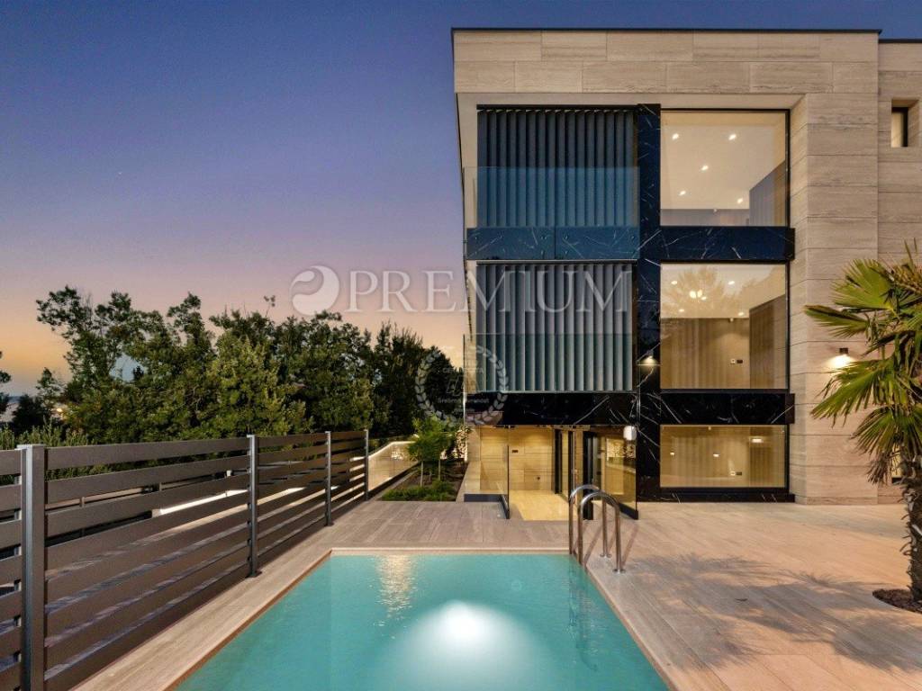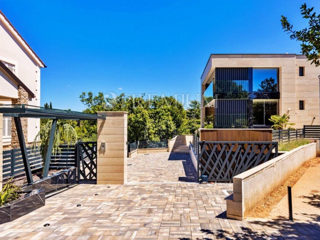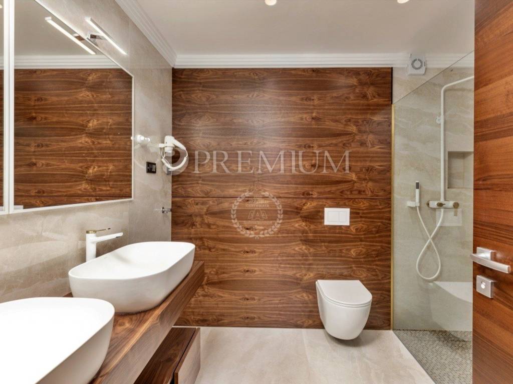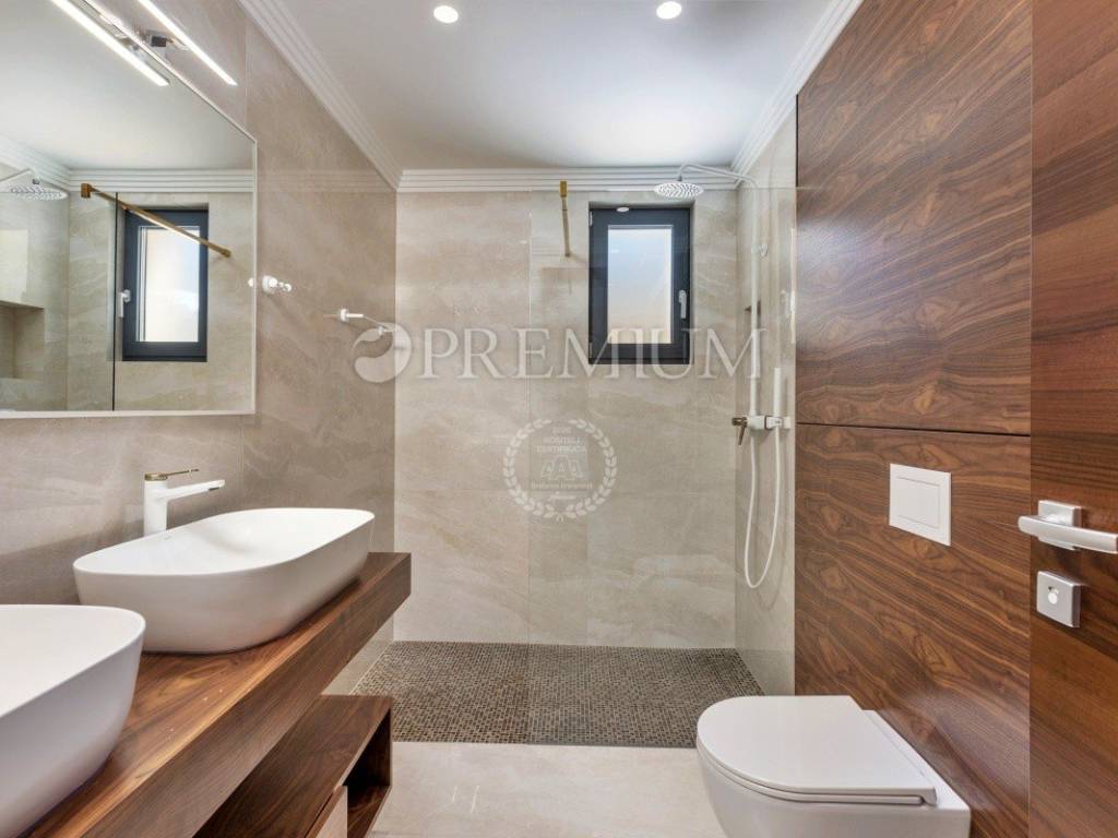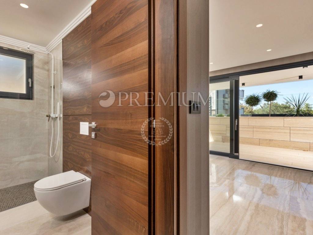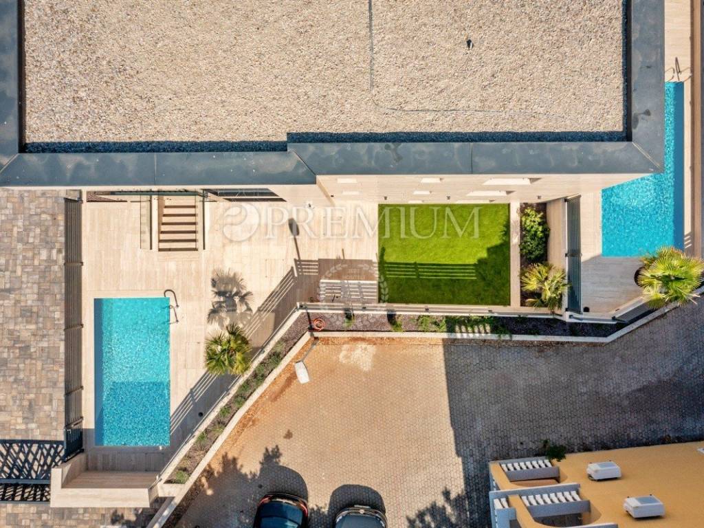 Modern ground floor apartment in a luxury new building in Malinska, in a prime location only 300 meters from the beach. Apartment size: 114 m² (net), garden 102 m² with a 15 m² pool and sun deck, covered terrace 27 m², three bedrooms (master bedroom with en-suite bathroom), two modern bathrooms + guest toilet, one parking space.