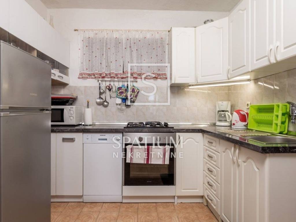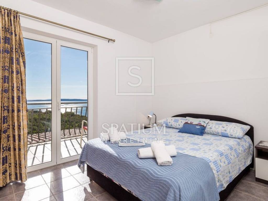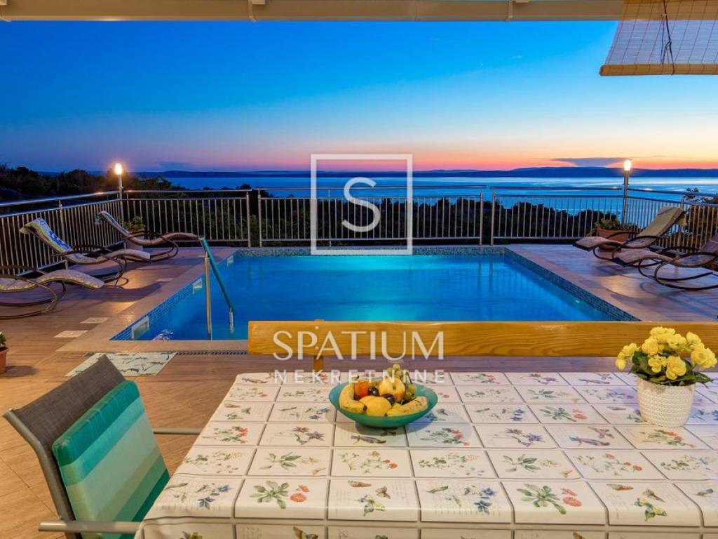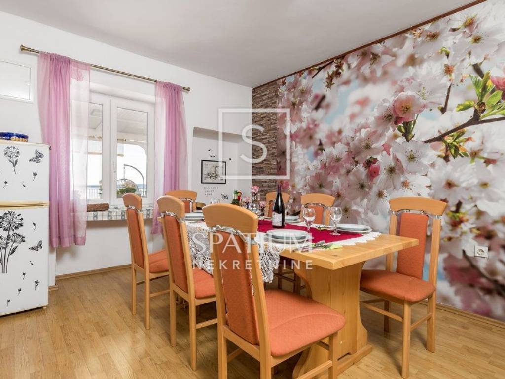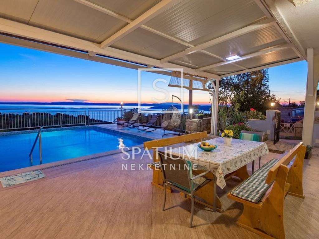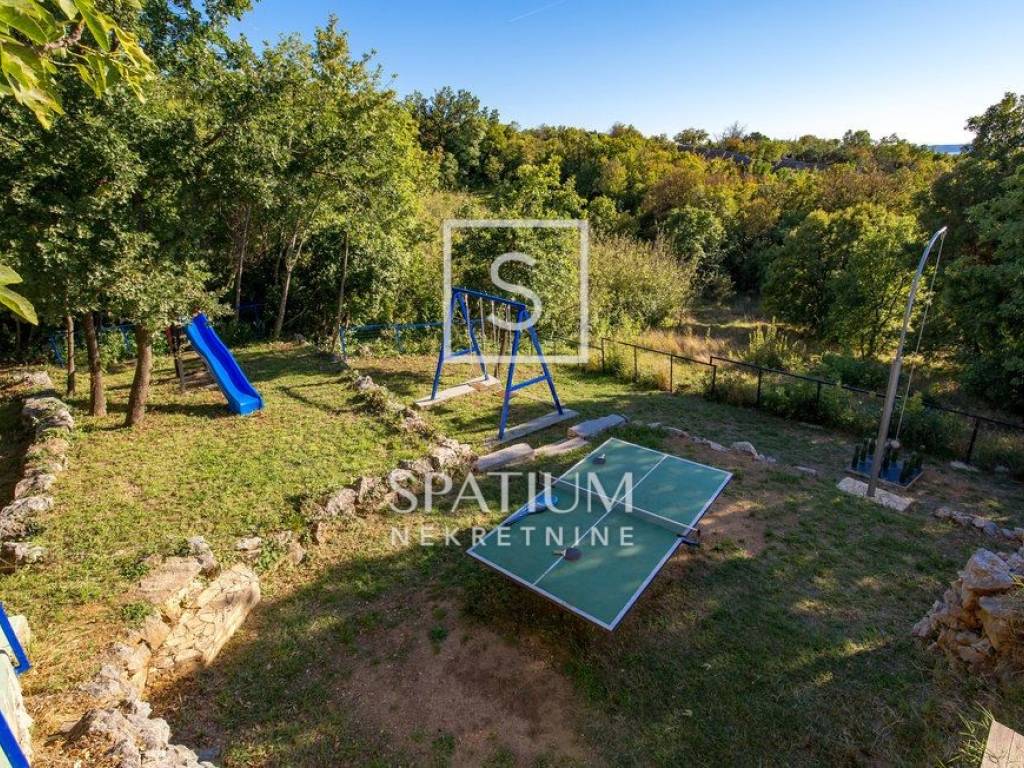 SENJ, JABLANAC, we offer a detached house with a swimming pool and a sea view. Living area 122m2, consists of a ground floor and an upper floor. Ground floor: kitchen with dining area, living room with access to a covered terrace with a swimming pool (29 m2) and a sundeck, bedroom and bathroom. Upper floor: four bedrooms and two bathrooms. Quiet location, panoramic sea view, garden with space for socializing, playground and parking. The property is fully furnished and ready to use. Excellent investment in tourism or a house for family stay.