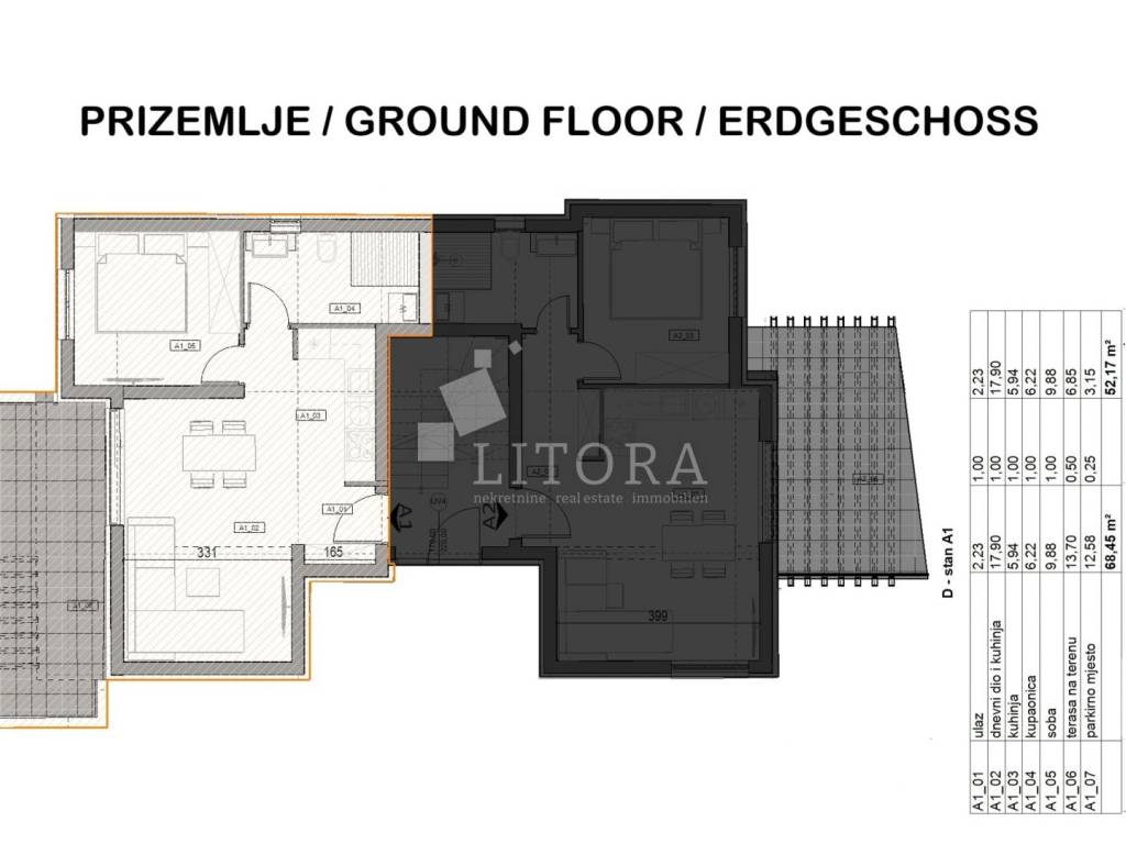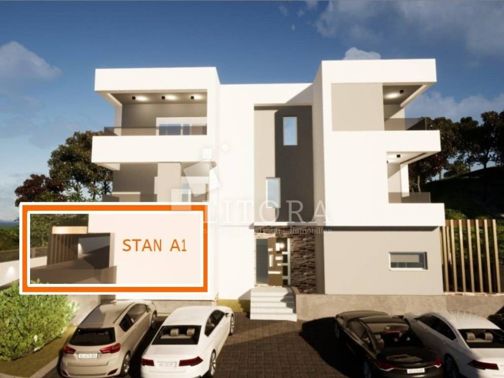 Žaborić – Newly Built Apartment with Sea View, 450m from the beach. This newly built apartment offers 52,17 m² of usable living space and is located on the ground floor in a small residential building. It is situated on the south-west side, providing a beautiful sea view. The layout includes a hallway, bathroom, bedroom, and an open-plan living room with a dining area and kitchen, which opens onto an covered terrace of 13,70 m². The apartment is equipped with security doors, air conditioning in each room, electric shutters, and mosquito nets. It also comes with one outdoor parking space. The apartment is located just 450 meters from both the beach and the town center.