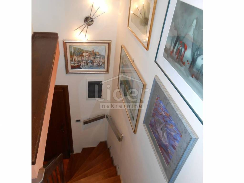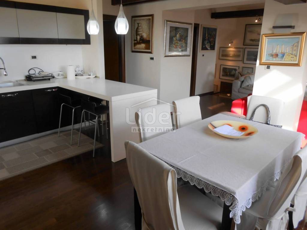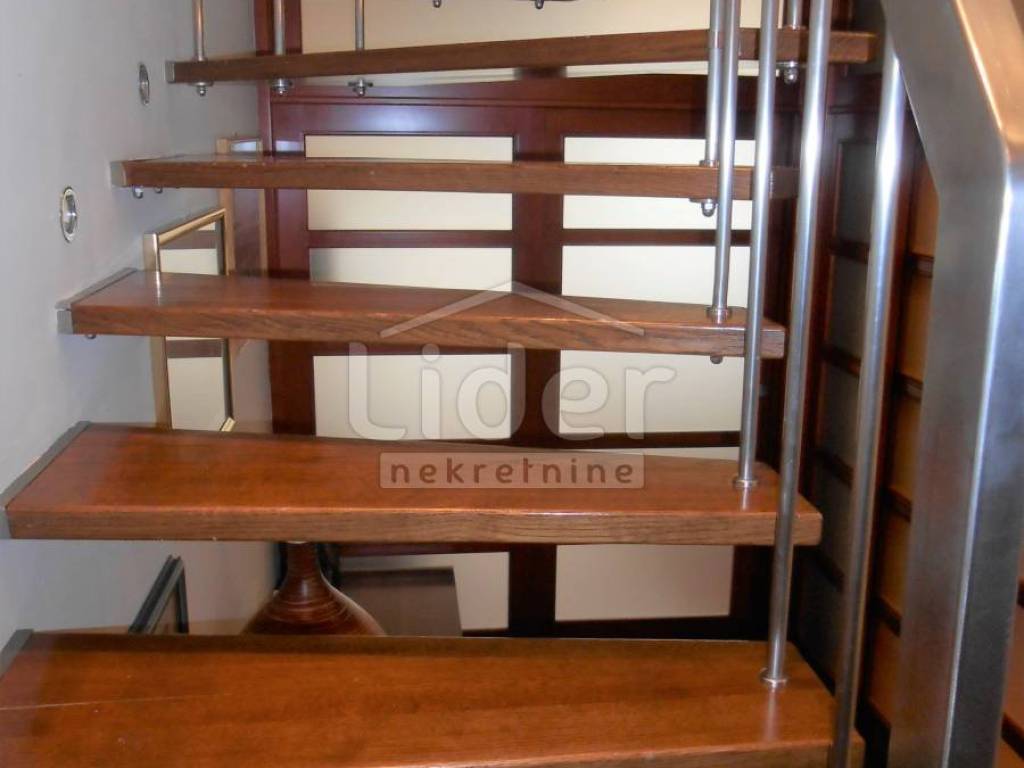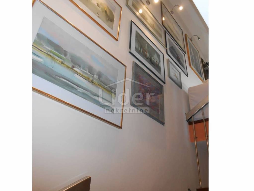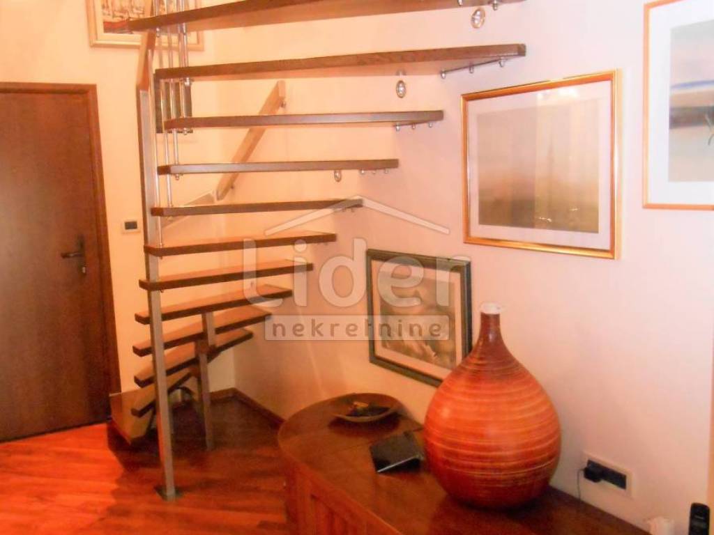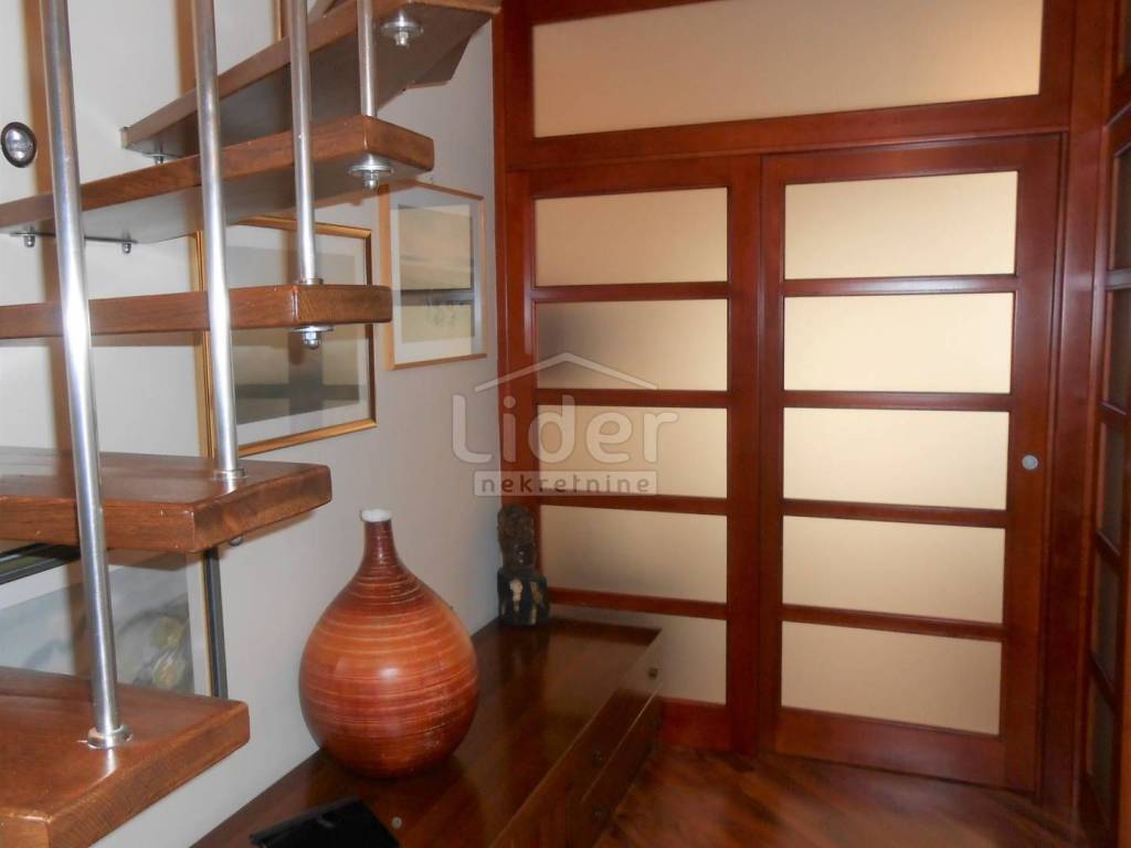 KOZALA Luxurious two-storey apartment in a unique location, just 2 km from the city center and close to a large park, with unobstructed sea views in a regularly maintained residential building of high construction quality. The apartment has a total of 121 m2 of living space spread over two exclusively furnished floors. On the first floor of 38 m2 there is currently a spacious bedroom with access to the loggia, a closet of 10 m2 and a bathroom with a hydromassage shower cabin. According to the project, this floor was built as a studio apartment, so the installations for the kitchen have already been carried out, but are currently not in operation. A beautiful, specially designed staircase made of a combination of solid wood and chrome fittings leads to the second floor of 83 m2, where there is an open, bright space with a spacious living room, dining room and kitchen, a bedroom and a large bathroom. This luxuriously furnished apartment is being sold fully furnished and equipped to a high standard. Almost all the furniture is made to measure from solid wood. Excellent thermal insulation and quality of skylights installed. The apartment also has a woodshed and two parking spaces. Extremely quiet environment. Ready to move into immediately.