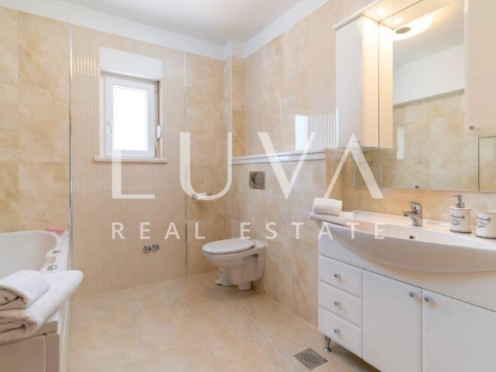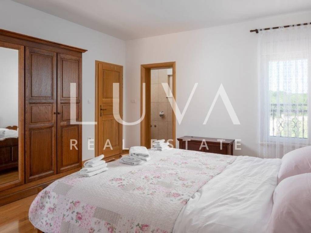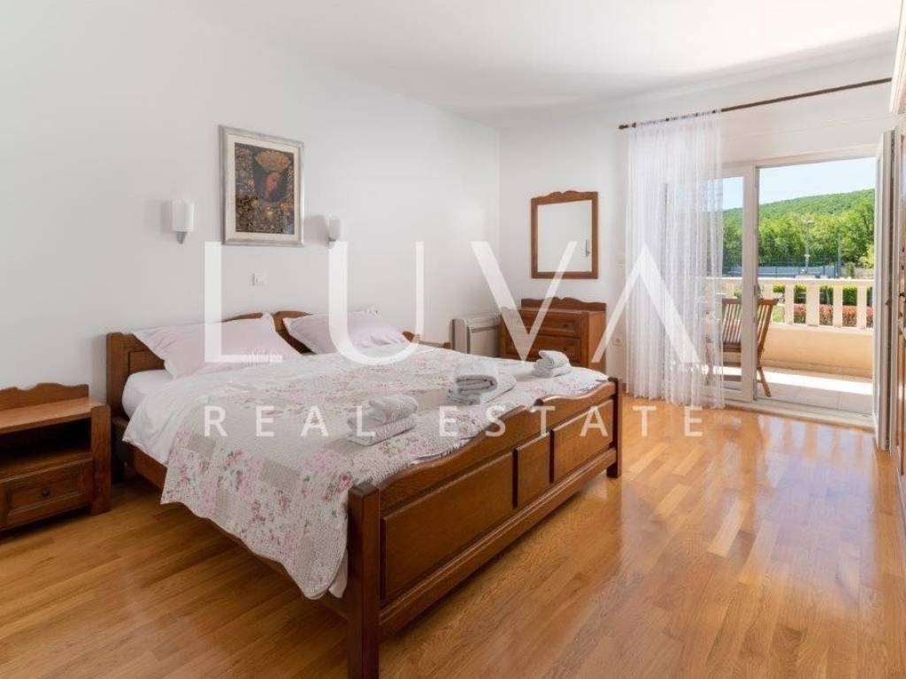 A holiday house is for sale, located on a large estate in Dicmo. Dicmo is a charming village in the Dalmatian hinterland, well connected to Split and just a few minutes' drive from the highway. The house is situated on an exceptionally large estate of 13,092 m², fully fenced, ensuring peace and privacy for its residents. Built in 2014, the house has a surface area of 270 m² and spans 3 floors. It features 6 bedrooms, 4 bathrooms, and 2 toilets. In front of the house, there is a large outdoor pool and a covered terrace with a dining table, while the back of the house provides ample parking space and a garage for 2 cars. In front of the pool, there is also a tennis court, and the estate has enough space for additional playgrounds, making it ideal for sports enthusiasts.