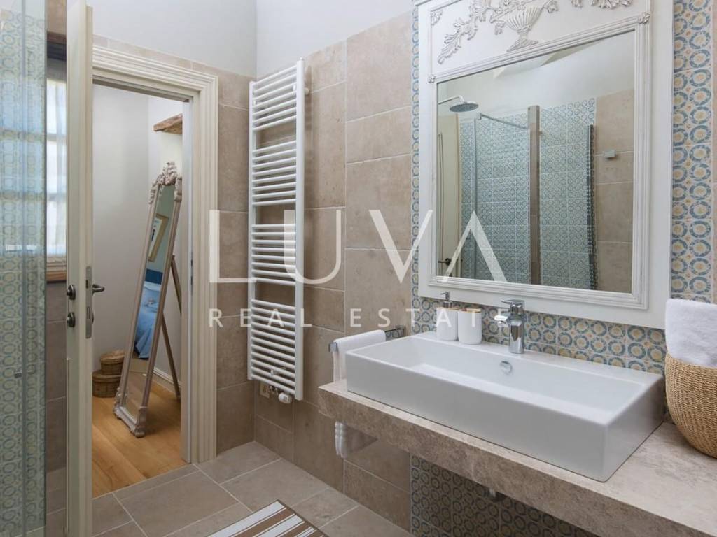 An exclusive villa with a pool is for sale in the quiet village of Ladići, near Kanfanar. Kanfanar is well-connected by the Istrian highway, and the famous town of Rovinj is nearby. This luxurious villa, built in 2016, spans 353 m² over 2 floors. Constructed in traditional Istrian stone style with a sloped tiled roof, the villa features a charming interior with stone walls, wooden beams, and rustic wooden furniture. The ground floor includes a spacious living room with a fireplace, a fully equipped kitchen with designer appliances, and a large dining table. Outside, there’s a pool, a covered terrace with a grill, and an outdoor dining area. The villa has 4 bedrooms, each with its own bathroom, and is being sold fully furnished and equipped. It has been successfully rented as a tourist property for several years, and additional sister villas are also for sale, offering a great investment opportunity in Croatian tourism.