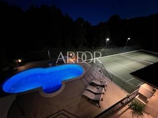 There is a swimming pool with a sunbathing area in the garden, and there is a tennis court right next to the pool, and above the pool there is a large terrace with a beautifully decorated gazebo.