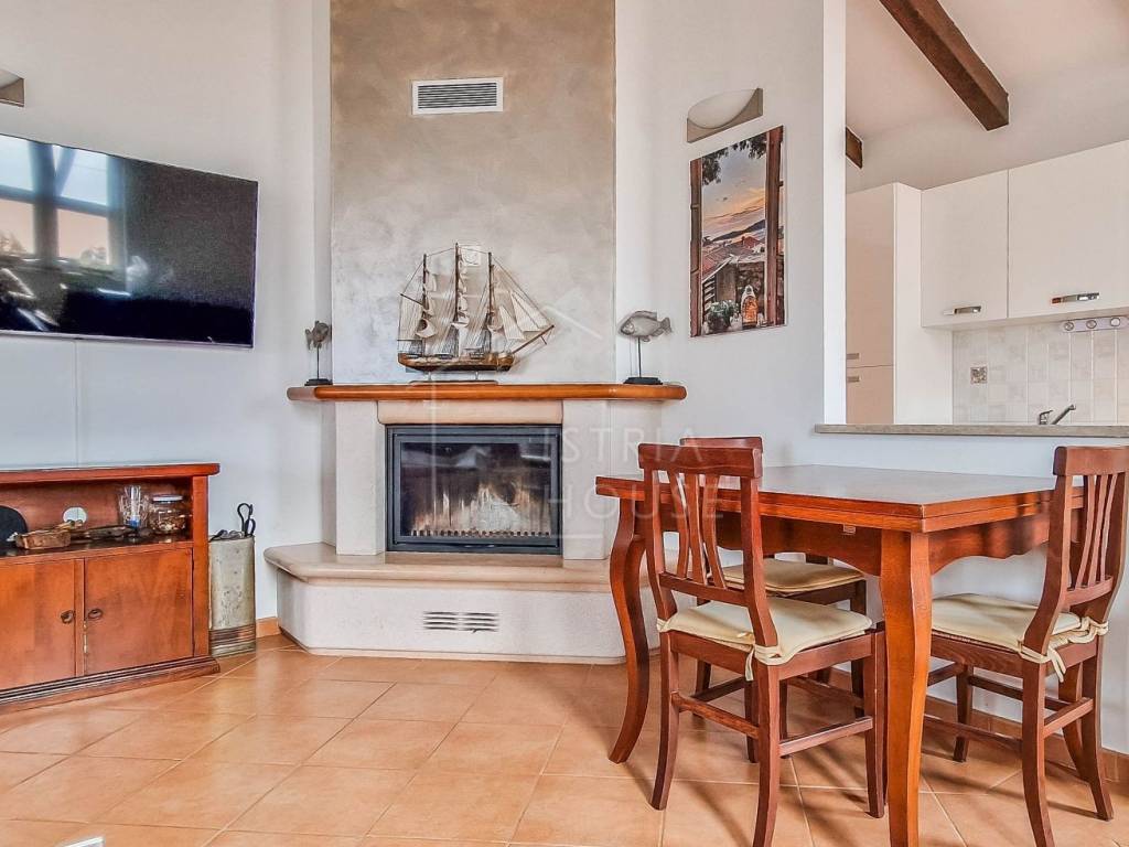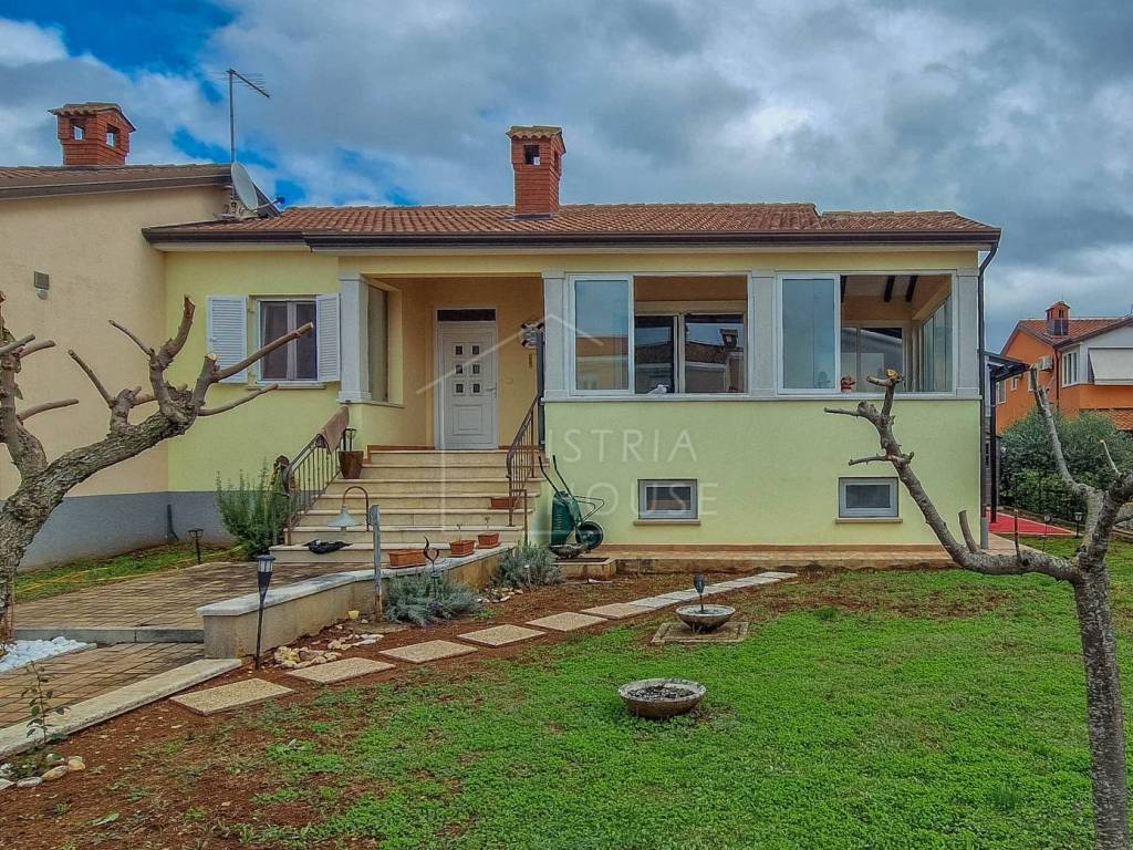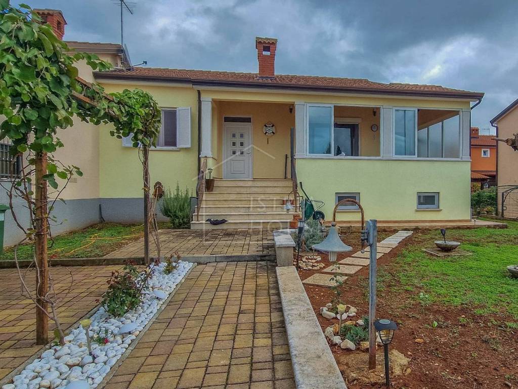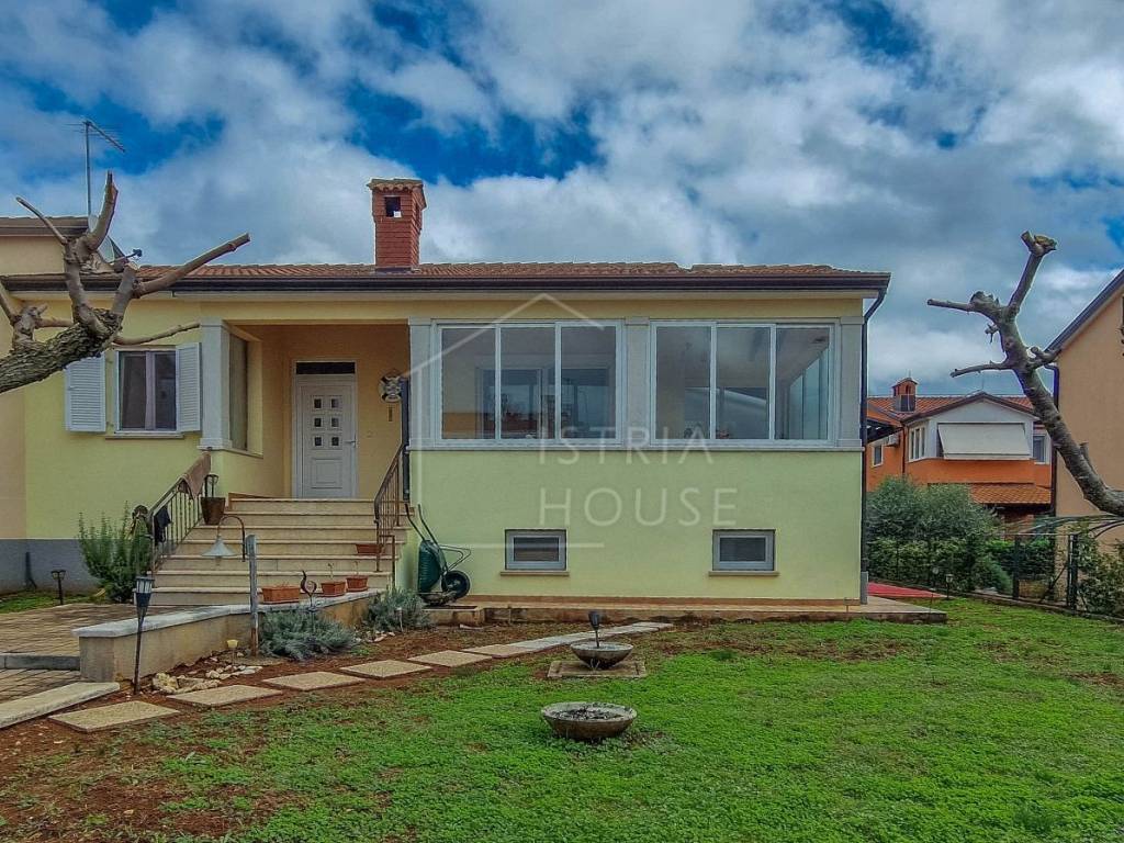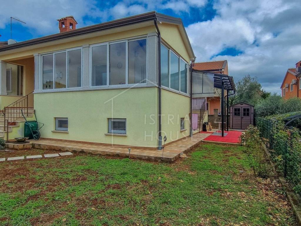 Attractive semi-detached house for sale near Poreč with sea view. The house consists of 2 bedrooms, 2 bathrooms and a spacious living room. Heating is provided by air conditioning and central heating with wood. In the basement there is an additional residential unit - a studio with a kitchen and a fireplace, ideal for guests or rental. The house has its own parking lot, yard and garden house.