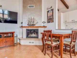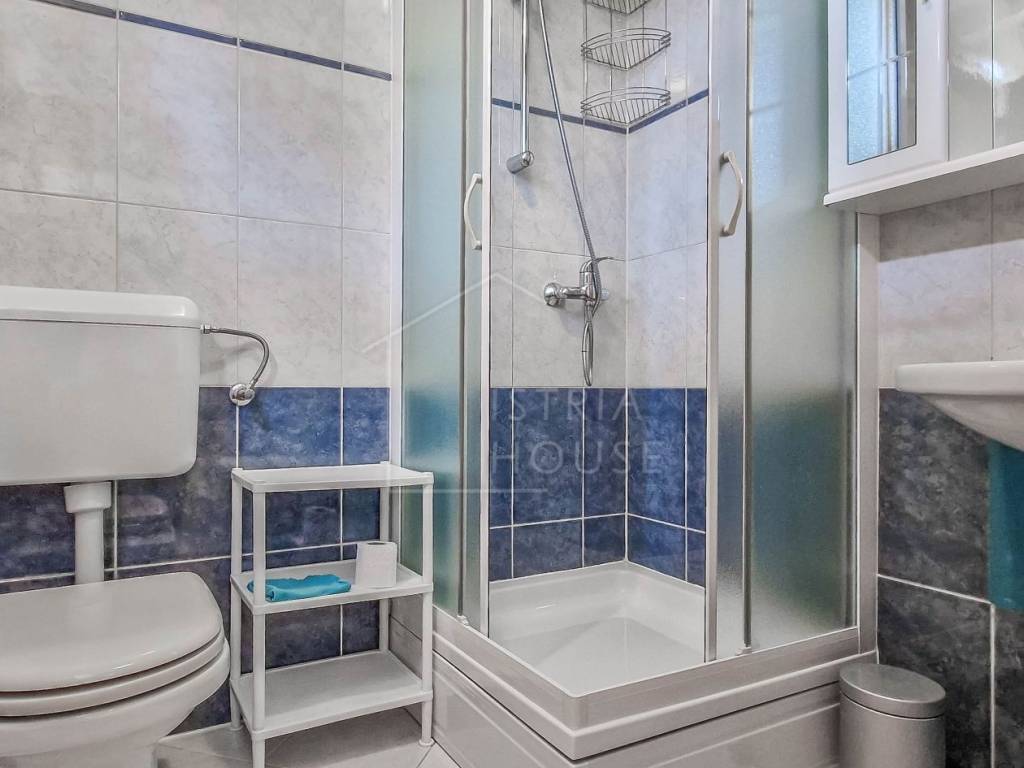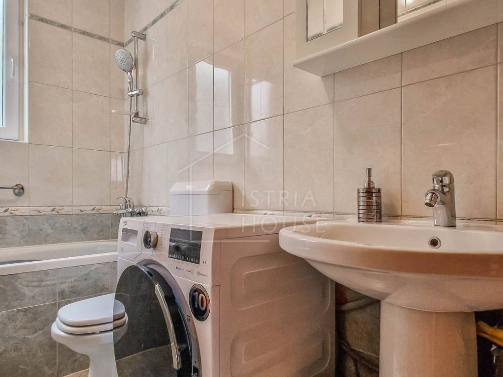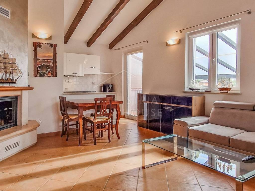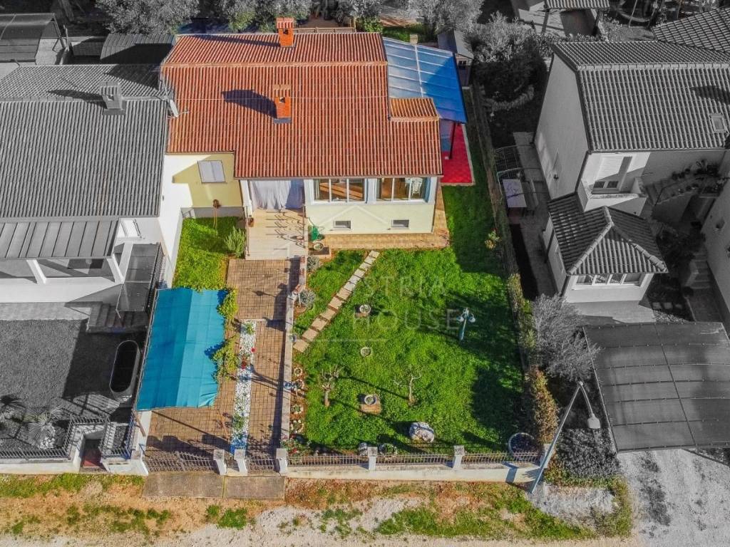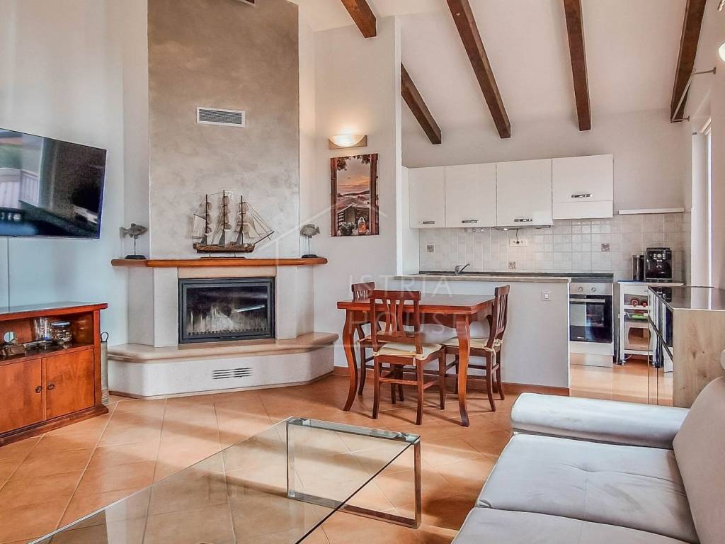 Attractive semi-detached house for sale near Poreč with sea view. The house consists of 2 bedrooms, 2 bathrooms and a spacious living room. Heating is provided by air conditioning and central heating with wood. In the basement there is an additional residential unit - a studio with a kitchen and a fireplace, ideal for guests or rental. The house has its own parking lot, yard and garden house.