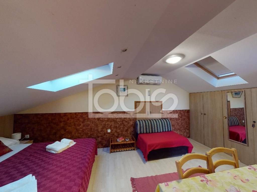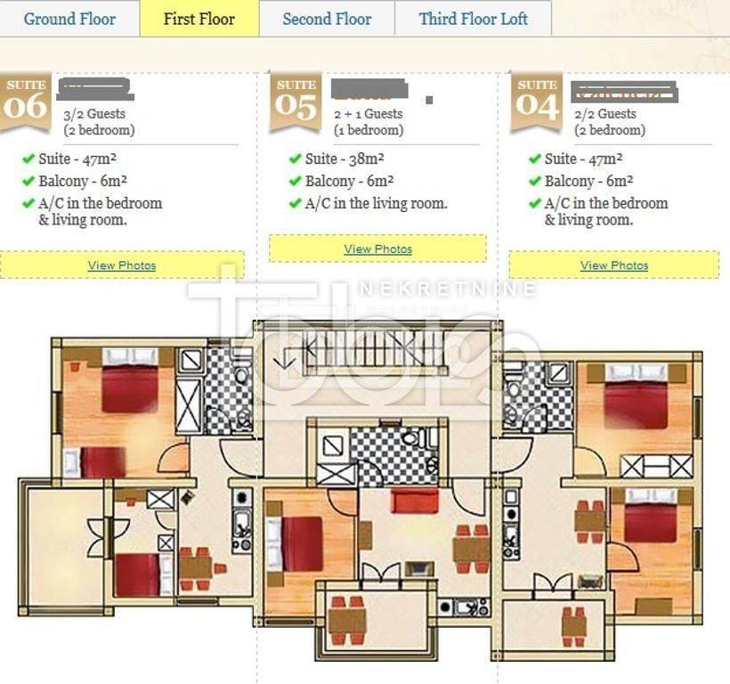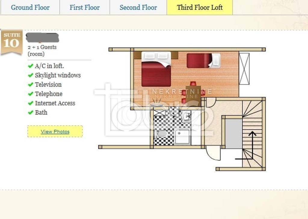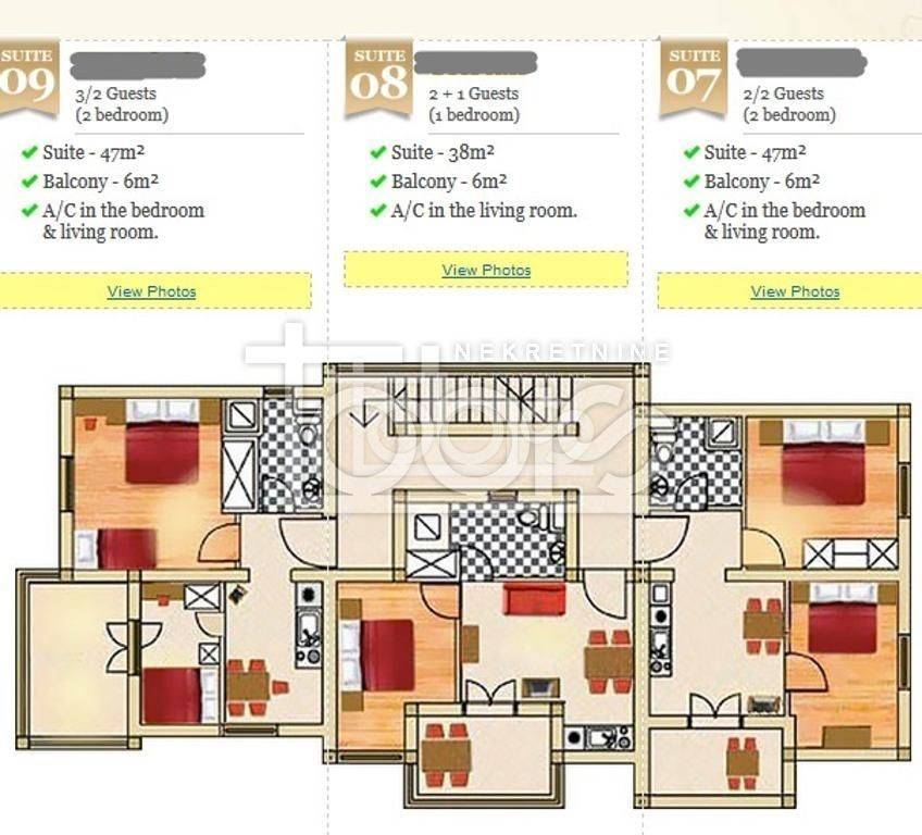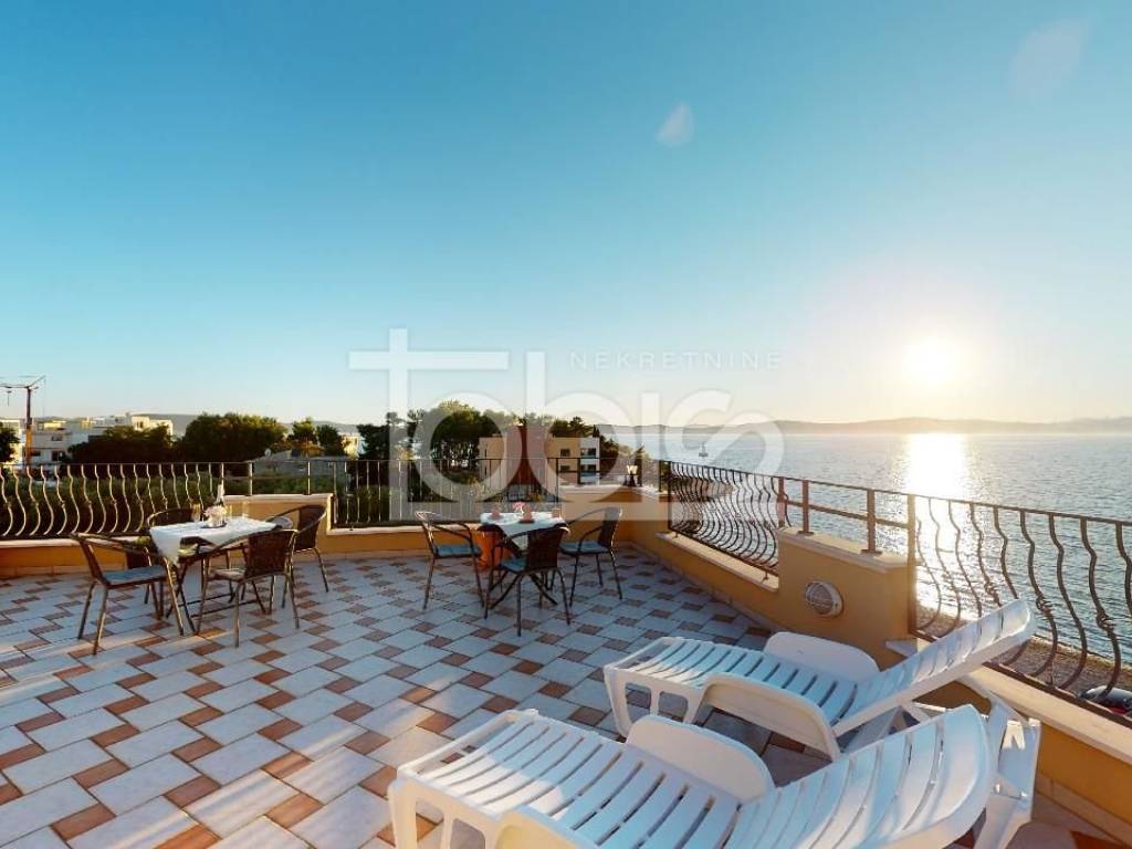 A family hotel is for sale in Sukošan, located only 20 meters from the beach, in a quiet location near all important facilities (center of Sukošan, airport, Zadar...). This accommodation facility consists of a tavern/restaurant in the basement, and apartment accommodation units on the ground floor, two floors and an attic with a large roof terrace offering a wonderful view of the open sea as well as the nearby islands of the Zadar archipelago.