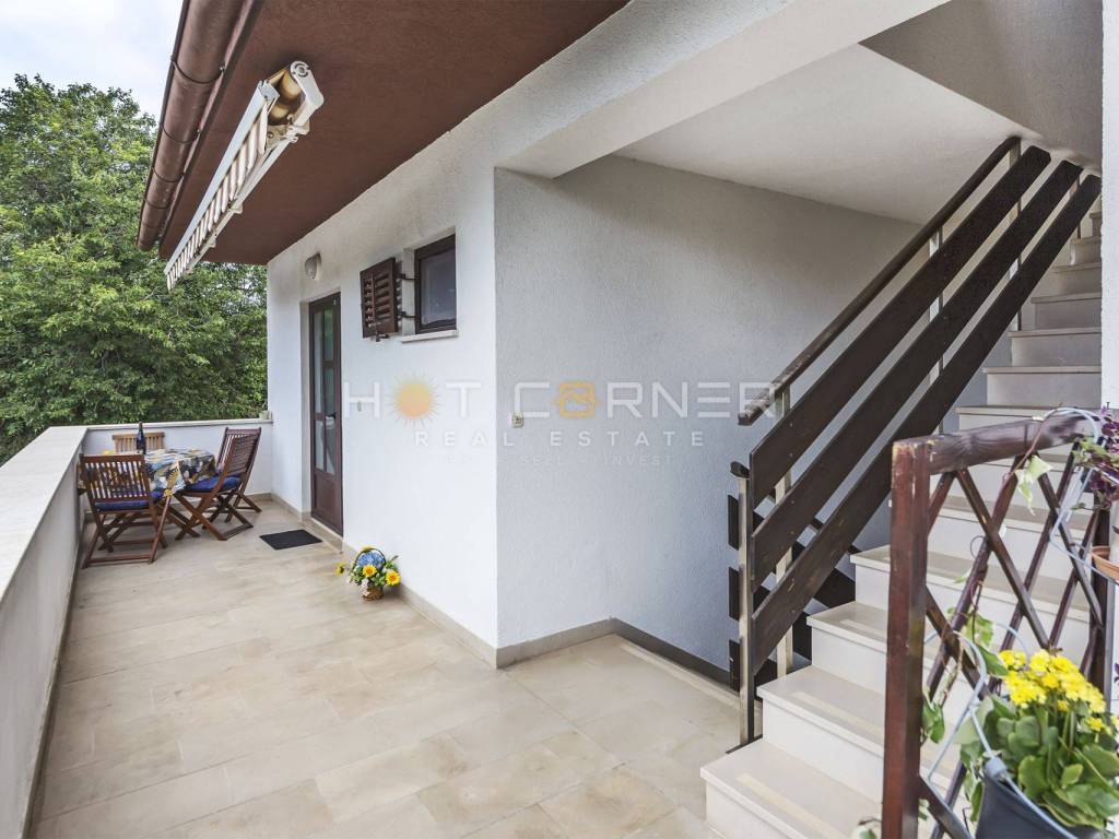 The house is situated on a plot of land with an area of 1250 m2. This detached house was built in the 1990s and consists of a basement, ground floor, first floor, and attic. In reality, there are 6 apartments built (one in the basement and attic, two on the ground floor, and two on the first floor). The floors are connected by an external staircase. You can see the sea from the terrace on the top floor.