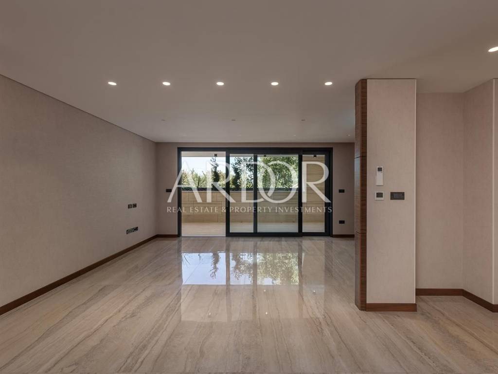 Additional highlights include large lift-and-slide windows, ceramic flooring, Dierre interior and exterior doors, and an exterior façade made of ventilated Roman travertine stone. The apartment includes two secured outdoor parking spaces with an electric car charger.